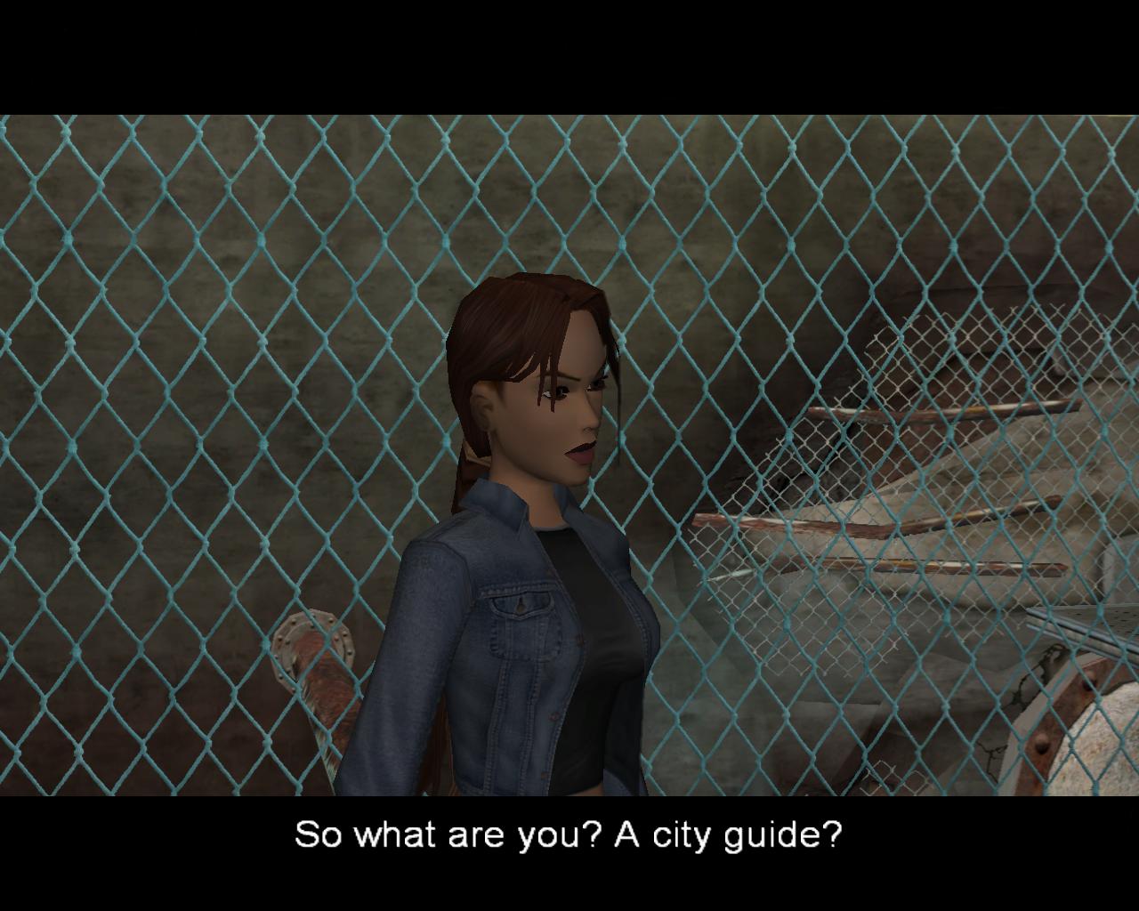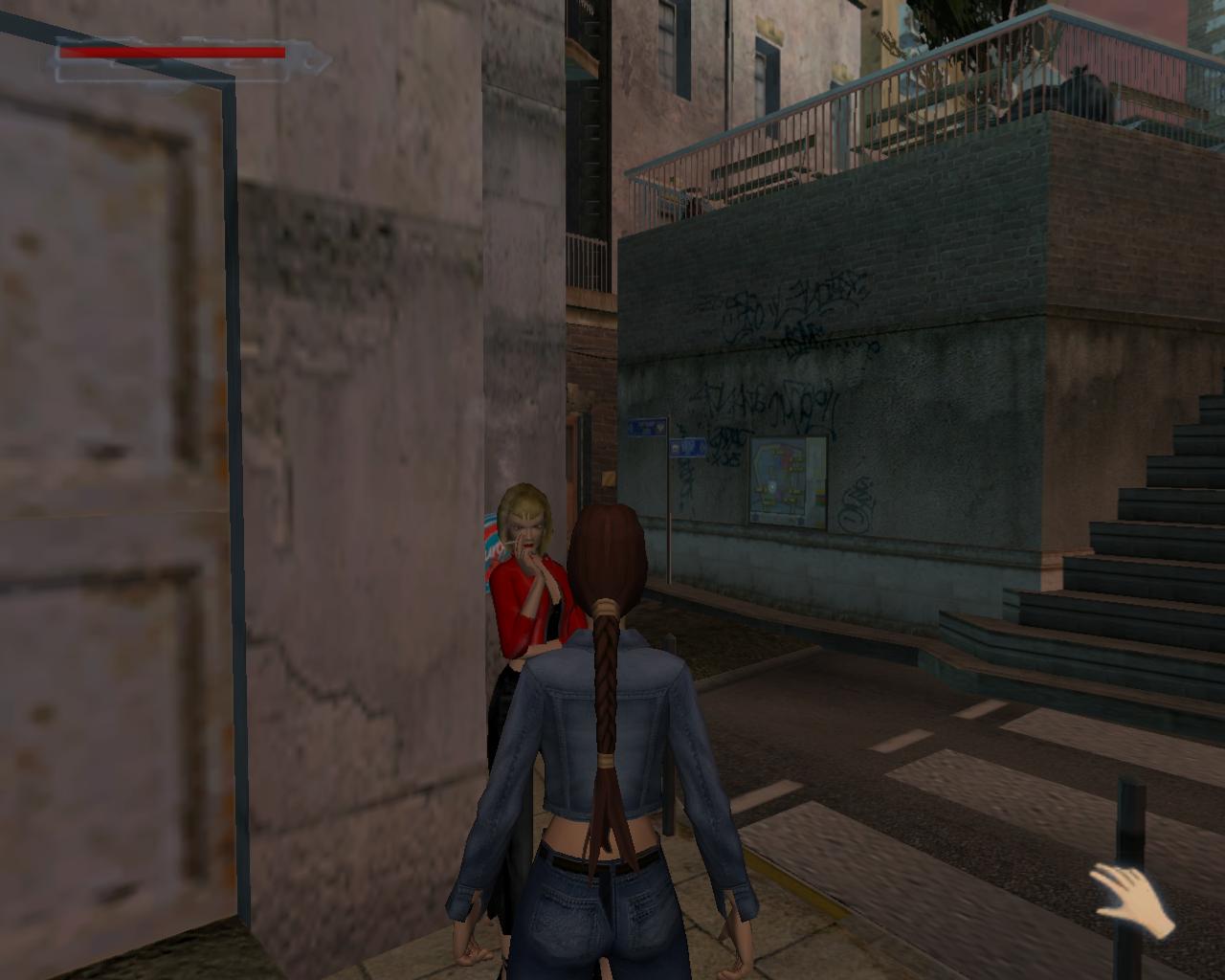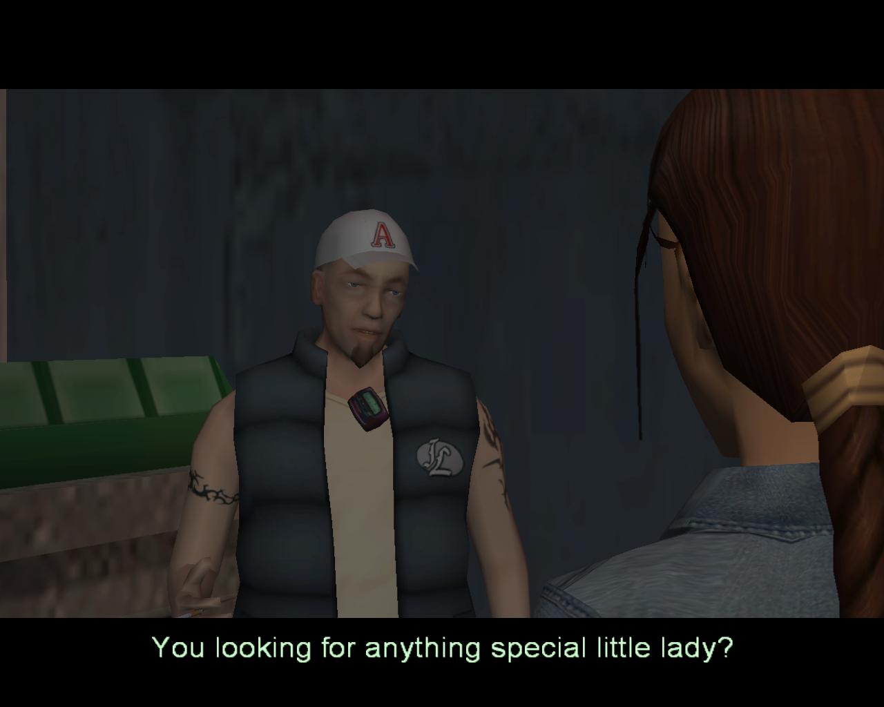Az idegenvezetotol jobbra van egy ajtó. Menj át rajt. Lara a gettó utcáira érkezett. Vele szemben egy "hajnali pillangó" cigarettázik. Menj oda hozzá, és szólítsd meg.