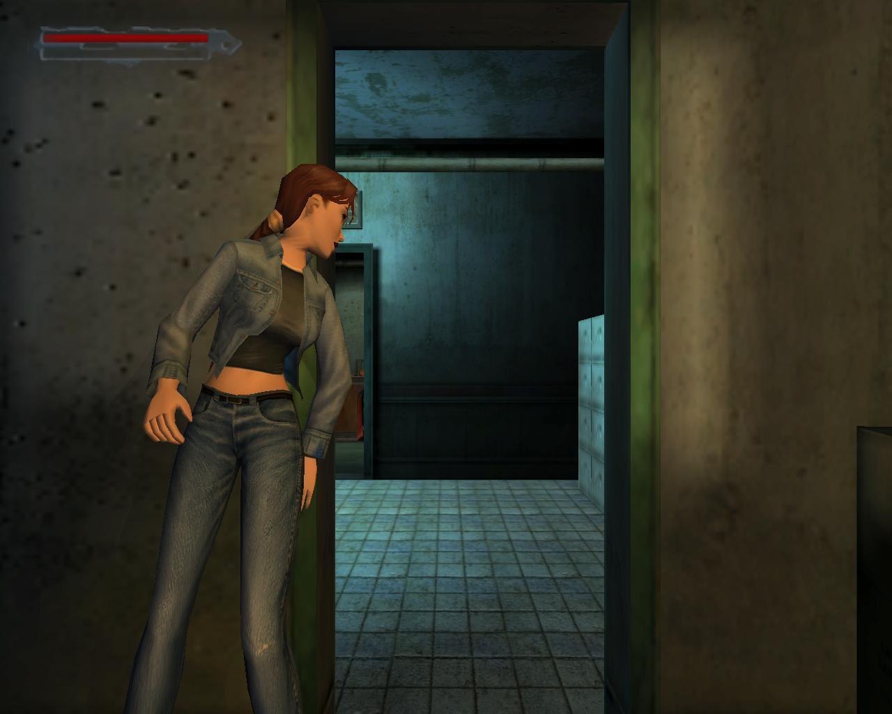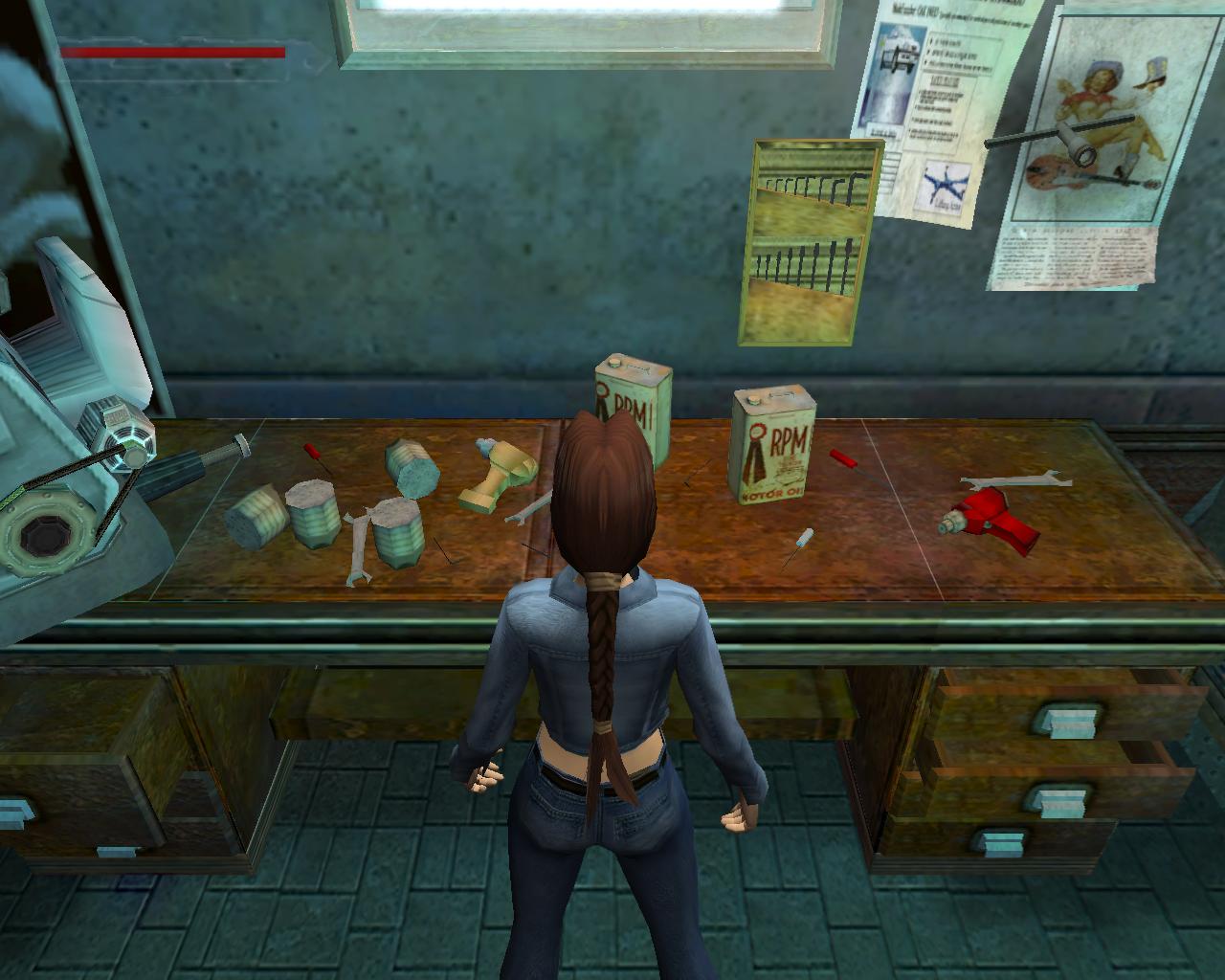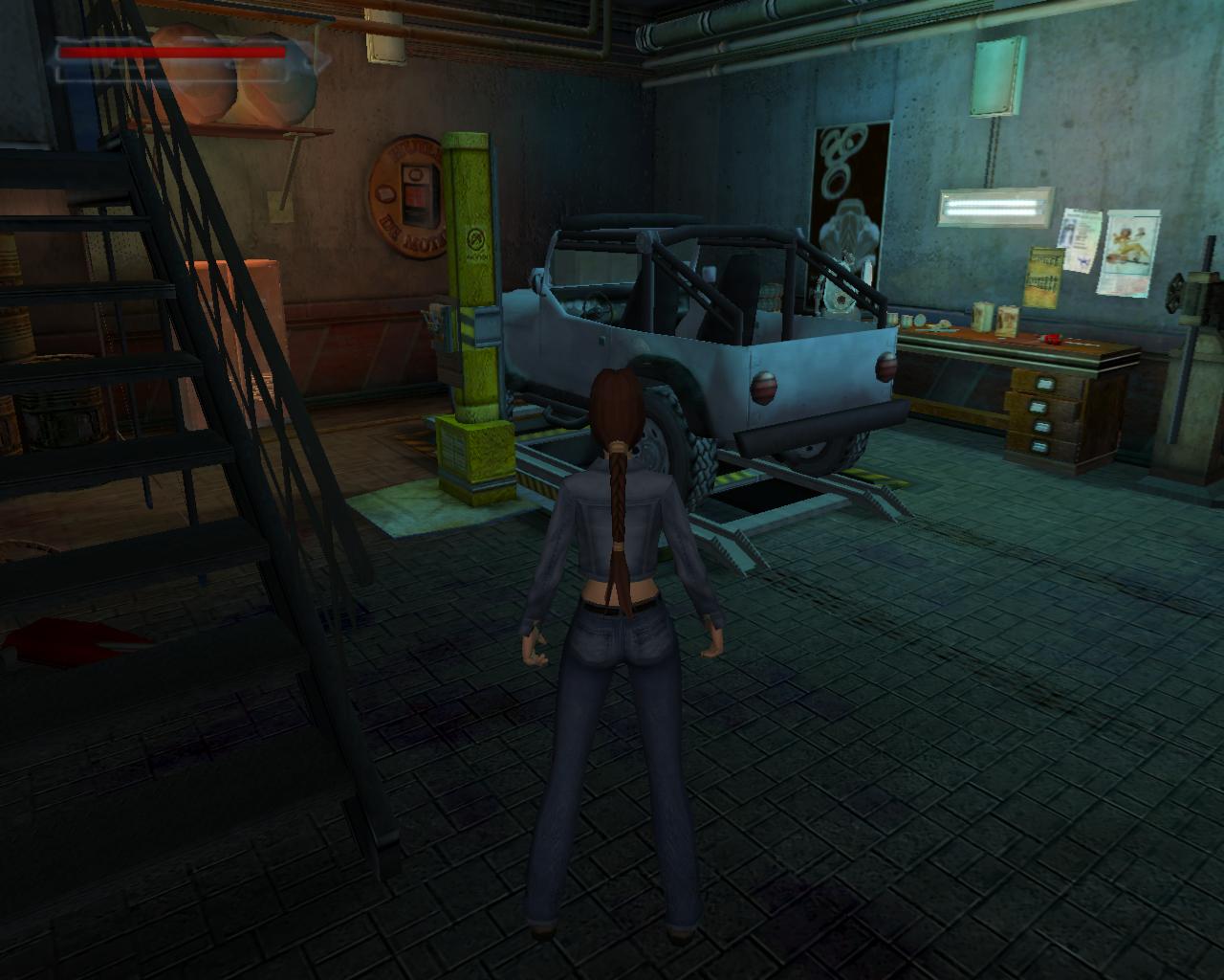 A terepjáró elott kétoldalt két szekrény van. A baloldaliban egy régi pisztolyt és kötszert találsz, a jobboldaliban loszert és elemeket. Ha jobban megnézed, a terepjáró alatti szereloaknában van egy lejárat, ami egyelore zárva van. Menj az autó bal oldalához, ahol egy kapcsolót találsz. Húzd meg, mire az emelo a magasba emeli a terepjárót. Az akna másik oldalán van egy munkapad. Találsz rajta egy csokulcsot. Vedd magadoz. A munkapad jobb oldalán van egy nagy kar. Húzd meg. Hatására szabaddá válik az aknában lévo lejárat.