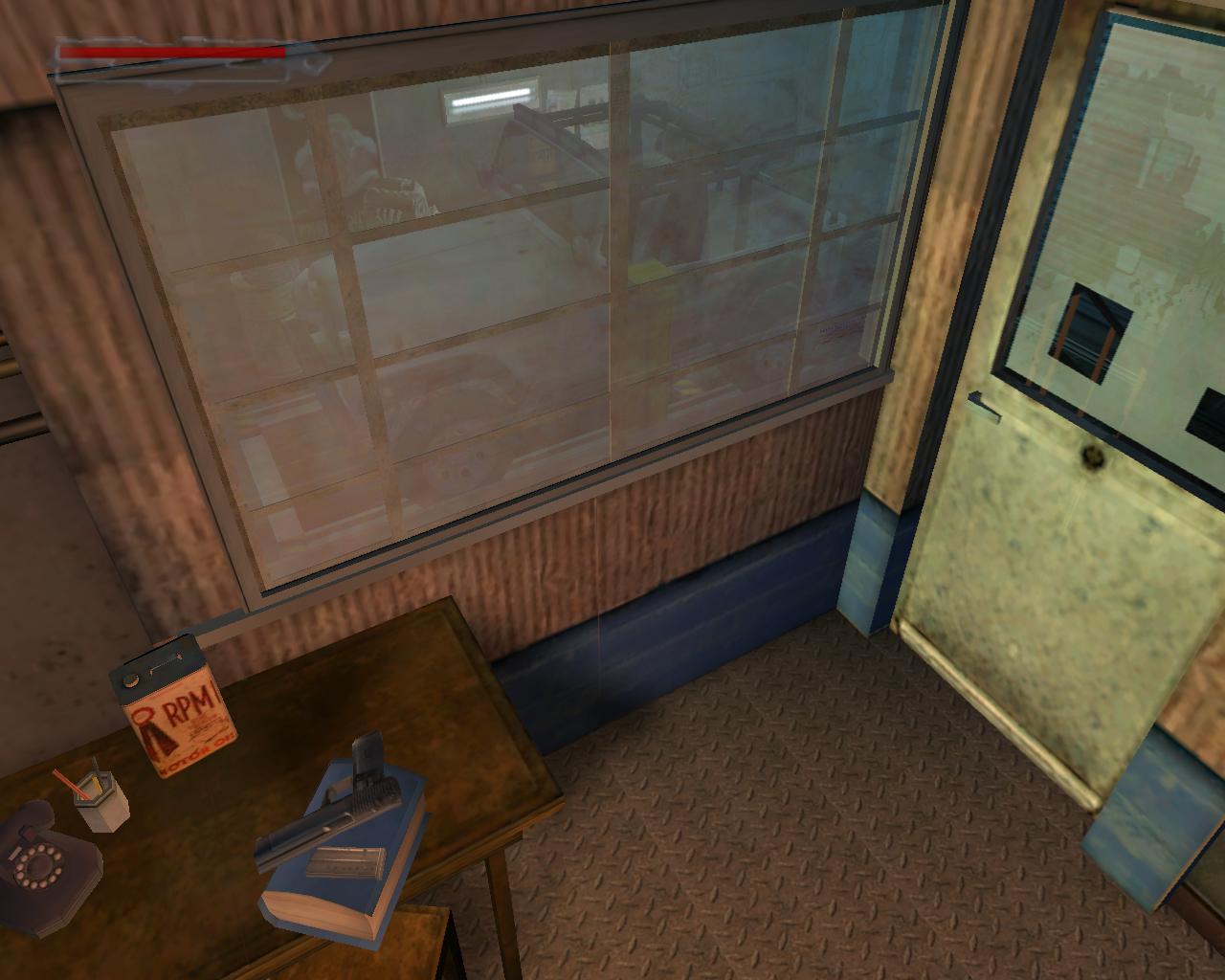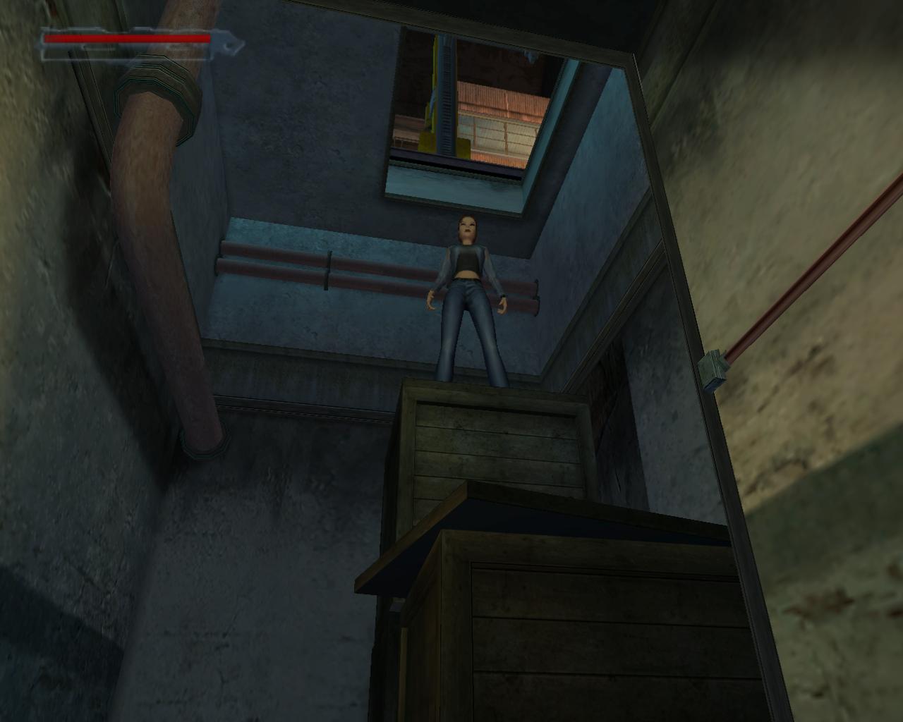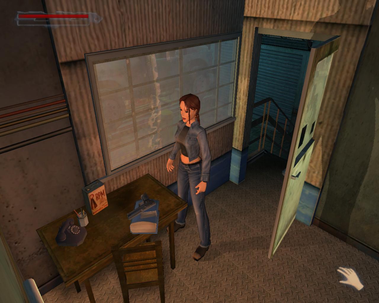 És most már be tudod törni az iroda ajtaját. Az asztalon egy Desert Ranger-t és hozzá való loszert találsz. Most már lemászhatsz az átjárón. Kapaszkodj le a peremen és huppanj le a doboz tetejére. Ess le a mellette lévo dobozra. Ezen egy csokoládé és MV-9 loszer van. Ugorj le a dobozról és mássz fel a létrán.