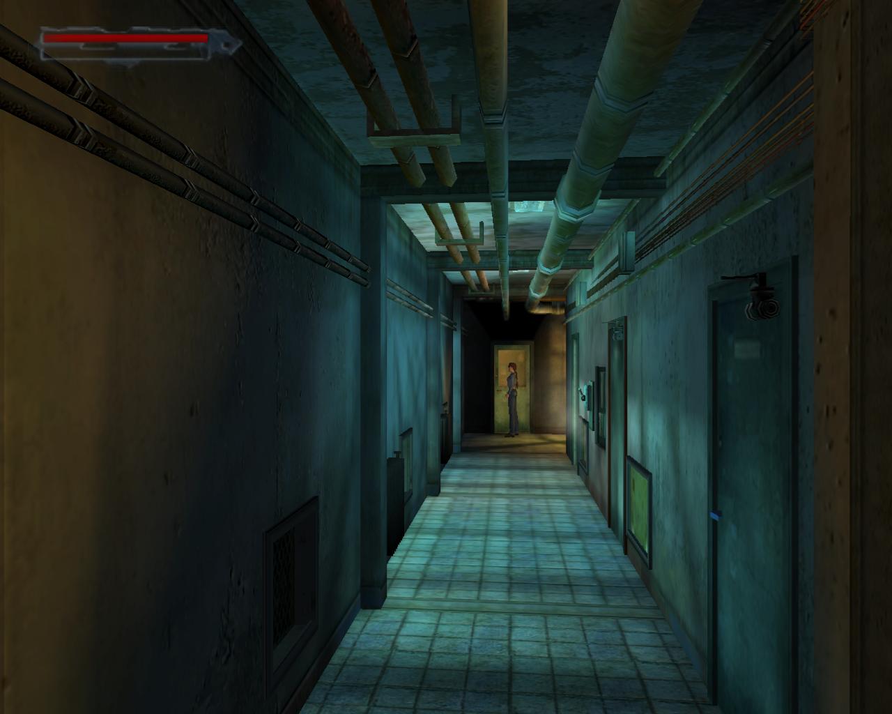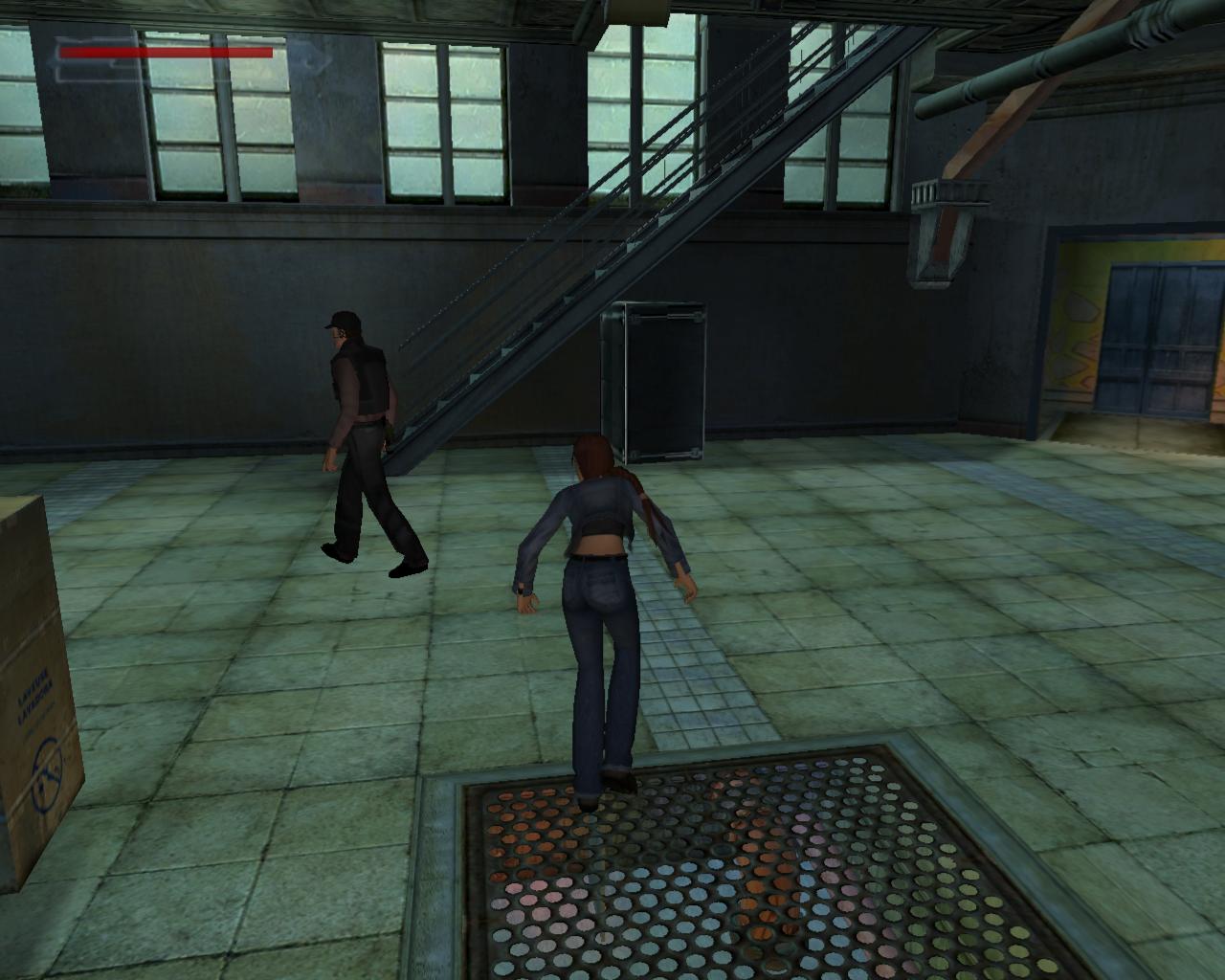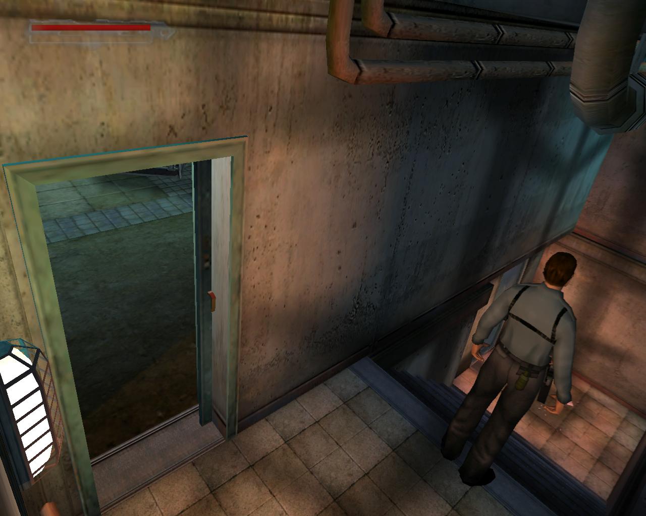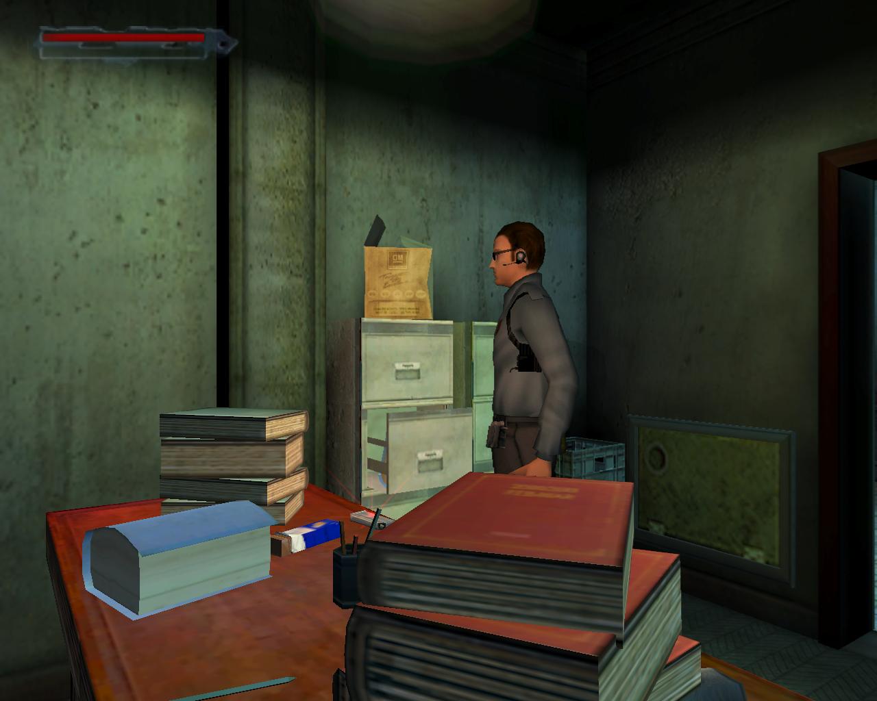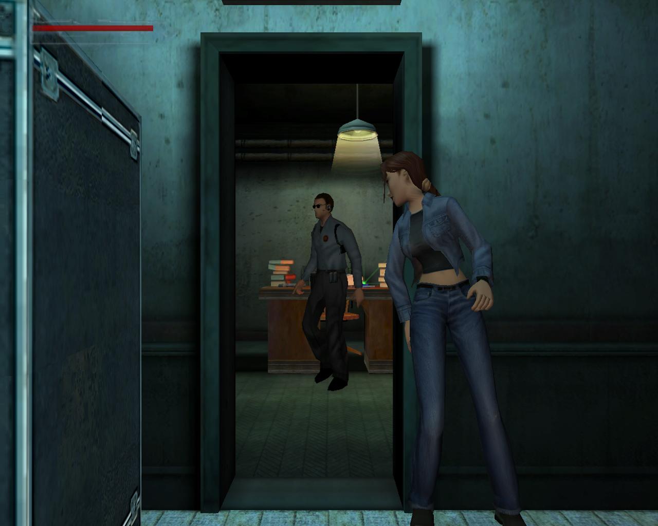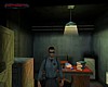3. Elorelopakodsz a folyosón, a nyitott ajtó mögé. Ennek a jobb oldalán, a cso (amibol fúj a goz) és a kapcsolótábla között, találsz egy kapcsolót. Ezt meghúzva a fények kialszanak. Az ornek ez gyanússá válik, ezért elindul a kapcsoló felé. Ne várd meg, míg ideér. Lopakodj be a nyitott ajtón, bújj el egy sarokban, és ha az or elment elotte, ki a másik ajtón (azon is kilopakodhatsz, amelyiken bejöttél). Surranj az or mögé, és üsd ki. Egyébként, ha nem bántod, az or rövid vizsgálódás után visszatér az irodába. Ezért amikor kijön, nem érdemes az irodába lopóznod, hogy összeszedd a cuccokat, mert esetleg nem lesz elég idod visszalopózni.
