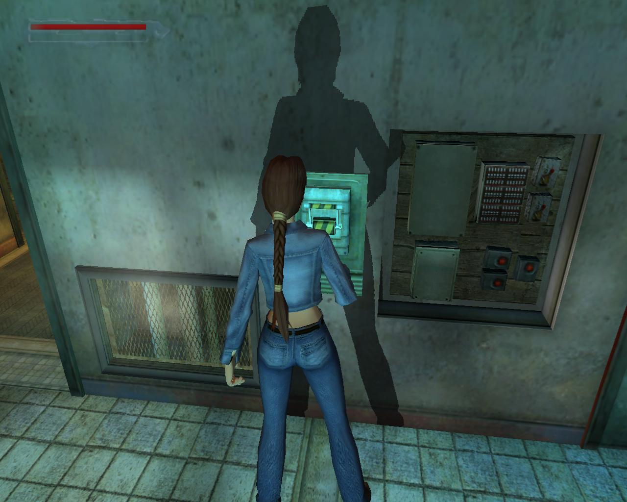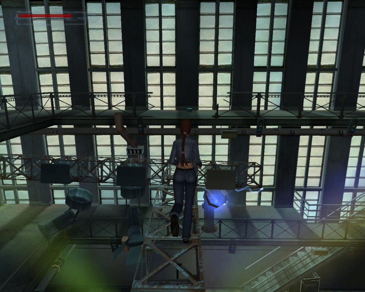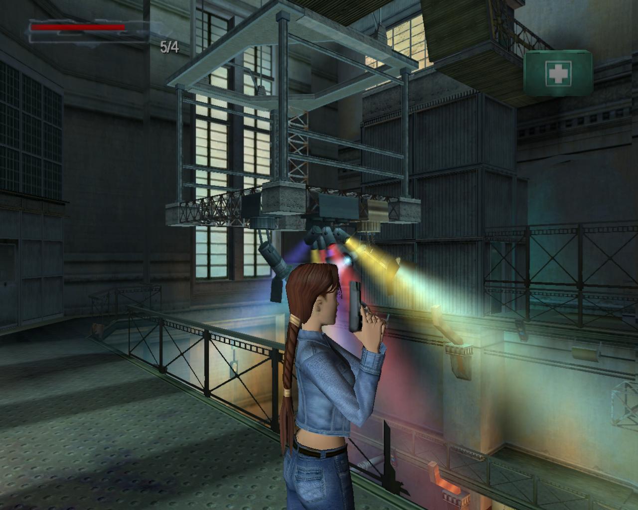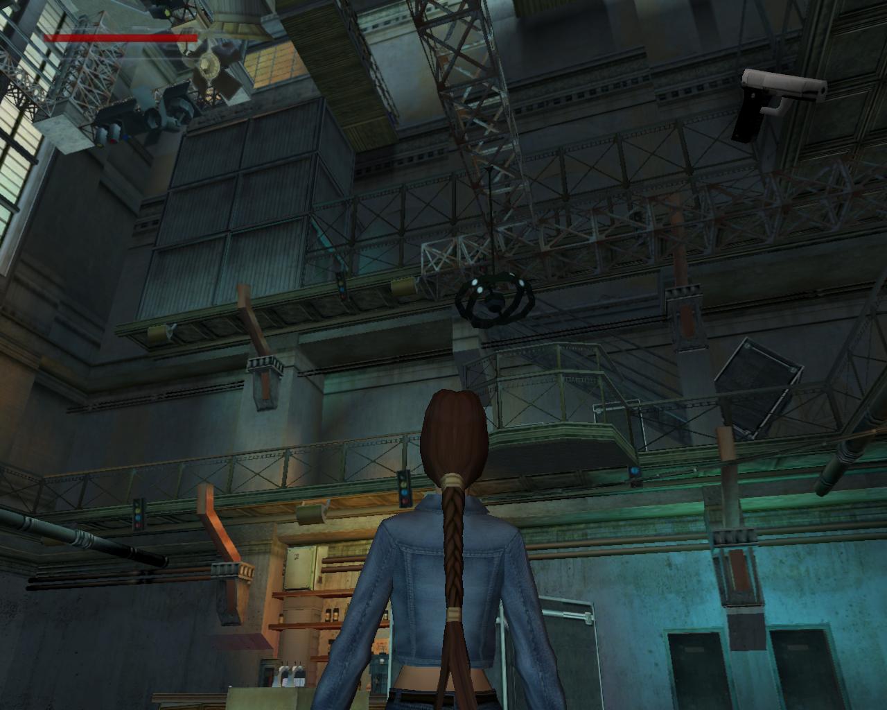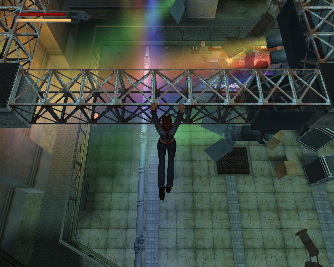 A lépcso tetején, a függöny mellett balra, a falon van egy kapcsoló. Húzd meg. Erre elindul a lemezjátszó és megszólal a zene. A hatás nem marad el, a pénztár ajtaján egy or rohan ki. Láthatod, hogy a fenti fényszóróállvány is elkezdett le és fel mozogni, miközben a reflektorok színes fénnyel pásztázzák a táncparkettet. Mire Lara felocsúdik, az or már majdnem a lépcso aljához ért. Intézd el. A hangoskodásra egy másik or jelenik meg a pénztár ajtajában. Miután vele is végeztél, vedd fel az elszórt fegyvereket, két MV-9-est. A hangszóróval szemben, amelyik mögött a gyógyszereket találtad, van egy lépcso, ami a második szintre vezet. Szaladj fel rajt, de készülj fel rá, hogy még mielott felérnél, a lépcso tetején lévo ajtó kinyílik, és egy or ront ki rajta. Intézd el, és vedd el a fegyverét, egy újabb MV-9-est. Menj jobbra körbe a párkányon, a következo lépcso irányába. Innen mégjobban meg tudod csodálni a fényeket. A lépcsohöz érve észre fogod venni, hogy dobozok zárják el a felfelé vezeto utat. Másképpen kell feljutnod. A lépcso mellett láthatsz egy erkélyszeruen kiugró részt, mellette egy nagy és egy kisebb dobozzal. Az erkély felett egy világítóállvány fut. A kis dobozt oda tudod tolni a peremhez, s ha erre felmászol, akkor felugorva már el tudod kapni az állvány peremét. Húzd fel magad. (Ritkán elofordul, hogy ezidotájt egy vagy két or jelenik meg a színen). Szemben látni fogsz egy rést a korláton, mögötte egy nagy egészségcsomag hever a földön. Indulj el felé a keskeny állványon. Abban a pillanatban, hogy rálépsz, a rozsdás világítóállvány megadja magát, és recsegve-ropogva leszakad. Állj szembe a korláton lévo réssel, lépj hátra néhány lépést, és nekifutásos ugrással ugorj át a peremre. Az egészségcsomaggal egyelore ne foglalkozz, mert a jobboldali sarokban lévo ajtón egy or lép ki. Rohanj oda, és végezz vele. Mihelyst megvagy, rögtön fordulj meg, mert egy másik or közeledik a hátad mögött. Intézd el ot is. Most már van idod összeszedni a fegyvereket, az ajtó mellett lévo kötszert és a nagy egészségcsomagot. Nem érdemes balra körbeszaladnod a peremen, mert az elzárt lépcso tetején lévo ajtót nem tudod kinyitni. Az ajtótól, amelyiken az or kilépett, nem messze van egy másik, kisebb rés a korláton. Menj oda, és sétálj a peremhez. Elotted látod, amint a világítóállvány emelkedik és süllyed. Várd meg amíg eléri a legalsó pontot, majd egy szimpla ugrással juss át rá. Amikor felfelé megy, ugorj mégegyszer elore. Fordulj balra és sétálj a függoleges, fém állványoszlophoz. Kapaszkodj fel rá, majd jobbra. Mássz fel rajt a világítóállvány tetejére. Egy háromszög alakú kis részen vagy. Fordulj 45°-ot balra, és sétálj a peremhez. Veled szemben, az állvány másik oldalán átlósan, van egy ugyanolyan, háromszög alakú rész, mint amin most állsz. Várd meg, amíg az állvány lefelé mozog, majd ugorj át rá. (Ugorhatsz felfelé is, de ekkor kapaszkodnod is kell). Fordulj jobbra és sétálj a peremhez. Figyeld meg, hogy a szemben lévo korlát felett nincs drót. Amikor a világítóállvány a legmagasabb pozícióba ér, könnyedén át tudsz ugrani felette. Fordulj balra. Láthatod, hogy a híd fel van emelve, így nem tudsz átmenni rajta. Jobboldalt egy létra van a falhoz rögzítve. Mássz fel rajt. Sétálj elore, és egy leszakadt, lejtos részhez fogsz érni. Toled balra van a rossz világítóállvány, amirol Bernard beszélt. A lejton háttal csússz le, majd kapd el a peremét. Függeszkedj el jobbra, körbe a sarkon. Amikor eléred a kis platformot, mássz fel rá. Vedd fel a loszert. Fordulj jobbra. A híd korlátja fölött ezen az oldalon nincs drót. Sétálj a peremhez, és egy kapaszkodós ugrással érd el a korlátot. Húzd fel magad, és ugorj át felette. Fordulj balra, és újra mássz fel a létrán. A lejton most szemben állva csússz le, majd félúton ugorj egyet elore. Egy kis platformon landolsz, ami a leszakadt padló egy része. Fordulj balra és sétálj a peremhez. A szakadékot átugorva juss át a szemközti platformra. Sétálj a platform végéhez. A rossz világítóállvány egy részével állsz szemben. Ugorj át hozzá és kapd el a peremét. Nem tudod felhúzni magad, mert a fejed felett cso húzódik. Függeszkedj el balra, amíg fel nem tudsz kapaszkodni. Fordulj balra és sétálj a kis, zöld platform széléhez. Ugorj át a hídra, a vezérloterem ajtajához. Az ajtót még nem tudod kinyitni.