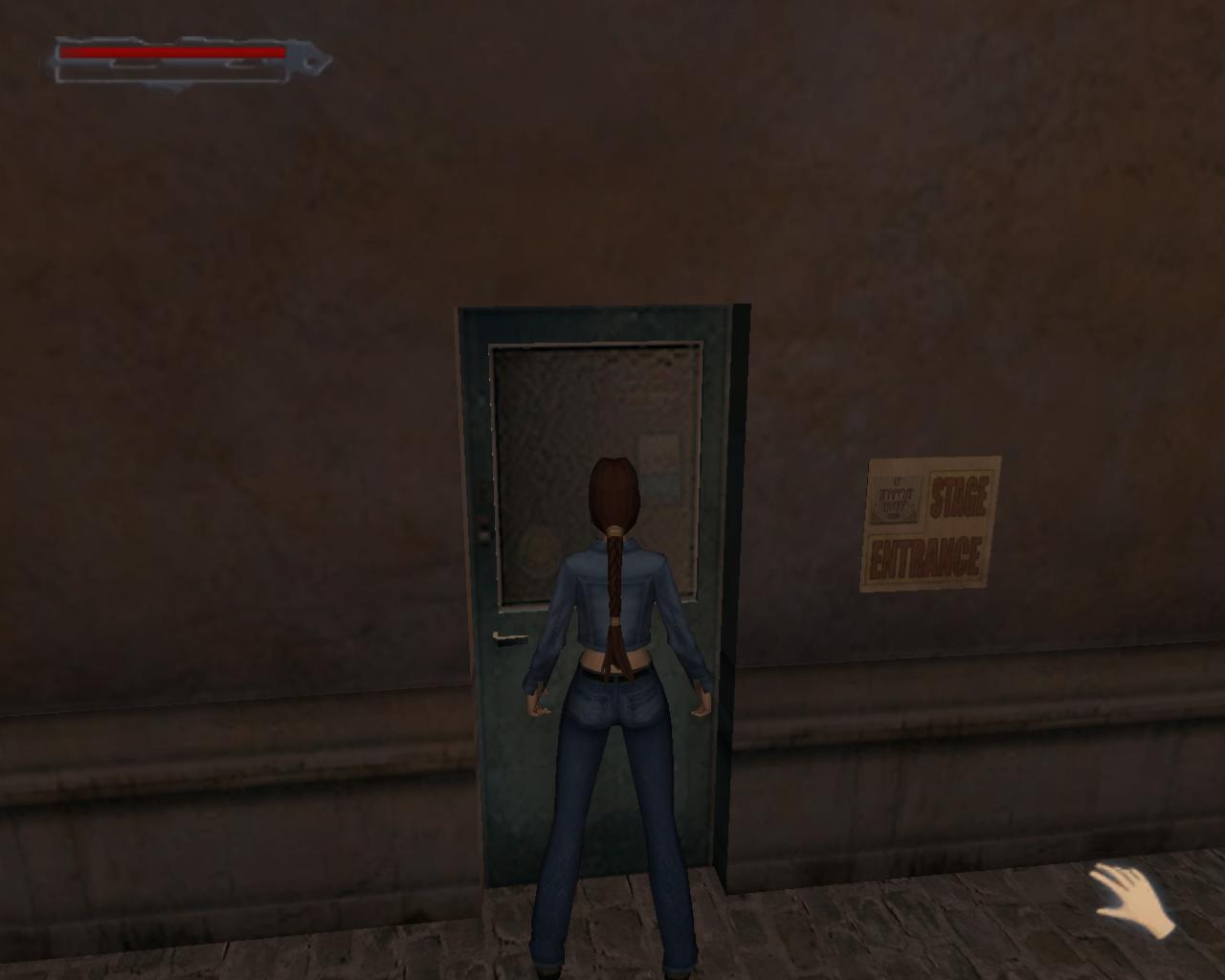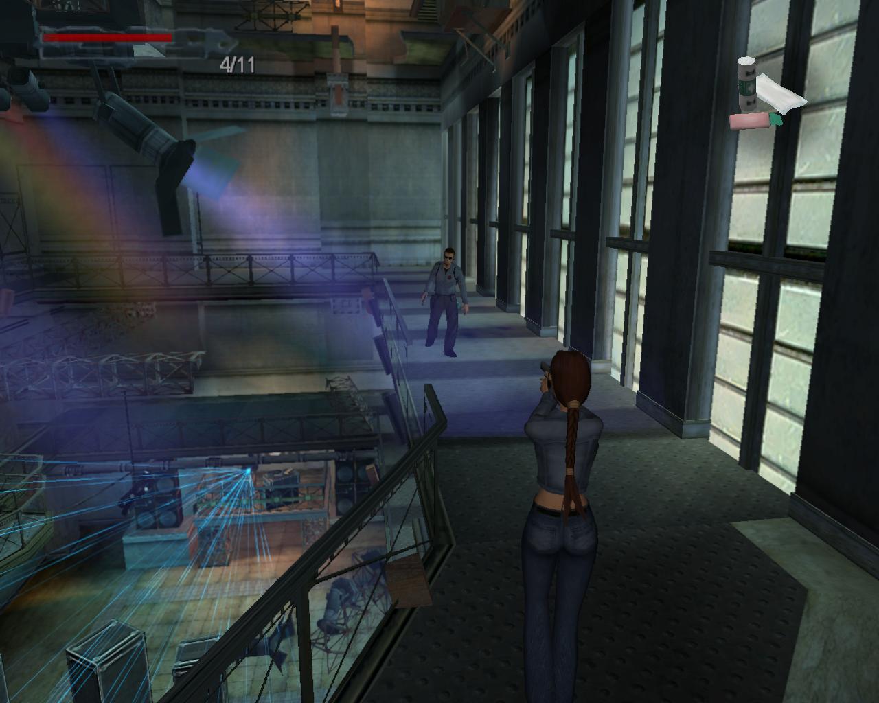 Miután végeztél az orrel, mássz le a létrán. Lent egy csokoládét találsz a földön. Menj az ajtóhoz. A dobozokkal elzárt lépcso tetején vagy. Fuss körbe jobbra, a korláton lévo résig. Már innét láthatod, hogy egy or mászkál a táncparketten. Ugorj át az állványra, majd ess le a kis dobozra az erkélyen. Szállj le róla. Az or lövöldözni kezd, vagy ha nem tud, elkezd felfelé rohanni a lépcson. Intézd el. Menj le a lépcson, amin feljött. Idoközben egy újabb or jelenik meg, aki a pénztárból jött ki. Ot se kíméld. (Elofordul néha, hogy ez a két or már akkor megjelenik, amikor a kis dobozt az erkélyre tolod. Ritkábban csak az egyikük. Ekkor itt már nem fognak ismét megjelenni). Újra a földszinten vagy. Menj a pénztár ajtajához és nyisd ki. Bent fordulj balra.