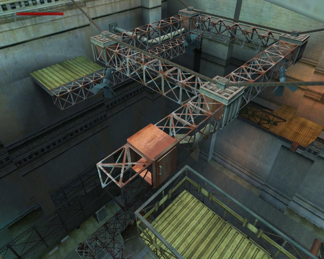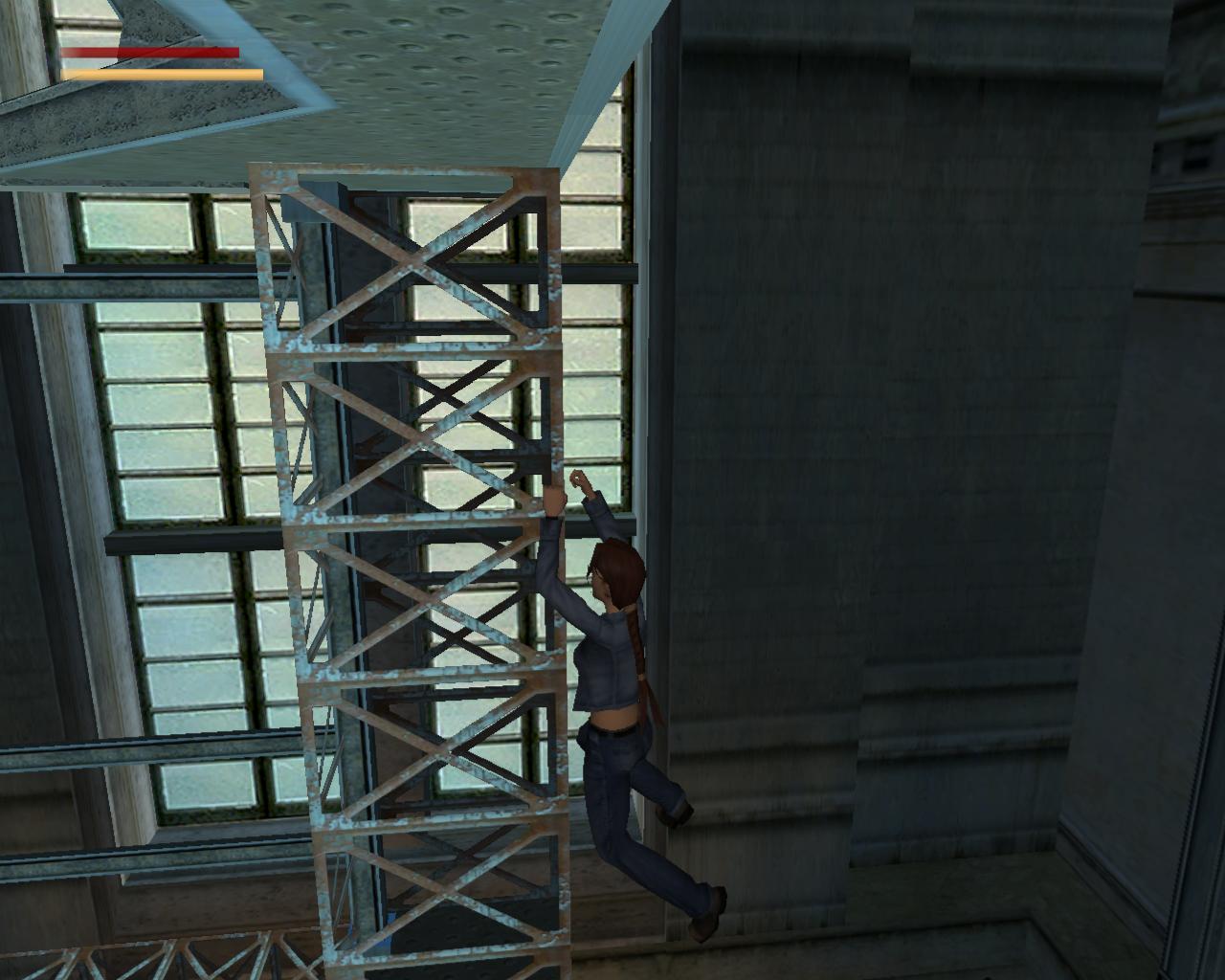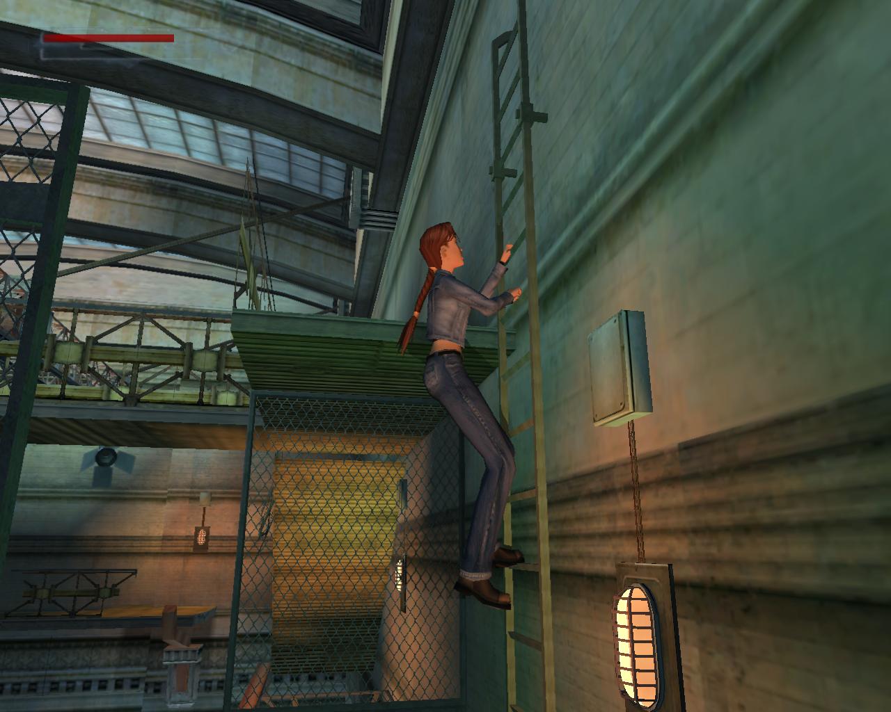 A lejton háttal csússz le, majd kapd el a peremét. Függeszkedj el jobbra, körbe a sarkon. Amikor eléred a kis platformot, mássz fel rá. Vedd fel a loszert. Fordulj jobbra. A híd korlátja fölött ezen az oldalon nincs drót. Sétálj a peremhez, és egy kapaszkodós ugrással érd el a korlátot. Húzd fel magad, és ugorj át felette. Fordulj balra, és újra mássz fel a létrán. A lejton most szemben állva csússz le, majd félúton ugorj egyet elore. Egy kis platformon landolsz, ami a leszakadt padló egy része. Fordulj balra és sétálj a peremhez. A szakadékot átugorva juss át a szemközti platformra. Sétálj a platform végéhez. A rossz világítóállvány egy részével állsz szemben. Ugorj át hozzá és kapd el a peremét. Nem tudod felhúzni magad, mert a fejed felett cso húzódik. Függeszkedj el balra, amíg fel nem tudsz kapaszkodni. Fordulj balra és sétálj a kis, zöld platform széléhez. Ugorj át a hídra, a vezérloterem ajtajához. Az ajtót még nem tudod kinyitni.