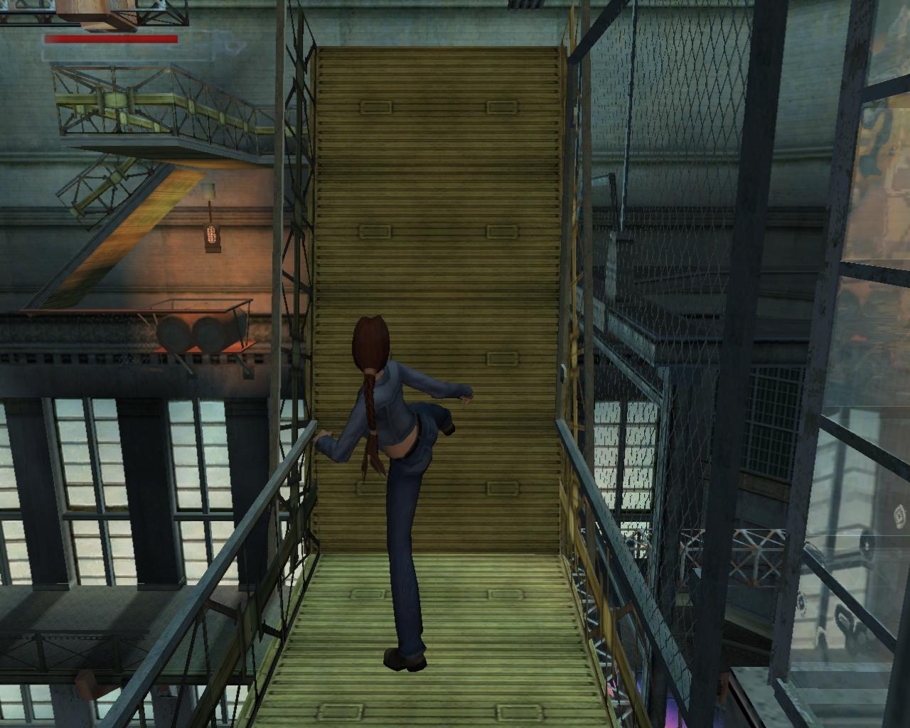 Nem érdemes balra körbeszaladnod a peremen, mert az elzárt lépcso tetején lévo ajtót nem tudod kinyitni. Az ajtótól, amelyiken az or kilépett, nem messze van egy másik, kisebb rés a korláton. Menj oda, és sétálj a peremhez. Elotted látod, amint a világítóállvány emelkedik és süllyed. Várd meg amíg eléri a legalsó pontot, majd egy szimpla ugrással juss át rá. Amikor felfelé megy, ugorj mégegyszer elore. Fordulj balra és sétálj a függoleges, fém állványoszlophoz. Kapaszkodj fel rá, majd jobbra. Mássz fel rajt a világítóállvány tetejére. Egy háromszög alakú kis részen vagy. Fordulj 45°-ot balra, és sétálj a peremhez. Veled szemben, az állvány másik oldalán átlósan, van egy ugyanolyan, háromszög alakú rész, mint amin most állsz. Várd meg, amíg az állvány lefelé mozog, majd ugorj át rá. (Ugorhatsz felfelé is, de ekkor kapaszkodnod is kell). Fordulj jobbra és sétálj a peremhez. Figyeld meg, hogy a szemben lévo korlát felett nincs drót. Amikor a világítóállvány a legmagasabb pozícióba ér, könnyedén át tudsz ugrani felette. Fordulj balra. Láthatod, hogy a híd fel van emelve, így nem tudsz átmenni rajta. Jobboldalt egy létra van a falhoz rögzítve. Mássz fel rajt. Sétálj elore, és egy leszakadt, lejtos részhez fogsz érni. Toled balra van a rossz világítóállvány, amirol Bernard beszélt.