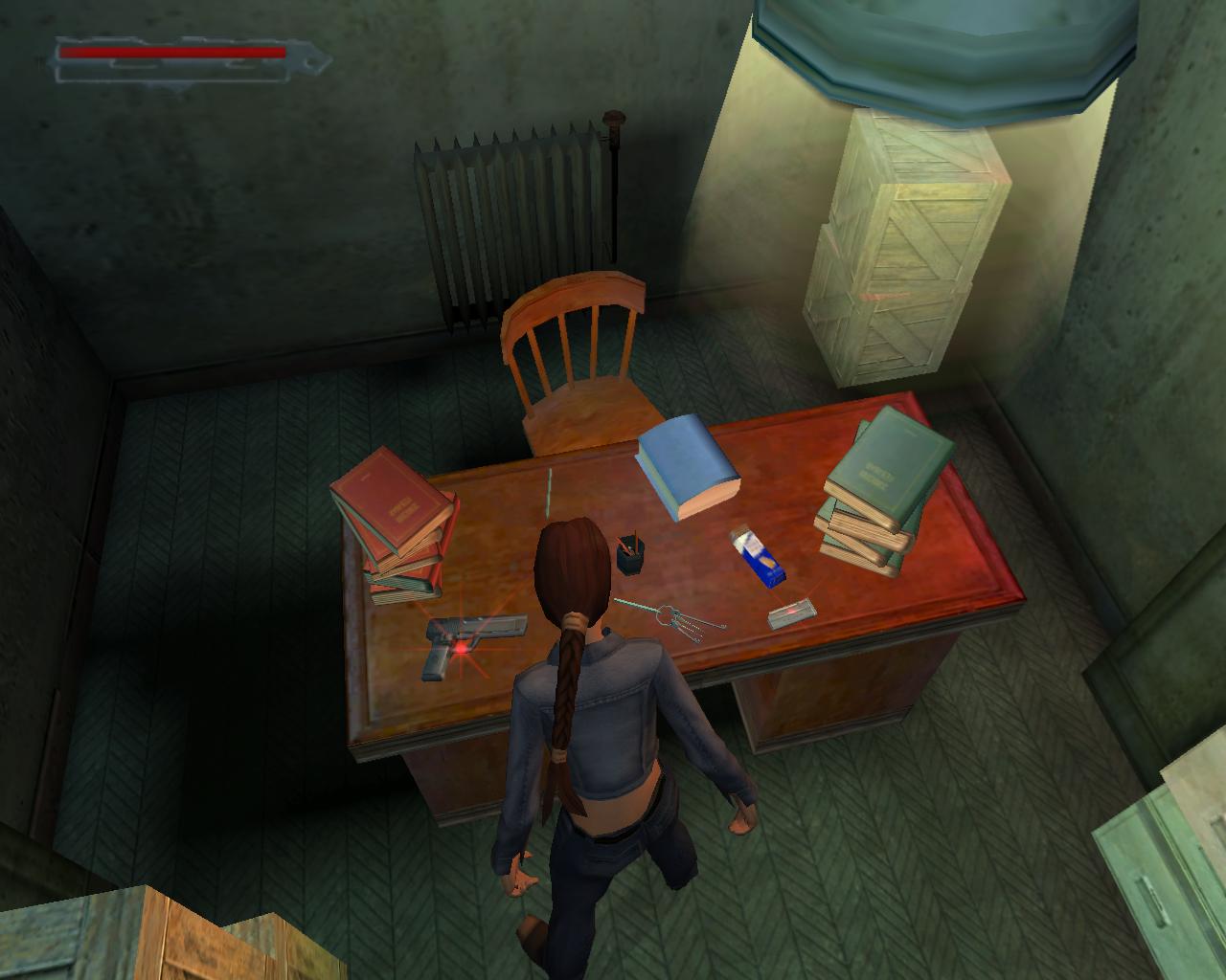 Egy animáció következik, ami egy ajtót mutat egy lépcso tetején. Távolodunk, végigúszunk egy folyosón, aminek a végén Lara áll. Befordulunk jobbra, és egy kis szobába repülünk, amibol egy iroda nyílik. Egy or járkál itt fel, s alá. Az asztalon különféle tárgyak vannak, közöttük a lépcso tetején látott ajtó kulcsa is.