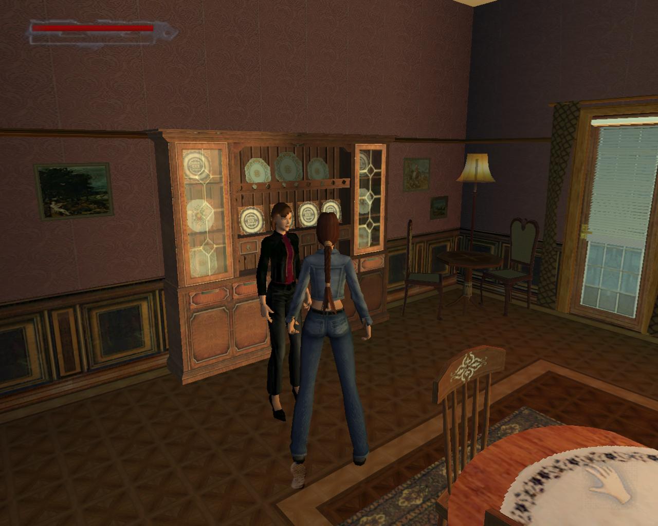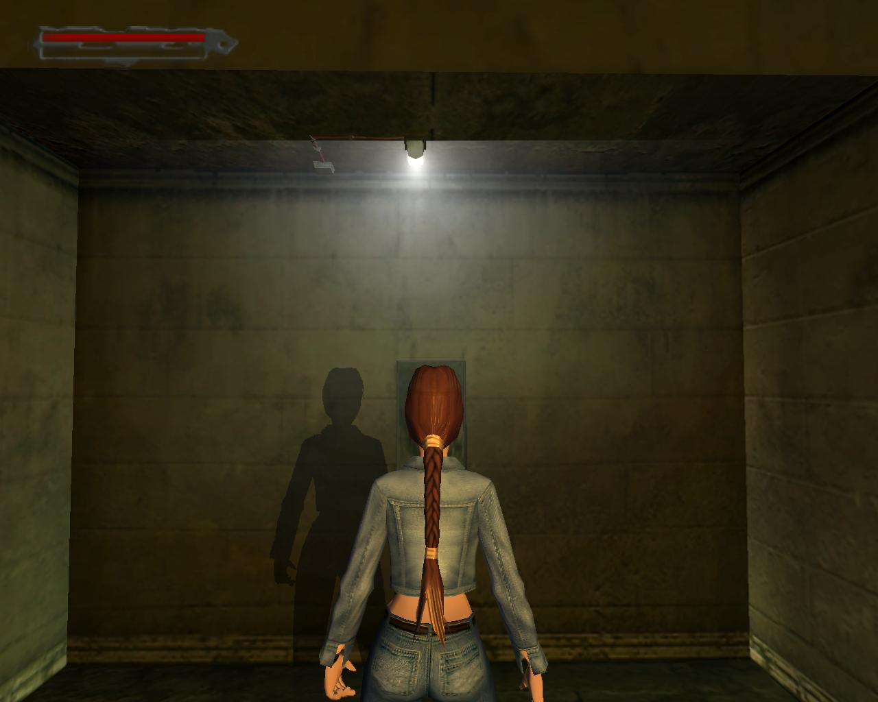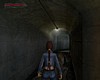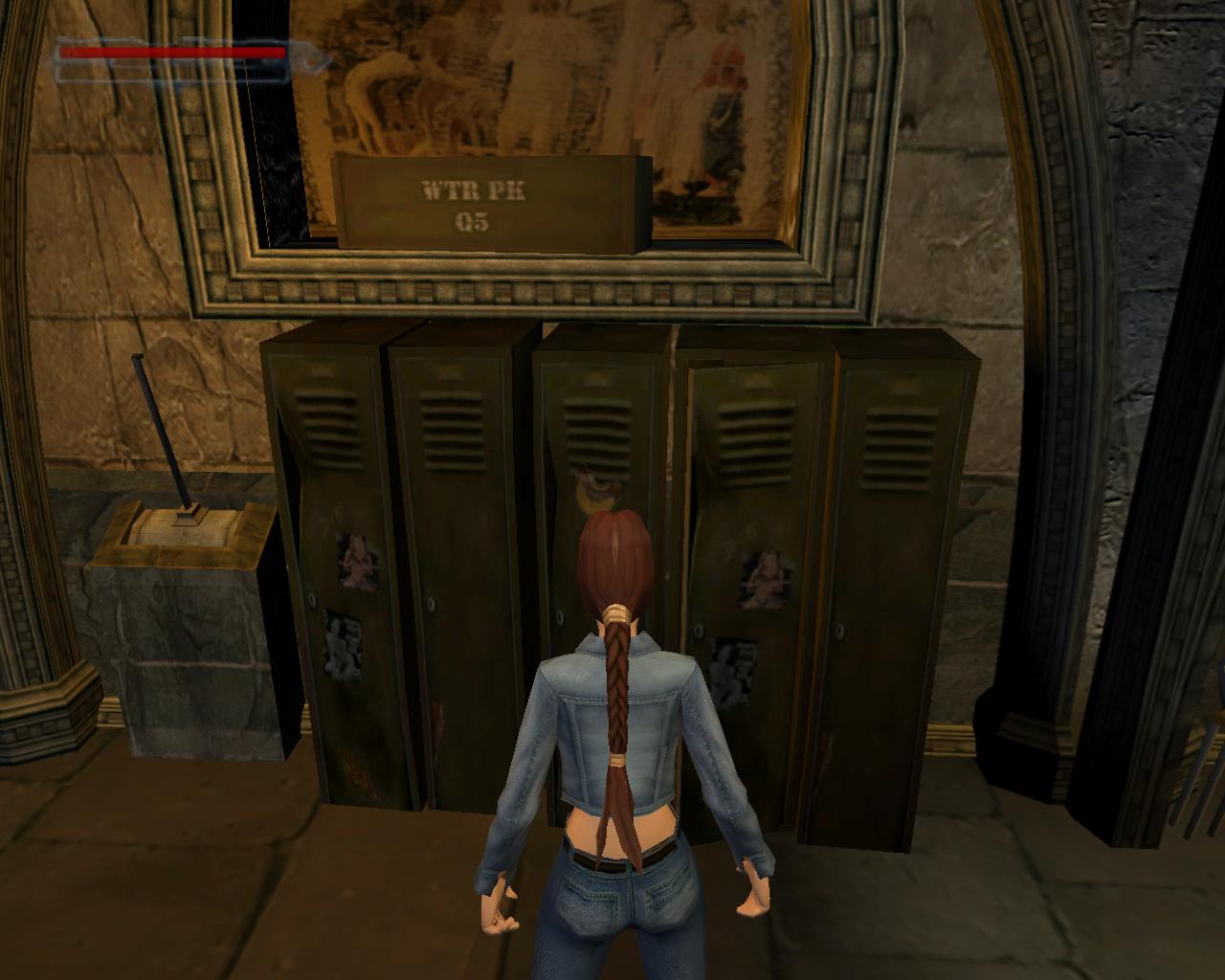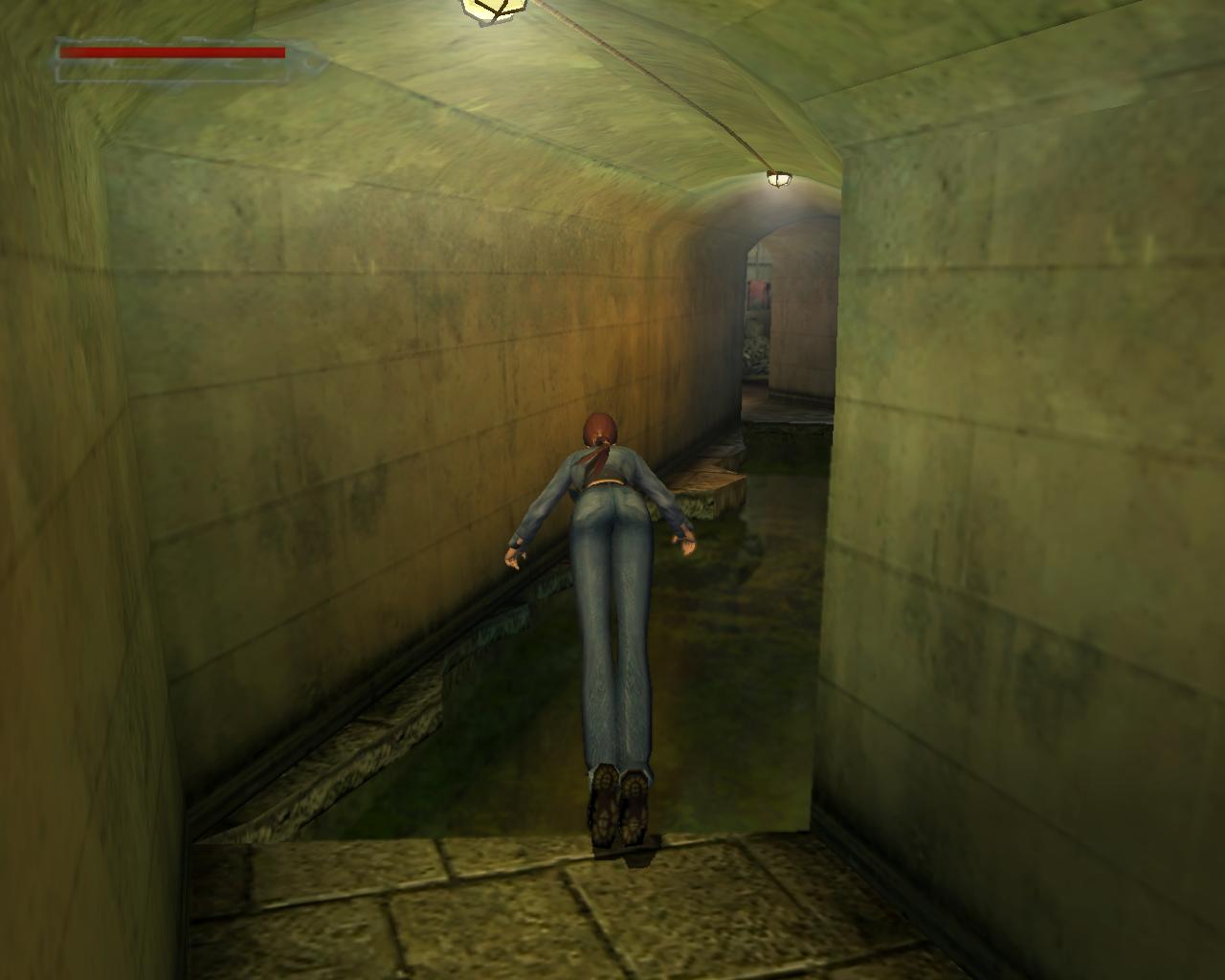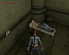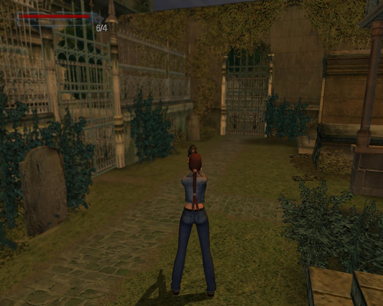 Fordulj meg, hogy az ajtóval szemben állj. Jobbra tole egy kis beugróban egy sírkövet látsz, növényekkel surun benove. Mögötte egy kis egészségcsomagot találsz. Vedd fel és menj vissza az ajtó elé. Kövesd a kikövezett ösvényt a templom körül. A két törött sírnál (jobboldalt) az út jobbra kanyarodik. Tedd te is ezt, maradj rajta. Láthatod, hogy a kapuor nem hazudott, amikor eloször találkoztál vele. Tényleg van itt egy jól megtermett Doberman (ami inkább Rotweiler, dehát, ha a kapuor azt mondja...). Intézd el a nem túl huséges társadat. Fuss tovább. Nem messze, az ösvényen van egy leágazás jobbra, ami egy kis kápolnához vezet. Ekkor kissé távolabb elotted lesz egy kapu, ami le van láncolva. Balra szintén van egy leláncolt kapu, mögötte egy síremlékkel. Egy angyalszobor, ami keresztet tart maga elott. Oda kell majd bejutnod. Fordulj jobbra a leágazásnál, a kápolna felé. Fuss el mellette balra. A kokeresztnél fordulj balra. A fa mellett, a kripta háta mögött kötszereket találsz. Menj vissza a kikövezett ösvényre és indulj el visszafelé. Ahol az út elkanyarodik, te is fordulj el balra. Balra, a két törött sír után van egy kékajtós kripta. Ezzel majdnem szemben van egy másik, pirosajtós kripta. Menj a jobb oldalához, fordulj balra, ugorj fel és kapd el a peremét. Húzd fel magad, majd fordulj balra, a kékajtós kripta irányába. Egy nekifutásos-kapaszkodásos ugrással juss át a tetejére. Menj a szemközti pereméhez és fordulj balra. Látni fogsz egy négyzet alapterületu, lapos teteju kriptát. Fuss neki és ugorj át rá. Szemben, balra az elkerített területtol, ahol az angyalos síremlék áll, van egy újabb kripta. Felette láthatsz egy peremet, amin egy csokoládé csillog. Nekifutásból ugorj át a kriptára. Menj a hátsó pereméhez, szemben. Ugorj elore és kapaszkodj meg a peremben. Húzd fel magad, fordulj balra, menj a csokoládéhoz, és vedd fel. Sétálj tovább a perem széle felé. Innét ugorj egyet elore, a következo kripta tetejére. Mássz le róla és menj az ajtajához. Próbáld meg kinyitni.
