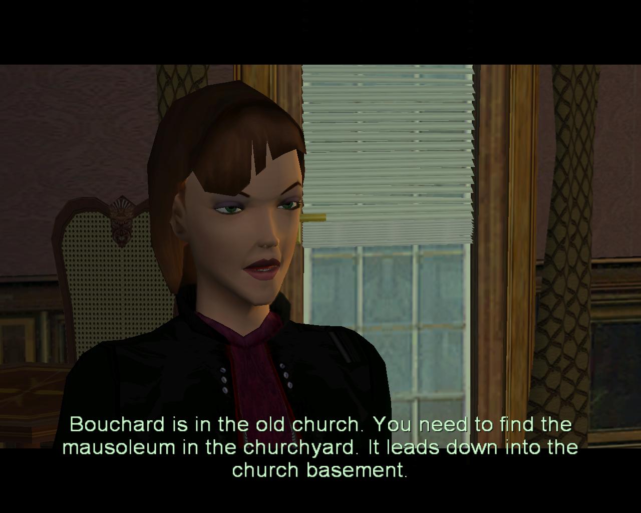 Menj tovább a folyosón. Jobbra van egy kis lelakatolt járat, amibe egy patkány szorult. Szemben láthatod a beszakadt folyosót, de most oldalról. Menj oda. Az itt lévo plafondarabot el tudod húzni, mire a törmelék összeesik, és az eltorlaszolt út szabaddá válik. Azonban ebbol az irányból nem tudsz továbbjutni, mert két fémgerenda zárja el a folyosót. Fordulj meg, és menj a kis járathoz, a patkánnyal. Rúgd be a drótos kisajtót. A patkányt ez annyira megrázza, hogy harapdálni kezdi Larát. Ha nem tudod elkerülni, egy lövés elég neki. Kússz be a járatba. Egy kis helyiségbe érkezel, jobbra loszer, balra egy ajtó van. Vedd fel a loszert, és nyisd ki az ajtót. Az itt lévo rövid folyosó egy másik ajtóhoz vezet. Ezen kilépve visszaérsz arra a helyre, ahonnan elindultál. Fordulj balra. Menj át a törmeléken, amit az elobb sikerült eltakarítanod az útból. Újra egy olyan helyhez érsz, ahol a padló helyén víz van. Itt kénytelen leszel megfürdetni Larát. Mássz ki a túloldalon. Egy kis terembe értél, ahol egy szivárgó szelep van. Fordulj jobbra. Jobbra a fal át van törve. Menj át a lyukon. A templom alagsorában vagy, egy kis cellában két kokoporsóval. A szemben lévo ajtó zárva van, de balra van egy kis átjáró, ami a következo cellába vezet. Balra, a dobozok mögött egy férfi fekszik a sarokban. Ilyesztoen néz ki. Az alakja teljesen el van deformálódva. A teste egy része helyén, mintha fém lenne. Olyan, mint egy rosszul sikerült kísérlet áldozata. Fájdalmában ide-oda dobálja magát, és hörgésszeru üvöltés tör elo belole. Az ágya mellett balra, egy kis egészségcsomag van a fal peremén. Vedd el. Fordulj meg, és menj ki az ajtón. A szemközti cellában, jobbra a második kokoporsó mögött, loszert találsz. Vedd fel, és menj ki az ajtón. Fordulj jobbra. A folyosó végén egy kis ajtó van. Menj oda, nyisd ki, és lépj be rajt. Odabenn Bouchard ül egy fotelban.