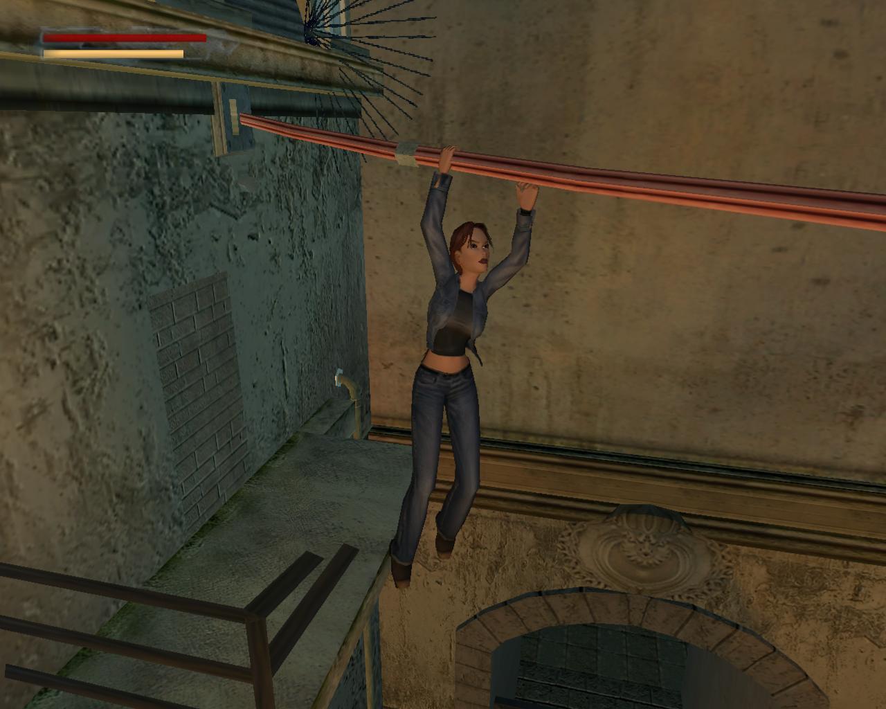 Ugorj fel és kapd el. Függeszkedj elore. A vezeték végéhez érve ess le a kis padlórészre, ami elkezd leszakadni alattad, úgyhogy gyorsan sétálj a pereméhez, és ugorj elore a következore. Ez sem biztonságosabb, mint az elozo, úgyhogy villámgyorsan csinálj egy szaltót jobbra (ha ugrás közben be is fordultál jobbra, akkor elore ugorj). Itt már biztonságban vagy. (Ha az elozoek során bármikor leestél, akkor járj el az 1. pontban leírtak szerint, vagy kezdd el elorol).