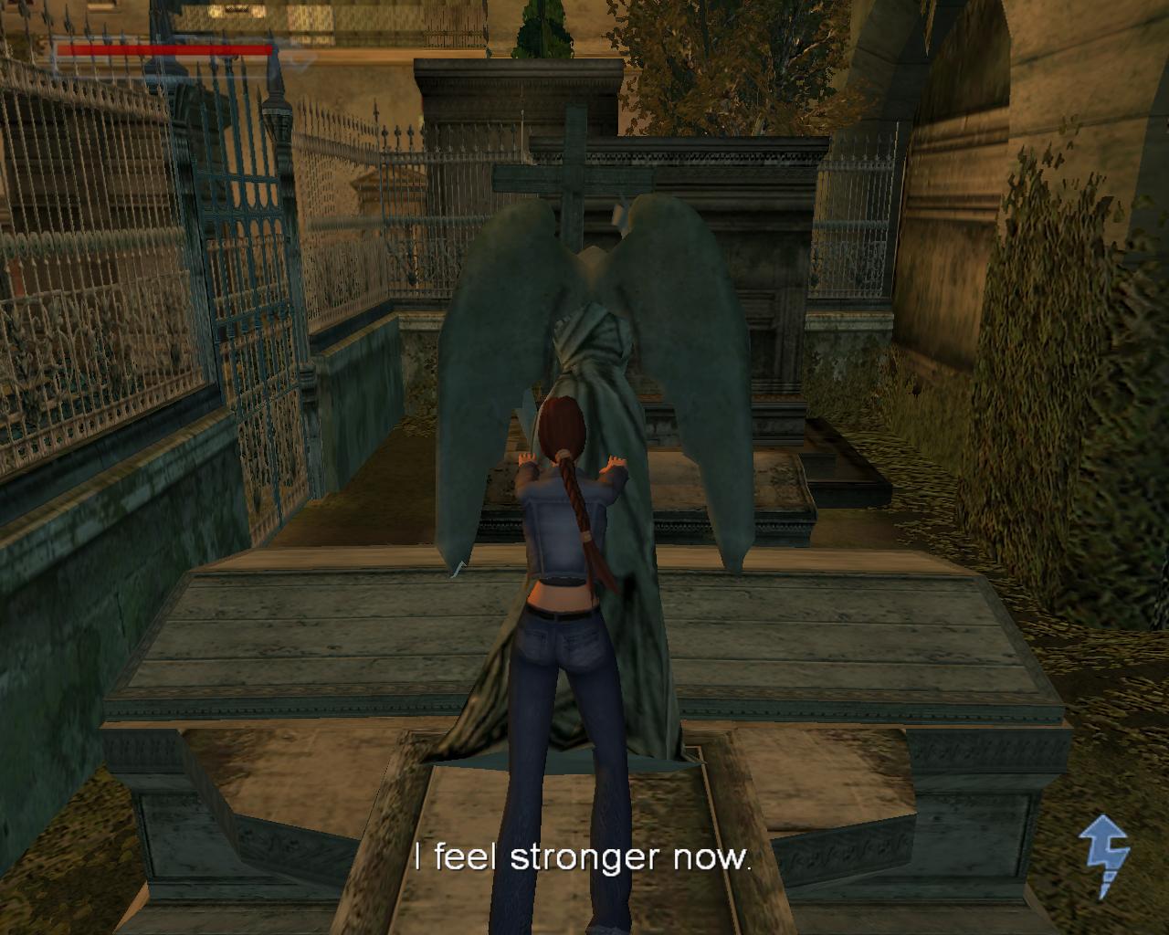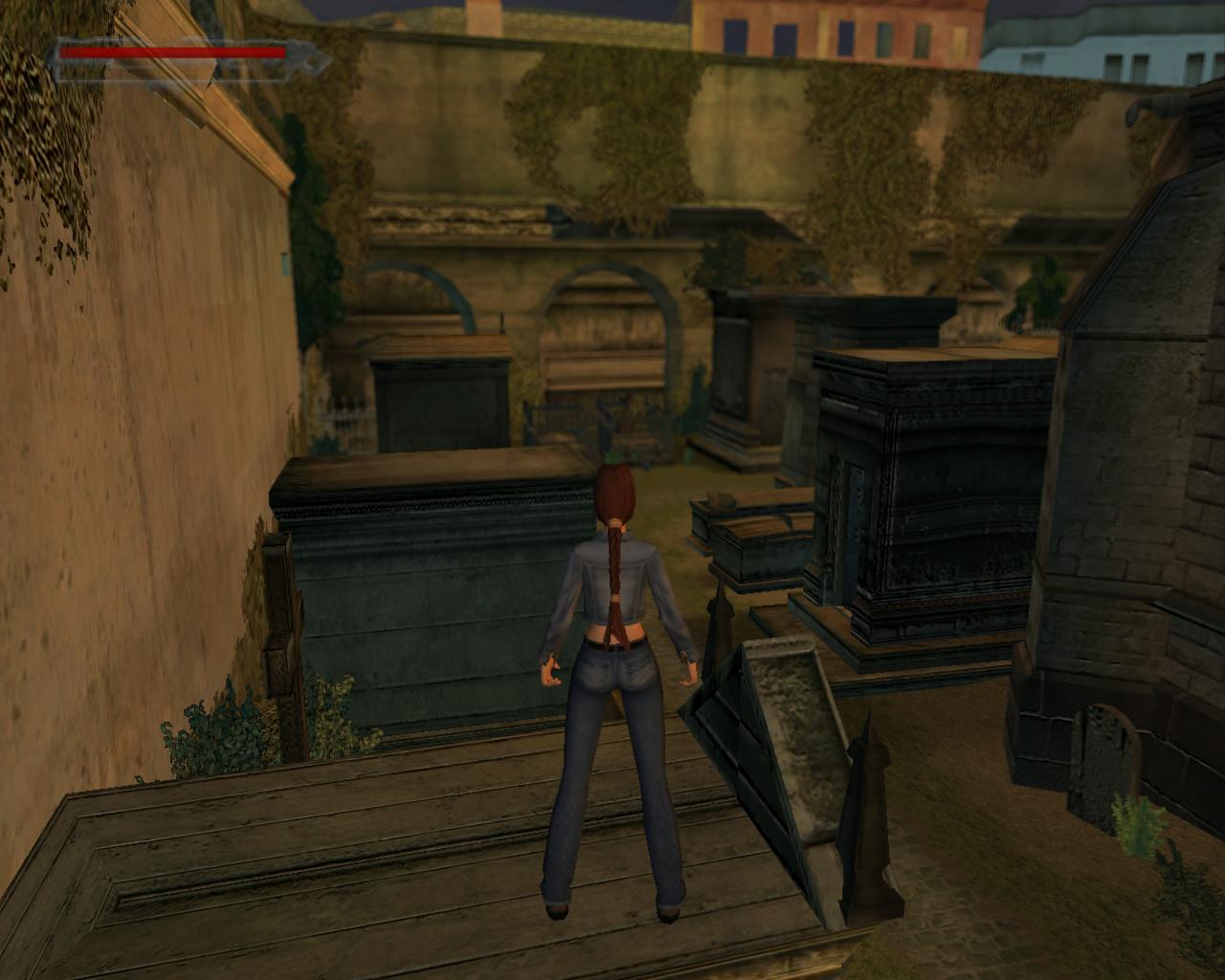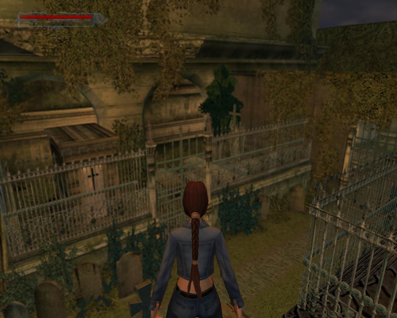 Mássz vissza a kripta tetejére. Fordulj az ajtó felé, ami mellett a kis egészségcsomagot találtad. Amint látod, újabb kutya jelent meg. Ugorj elore a szemben lévo kripta tetejére. Mássz le, és menj a pirosajtós kriptához, amelyikre eloször felmásztál. Mássz fel rá újra. Ugorj át a kékajtós kriptára, majd balra, a következore, végül az elkerített terület mellettire. Itt fordulj jobbra, az angyalszobor irányába, és sétálj a peremhez. Fügeszkedj le, és huppanj le a földre. Fordulj meg. Menj a toled balra lévo kripta ajtajához, és törd be.
