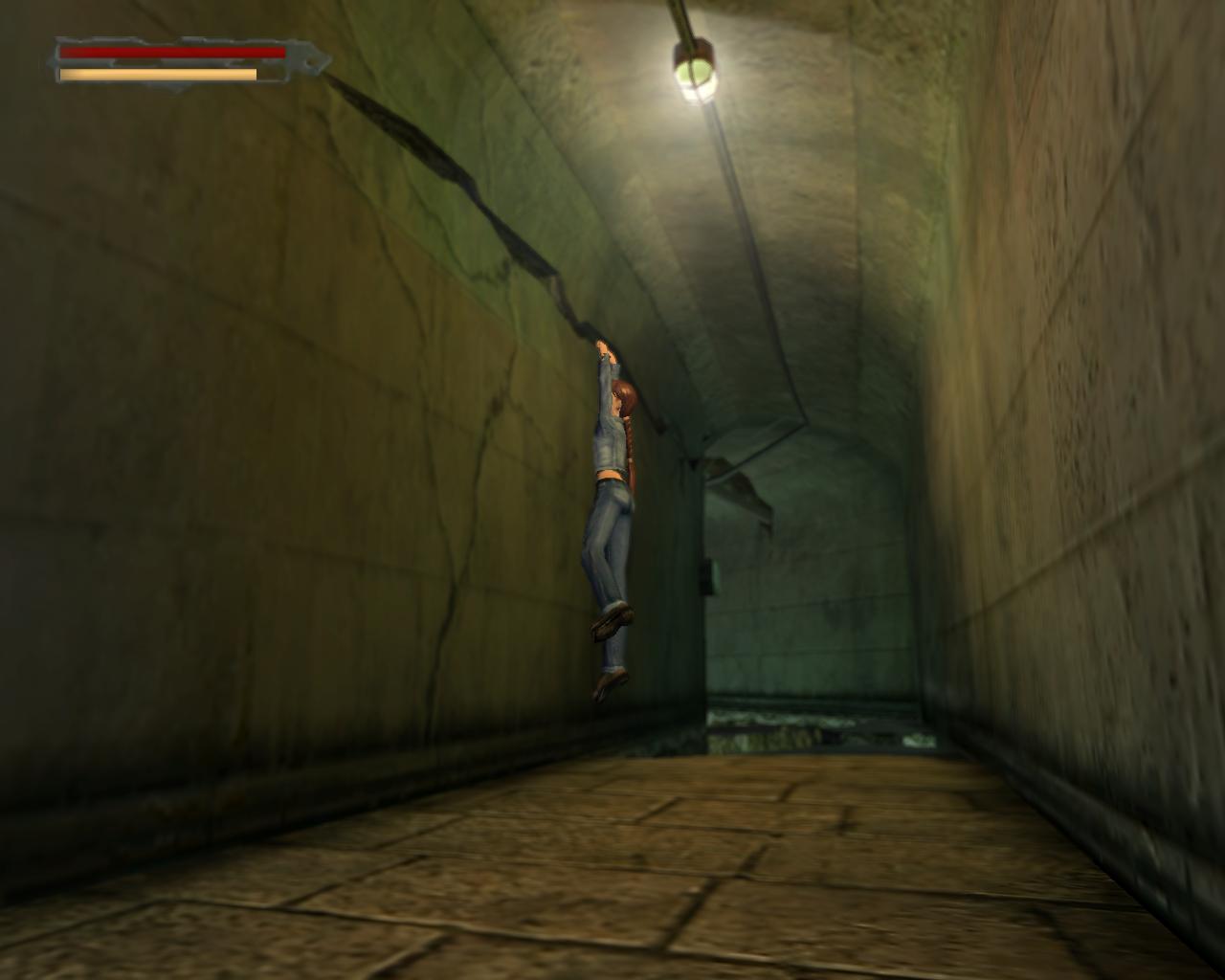 Fordulj a jobb fal felé, amelyiken a repedés van. Itt a gyökerekbe kapaszkodva fel tudsz mászni a repedéshez. Fent nyomd meg a Fel-kurzorbillentyut, hogy Lara csak a kezét használja kapaszkodásra. Függeszkedj el jobbra, majd ess le a folyosóra. Csússz le újra a padlódarabon, és ugorj át a kicsi, épen maradt részre. (Ennek az oldala is mászható, de a vízbol nem tudsz felmászni rá. Csak az ugrásból való kapaszkodásra szolgál).