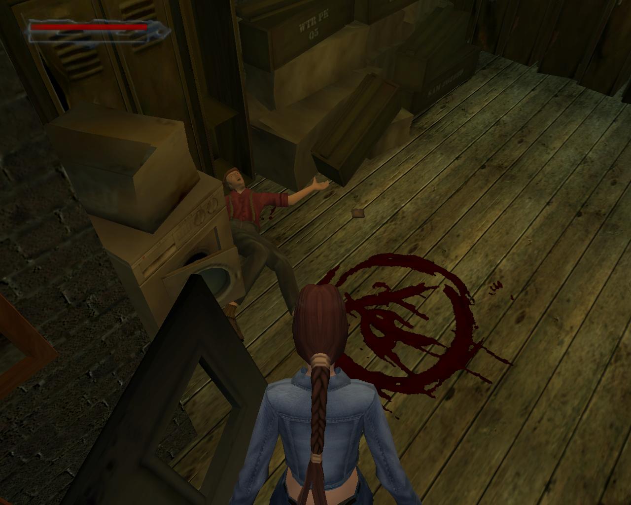 Fordulj meg, és lépj be a pult mögötti raktárba. Rennes vérbefagyva fekszik a földön. Halott. A vérével egy szimbólumot festettek a padlóra. Menj oda Rennes-hez. A halálsikolya még mindig az arcán ül. Jobbra tole a földre esett a tárcája. Vedd fel, és nézz bele (Enter a menüben). Egy cetlit találsz bent, rajta egy ötjegyu számmal: 14529. Fordulj jobbra és menj a raktár hátsó részébe. A fémszekrények mögött balra valami pittyeg. Menj közelebb. A padlóban van egy csapóajtó.