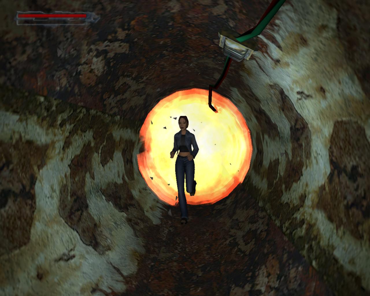Ez egy másodpercre kiszámított idozített esemény. Villámgyorsnak kell lenned. Abban a pillanatban, amint visszakaptad az irányítást, rohanj a polcoktól jobbra lévo sárga kapcsolóhoz és nyomd meg (a legjobb, ha a lézerek megjelenésekor azonnal odaszaladsz). Várd meg, míg az ajtó kinyílik, és fuss ki rajt, majd jobbra a csapóajtóhoz. (A raktár ajtajához hiába mennél, mert azt is lézerek zárják el). Nyisd fel a csapóajtót, és ugorj le (az a leggyorsabb, ha megnyomod a Gurulás-gombot). Ha Lara megkapaszkodik, akkor idot veszítesz, ráadásul meg is kell fordulnod. Így is meg lehet csinálni, de igyekezz ezt elkerülni. A kis folyosó túlsó végén van egy lejárat a padlóban. Fuss oda, ahogy csak bírsz, és ess le itt. Egy csatornacsobe jutsz. Fordulj balra, és futás!!! A lángok már Lara hátát mardossák.