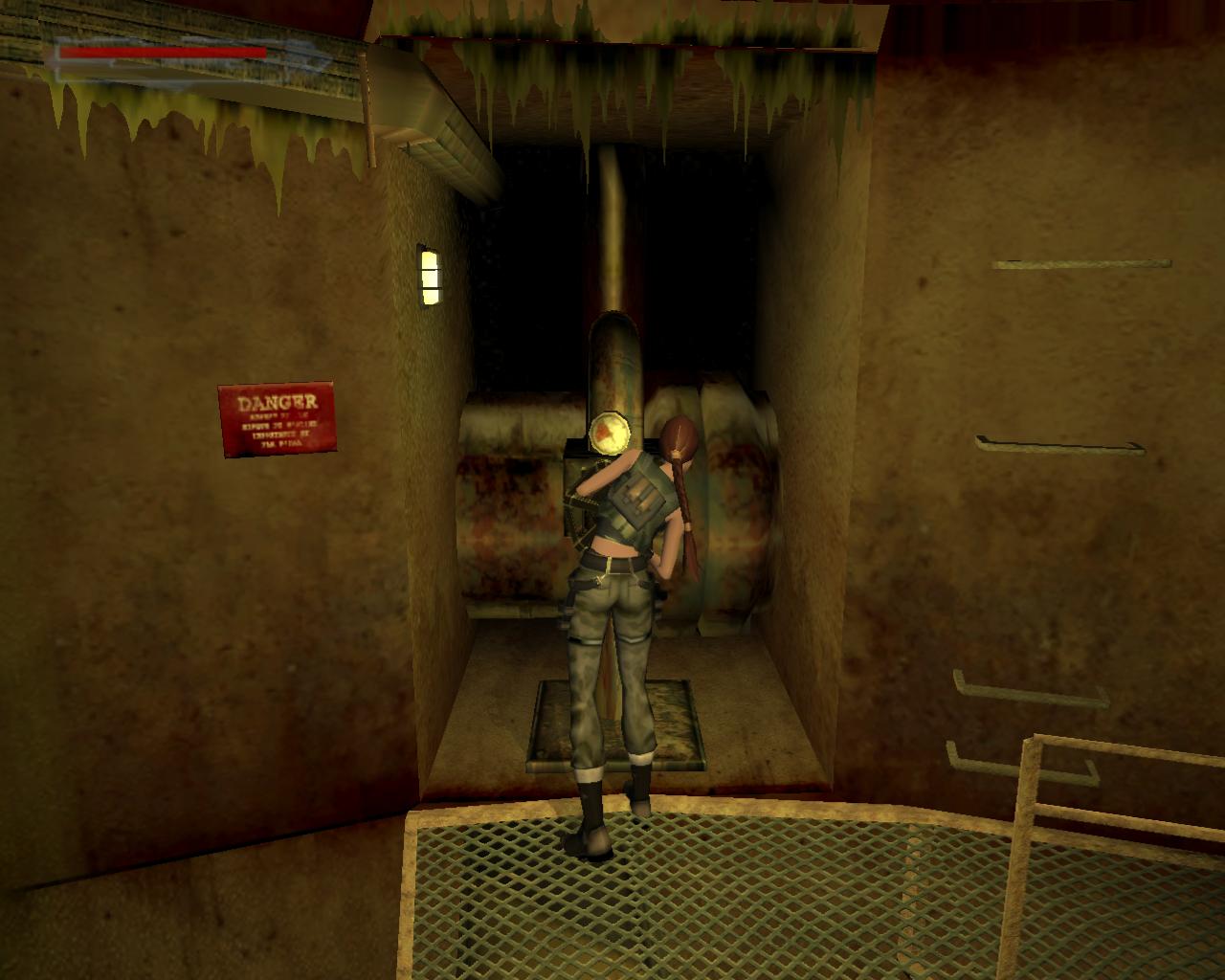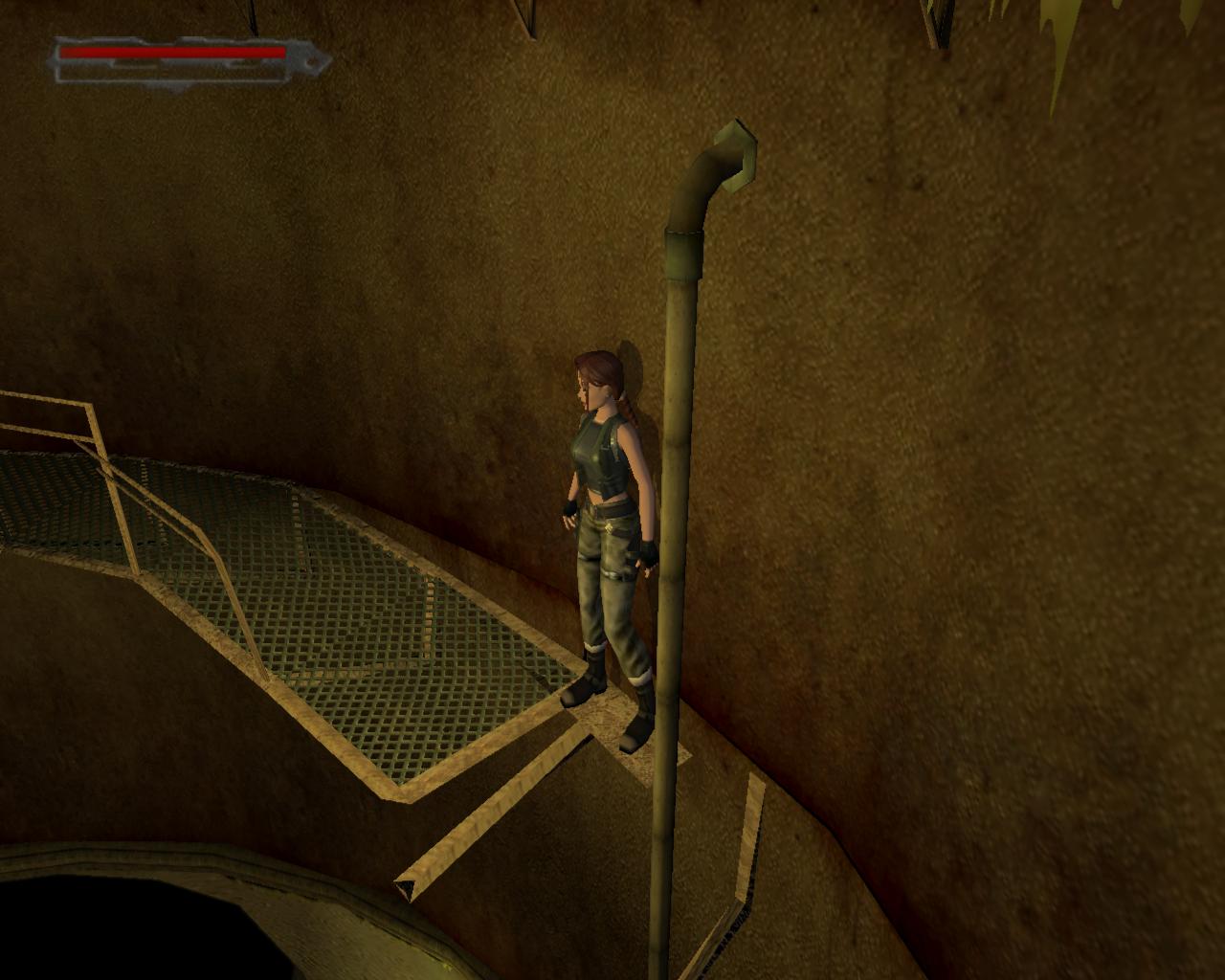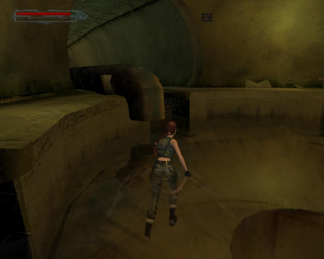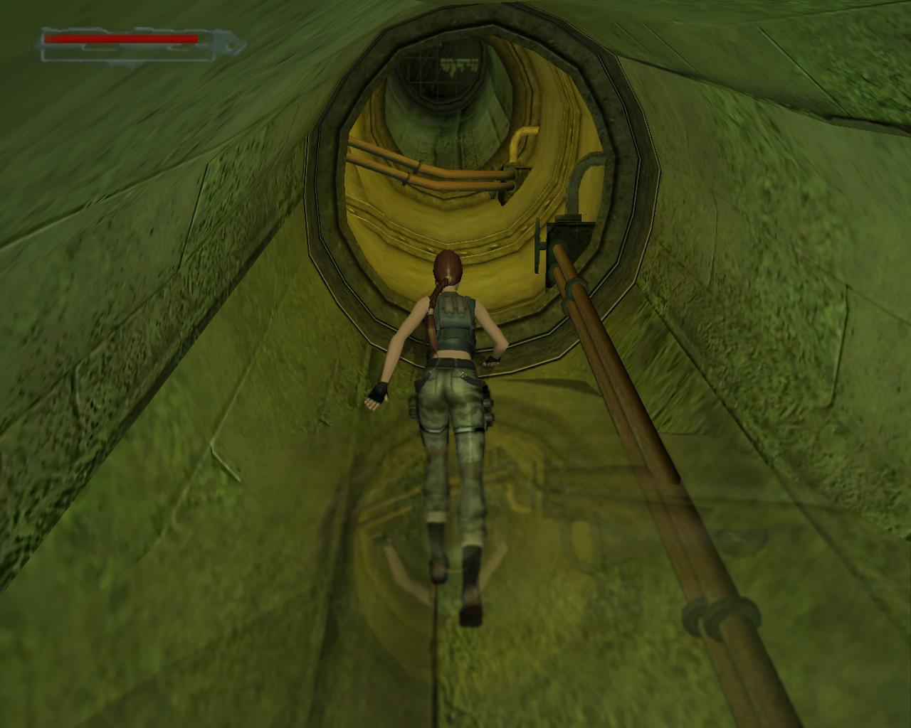 Nézz fel. A fejed fölött egy cso húzódik. Fordulj balra, ugorj fel, kapd el a csövet, és kezdj el függeszkedni. Félúton ess le a sárga-fekete hídra. Fordulj balra, és sétálj végig a hídon. A végénél egy szelep van. Ezt elforgatva már csak egy piros lámpa marad, a többi zöld. Sétálj vissza a híd közepére, pontosan a cso alá, és fordulj balra. Ugorj fel, kapaszkodj meg bent, majd fügeszkedj át a szemközti platform fölé. Ess le rá. Balra van egy leszakadt platform, amin fel tudsz mászni. Larának még az sem okoz gondot, hogy a teteje kijebb van, mint az alja. Felérve fuss körbe balra. (A fejed feletti platformra a létra helyénél felugorva tudsz felkapaszkodni). Jobbra lesz egy vastag cso a falban, egy ugyanolyan, mint amibol a víz folyik az eredeti gyujtocsatornában, ahonnan jöttél. Azonban itt nincs víz. A cso egy fémráccsal le van zárva. Sétálj tovább a platform végéhez. Lara így szól: