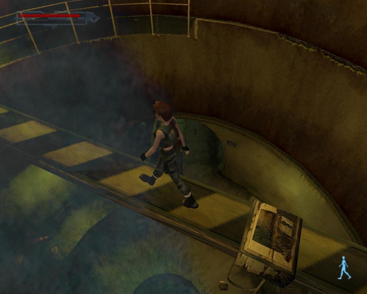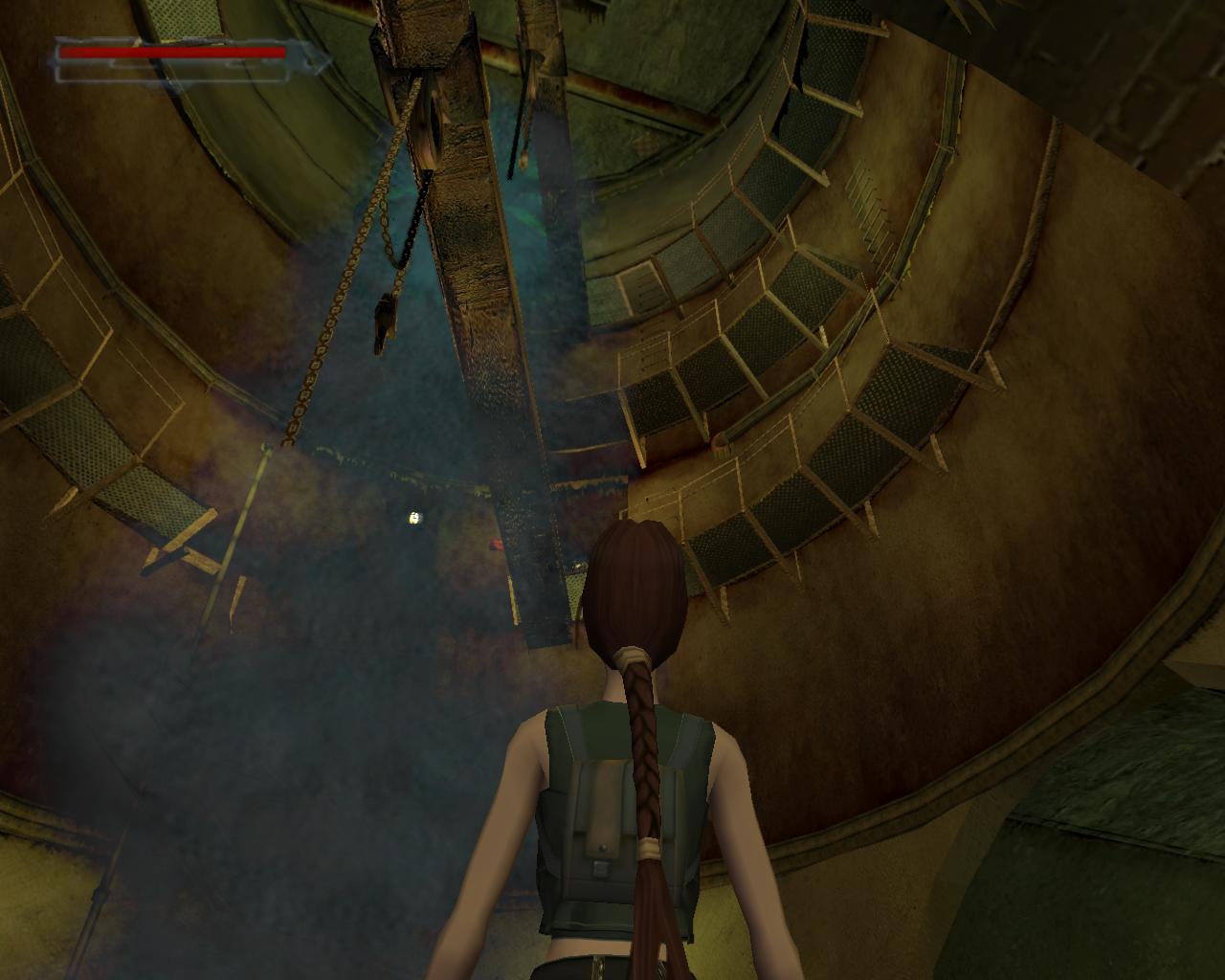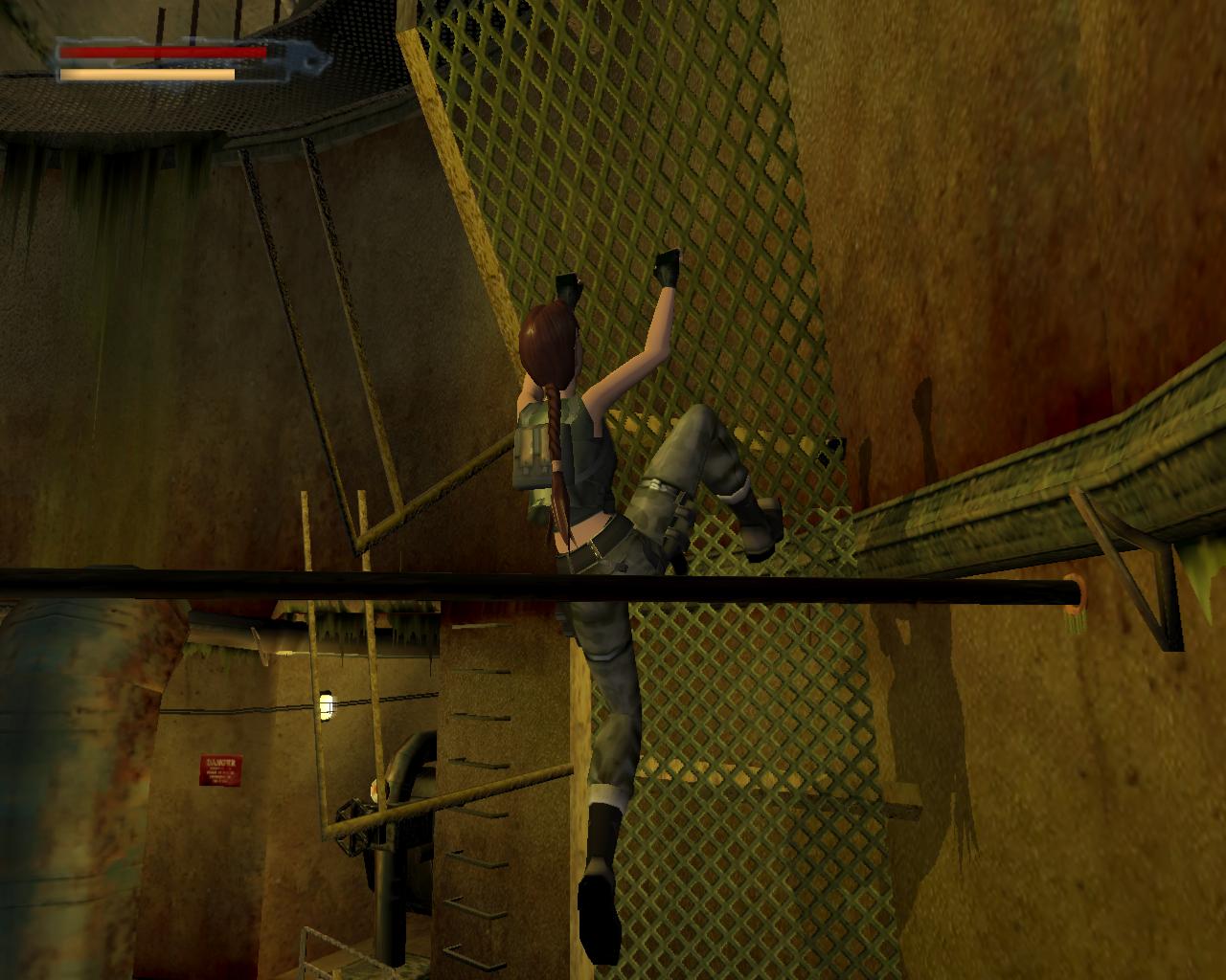 Nézz fel. A fejed fölött egy cso húzódik. Fordulj balra, ugorj fel, kapd el a csövet, és kezdj el függeszkedni. Félúton ess le a sárga-fekete hídra. Fordulj balra, és sétálj végig a hídon. A végénél egy szelep van. Ezt elforgatva már csak egy piros lámpa marad, a többi zöld. Sétálj vissza a híd közepére, pontosan a cso alá, és fordulj balra. Ugorj fel, kapaszkodj meg bent, majd fügeszkedj át a szemközti platform fölé. Ess le rá. Balra van egy leszakadt platform, amin fel tudsz mászni. Larának még az sem okoz gondot, hogy a teteje kijebb van, mint az alja. Felérve fuss körbe balra. (A fejed feletti platformra a létra helyénél felugorva tudsz felkapaszkodni). Jobbra lesz egy vastag cso a falban, egy ugyanolyan, mint amibol a víz folyik az eredeti gyujtocsatornában, ahonnan jöttél. Azonban itt nincs víz. A cso egy fémráccsal le van zárva. Sétálj tovább a platform végéhez. Lara így szól: