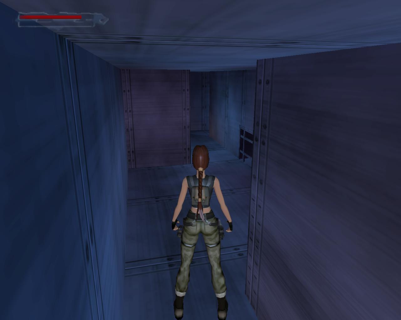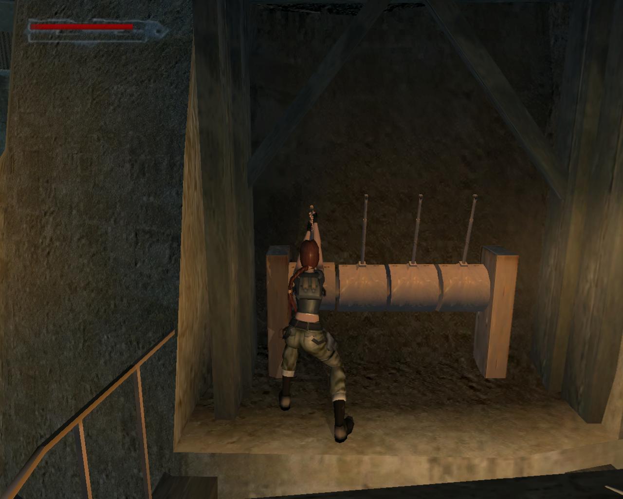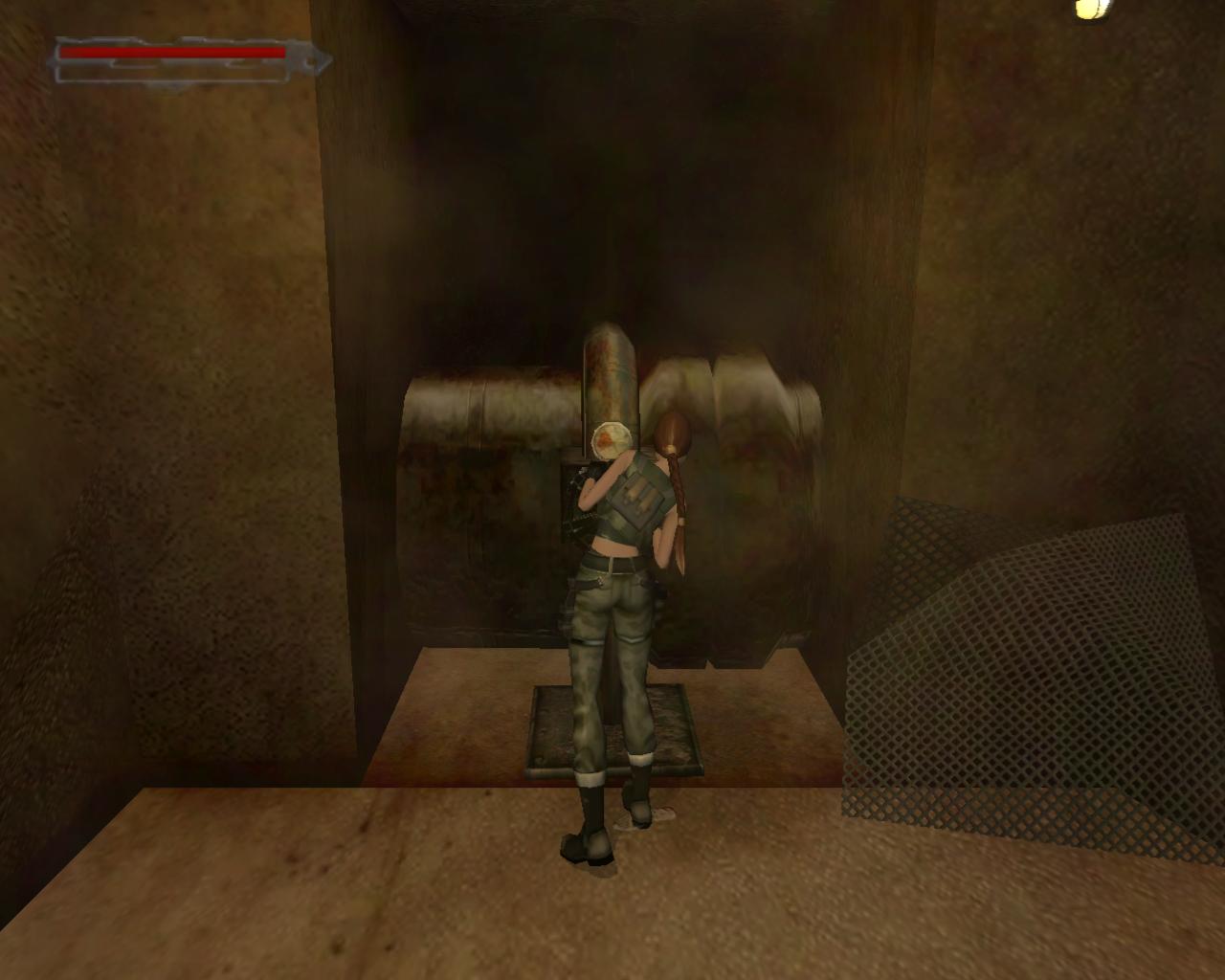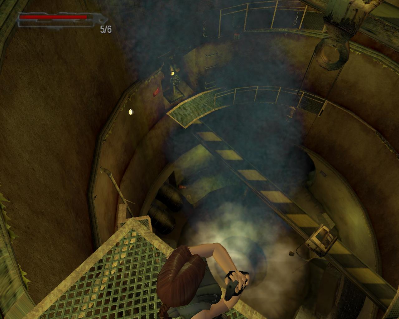 Nézz fel. A fejed fölött egy cso húzódik. Fordulj balra, ugorj fel, kapd el a csövet, és kezdj el függeszkedni. Félúton ess le a sárga-fekete hídra. Fordulj balra, és sétálj végig a hídon. A végénél egy szelep van. Ezt elforgatva már csak egy piros lámpa marad, a többi zöld. Sétálj vissza a híd közepére, pontosan a cso alá, és fordulj balra. Ugorj fel, kapaszkodj meg bent, majd fügeszkedj át a szemközti platform fölé. Ess le rá. Balra van egy leszakadt platform, amin fel tudsz mászni. Larának még az sem okoz gondot, hogy a teteje kijebb van, mint az alja. Felérve fuss körbe balra. (A fejed feletti platformra a létra helyénél felugorva tudsz felkapaszkodni). Jobbra lesz egy vastag cso a falban, egy ugyanolyan, mint amibol a víz folyik az eredeti gyujtocsatornában, ahonnan jöttél. Azonban itt nincs víz. A cso egy fémráccsal le van zárva. Sétálj tovább a platform végéhez. Lara így szól: