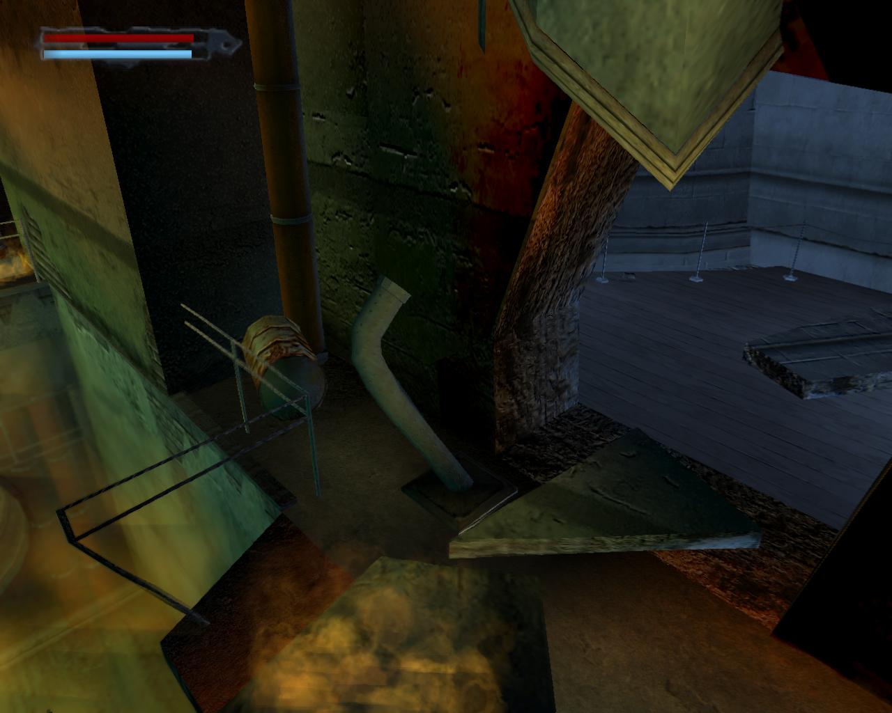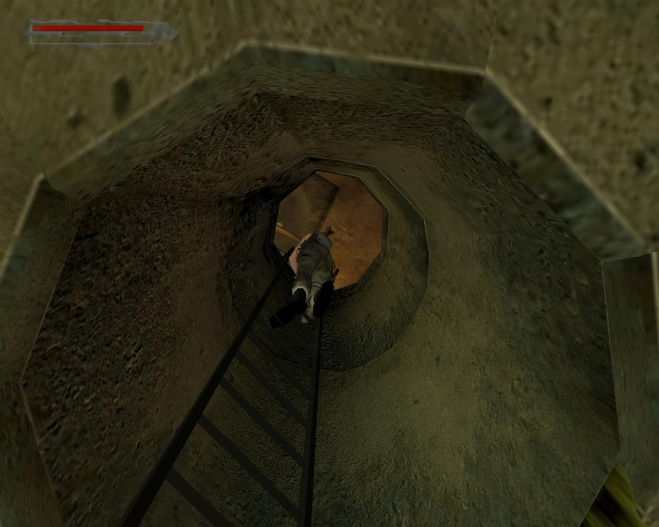 2. Fordulj balra, és a létrán mássz fel a kis teraszra. Fordulj jobbra, és menj a szemközti végéhez. Mássz le az itt található létrán. Fordulj meg, és menj tovább. A falhoz érve fordulj jobbra, és az olajtartályt megkerülve haladj egyenesen elore, míg balra meg nem látsz egy felfelé vezeto létrát a falon. (Elotte jobbra van egy kis létra, ami a medencébe vezet).