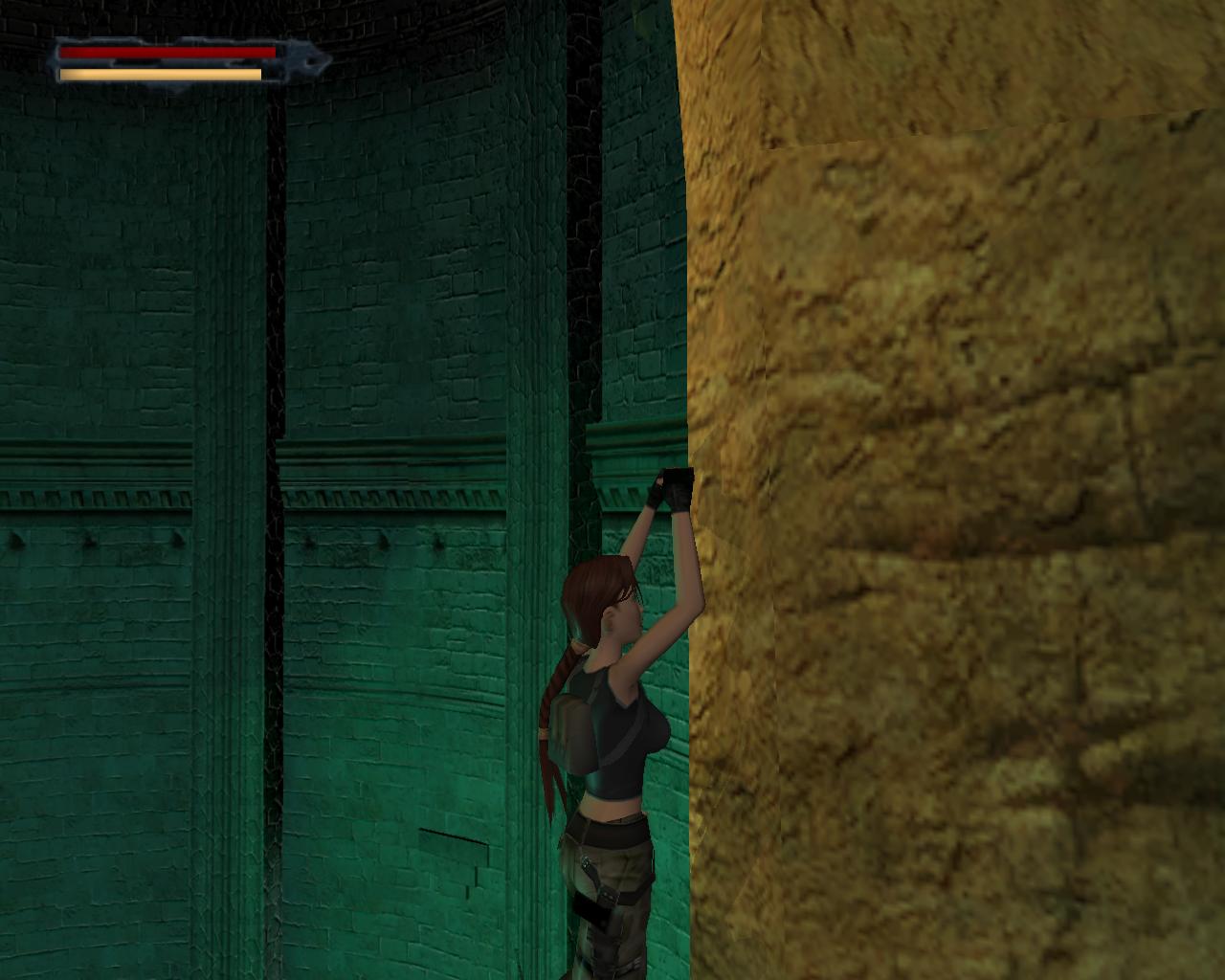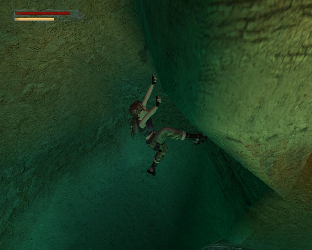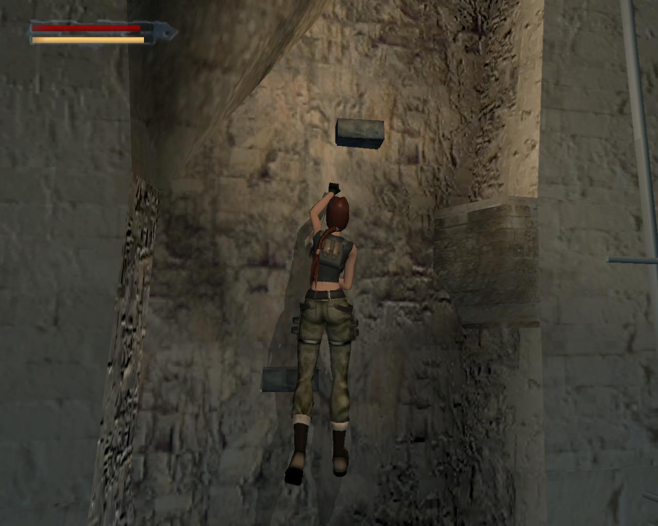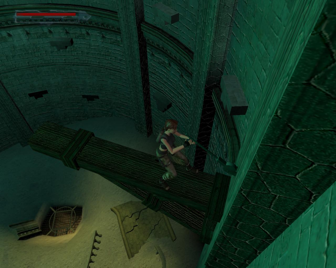 A díszes fémajtó zárva van, így ki kell sétálnod a törött hídra. Nekifutással lendületet véve ugorj át a híd másik részére. A folyosóra beszaladva kötszereket vehetsz fel, azonban egy denevér is megjelenik a hátad mögött, és ha nem lövöd le gyorsan, akkor jól rád akaszkodik. Menj vissza a hídra, és vedd elo ismét a pisztolyodat. Lara ismét céloz, de ezúttal egy olyan denevérre, ami egyébként nem jelenne meg a pálya folyamán. Ha akarod lodd le, de ez nem szükséges. Menj a híd jobb szélére, és nézz le. Megfigyelheted, hogy az egyik vízköpo hiányzik. Fuss neki, és átugorva kapaszkodj meg a talapzatában. Húzódzkodj fel, és fordulj balra. Ugorj át a következo vízköpo mellé. Kapaszkodj le, és függeszkedj el alatta, körbe a sarkon, majd ess le az alattad lévo keskeny, homokos peremre. Ennek a közepénél le tudsz kapaszkodni, és a résekben megkapaszkodva lemászni. A bal kéz felöli fal szintén repedezett, így meg tudsz rajta kapaszkodni. Mássz balra, körbe a sarkon, majd még egyszer ismételd ugyanezt, végül mássz lefelé, egészen az alattad lévo peremre. Fordulj meg és sétálj a perem széléhez, amerre az újabb fagerenda található. Egy sima ugrással át is juthatsz rá. A fal felöli részén egy kar van, amit meghúzva kopárkányok siklanak ki a falból.