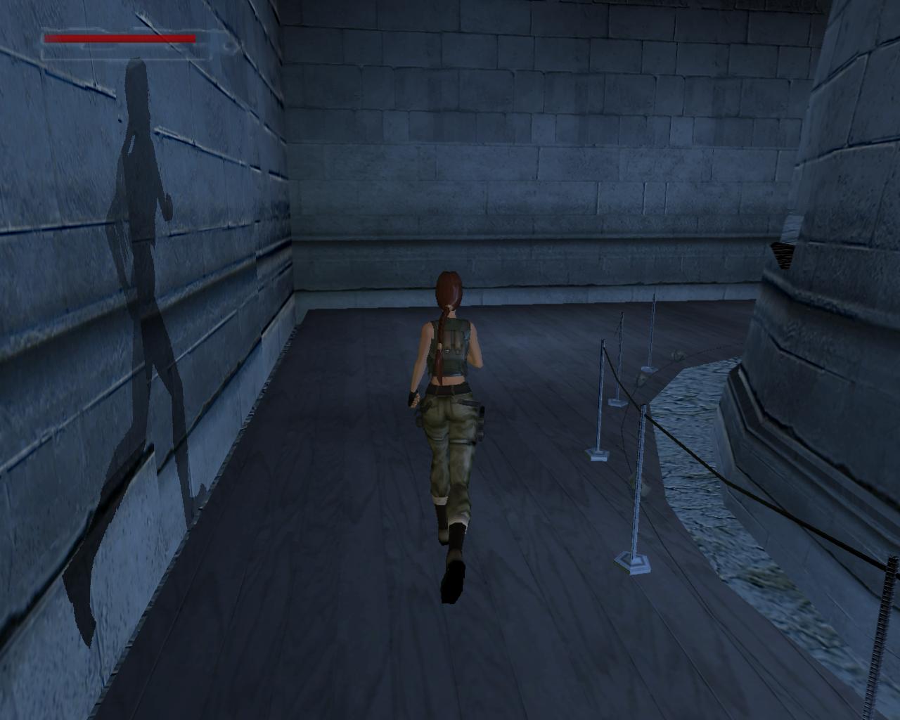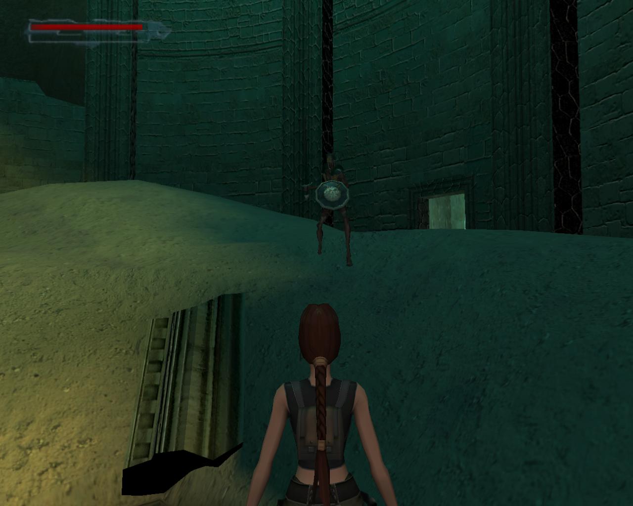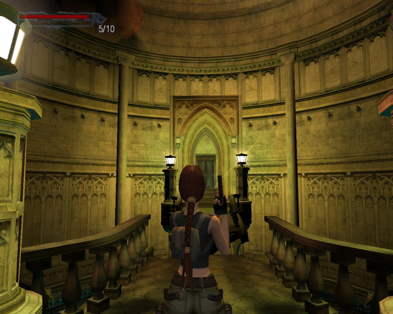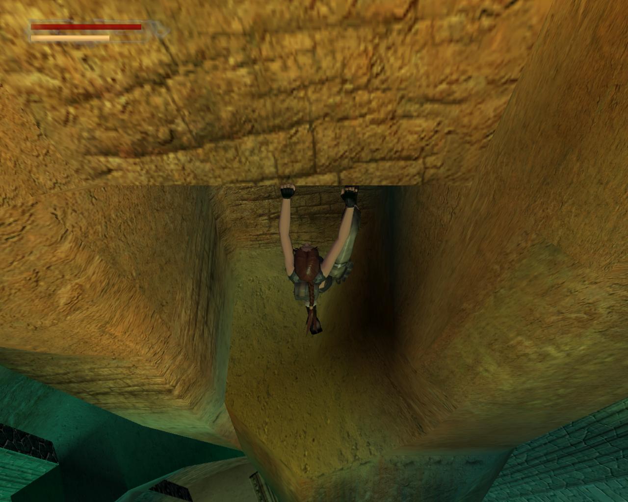 A díszes fémajtó zárva van, így ki kell sétálnod a törött hídra. Nekifutással lendületet véve ugorj át a híd másik részére. A folyosóra beszaladva kötszereket vehetsz fel, azonban egy denevér is megjelenik a hátad mögött, és ha nem lövöd le gyorsan, akkor jól rád akaszkodik. Menj vissza a hídra, és vedd elo ismét a pisztolyodat. Lara ismét céloz, de ezúttal egy olyan denevérre, ami egyébként nem jelenne meg a pálya folyamán. Ha akarod lodd le, de ez nem szükséges. Menj a híd jobb szélére, és nézz le. Megfigyelheted, hogy az egyik vízköpo hiányzik. Fuss neki, és átugorva kapaszkodj meg a talapzatában. Húzódzkodj fel, és fordulj balra. Ugorj át a következo vízköpo mellé. Kapaszkodj le, és függeszkedj el alatta, körbe a sarkon, majd ess le az alattad lévo keskeny, homokos peremre. Ennek a közepénél le tudsz kapaszkodni, és a résekben megkapaszkodva lemászni. A bal kéz felöli fal szintén repedezett, így meg tudsz rajta kapaszkodni. Mássz balra, körbe a sarkon, majd még egyszer ismételd ugyanezt, végül mássz lefelé, egészen az alattad lévo peremre. Fordulj meg és sétálj a perem széléhez, amerre az újabb fagerenda található. Egy sima ugrással át is juthatsz rá. A fal felöli részén egy kar van, amit meghúzva kopárkányok siklanak ki a falból.