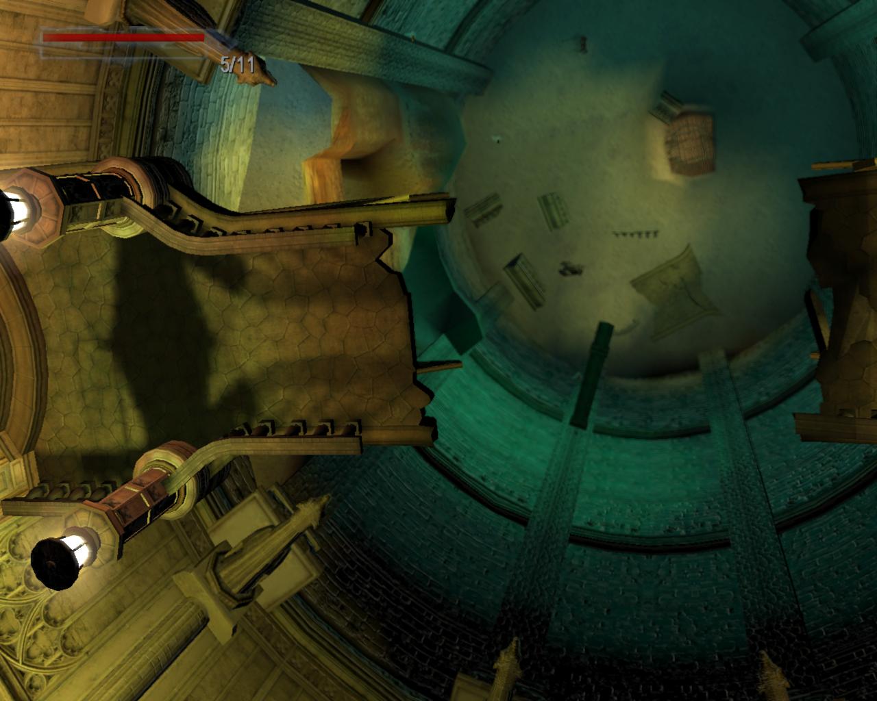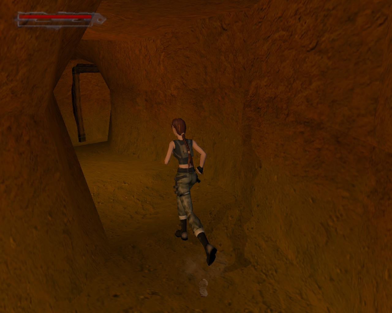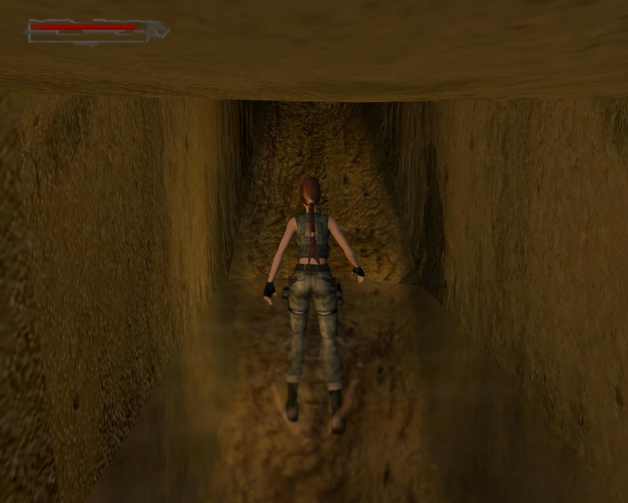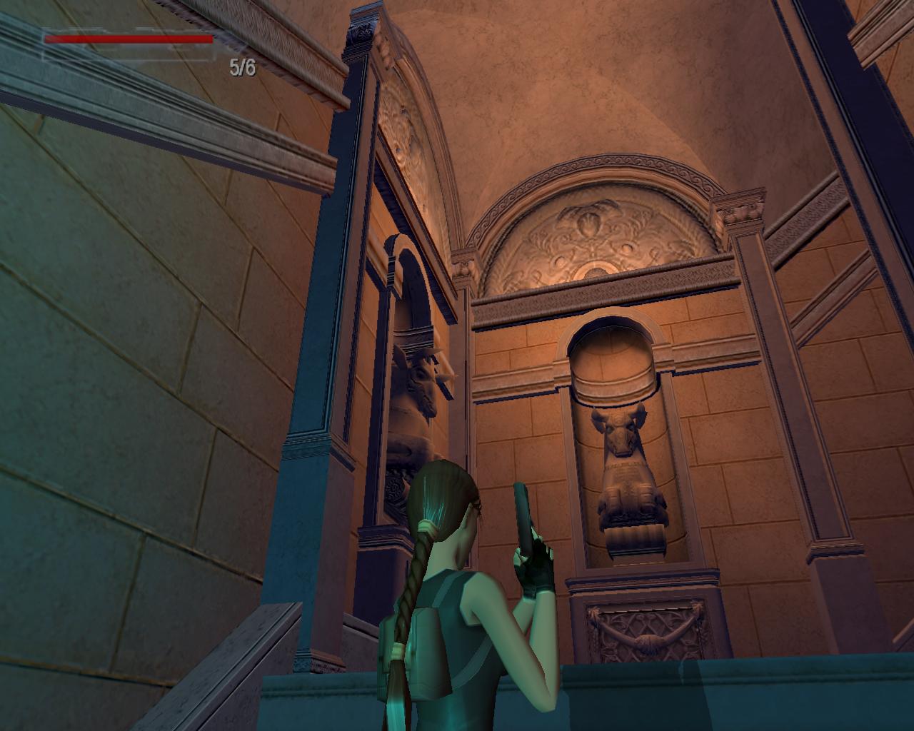 A díszes fémajtó zárva van, így ki kell sétálnod a törött hídra. Nekifutással lendületet véve ugorj át a híd másik részére. A folyosóra beszaladva kötszereket vehetsz fel, azonban egy denevér is megjelenik a hátad mögött, és ha nem lövöd le gyorsan, akkor jól rád akaszkodik. Menj vissza a hídra, és vedd elo ismét a pisztolyodat. Lara ismét céloz, de ezúttal egy olyan denevérre, ami egyébként nem jelenne meg a pálya folyamán. Ha akarod lodd le, de ez nem szükséges. Menj a híd jobb szélére, és nézz le. Megfigyelheted, hogy az egyik vízköpo hiányzik. Fuss neki, és átugorva kapaszkodj meg a talapzatában. Húzódzkodj fel, és fordulj balra. Ugorj át a következo vízköpo mellé. Kapaszkodj le, és függeszkedj el alatta, körbe a sarkon, majd ess le az alattad lévo keskeny, homokos peremre. Ennek a közepénél le tudsz kapaszkodni, és a résekben megkapaszkodva lemászni. A bal kéz felöli fal szintén repedezett, így meg tudsz rajta kapaszkodni. Mássz balra, körbe a sarkon, majd még egyszer ismételd ugyanezt, végül mássz lefelé, egészen az alattad lévo peremre. Fordulj meg és sétálj a perem széléhez, amerre az újabb fagerenda található. Egy sima ugrással át is juthatsz rá. A fal felöli részén egy kar van, amit meghúzva kopárkányok siklanak ki a falból.