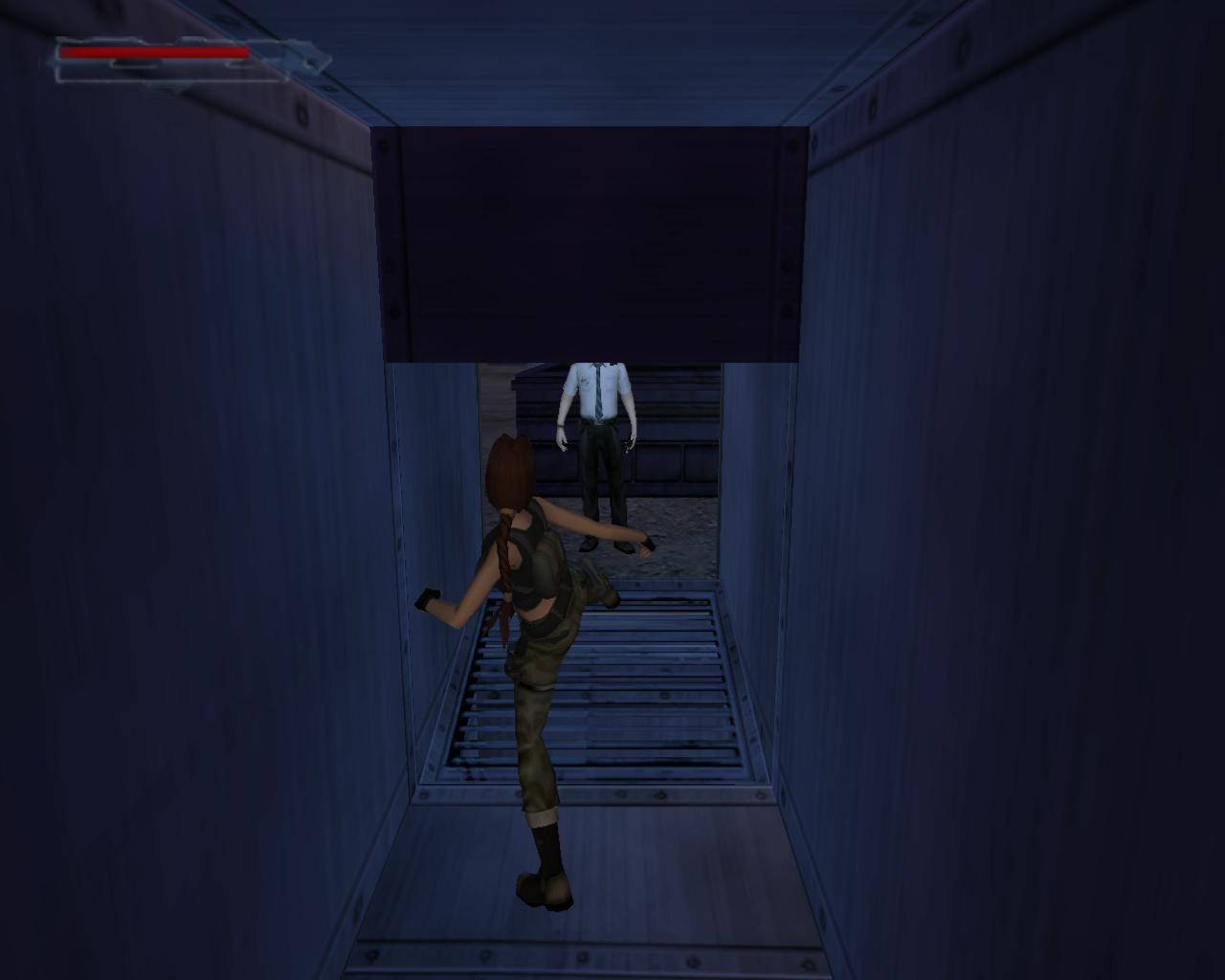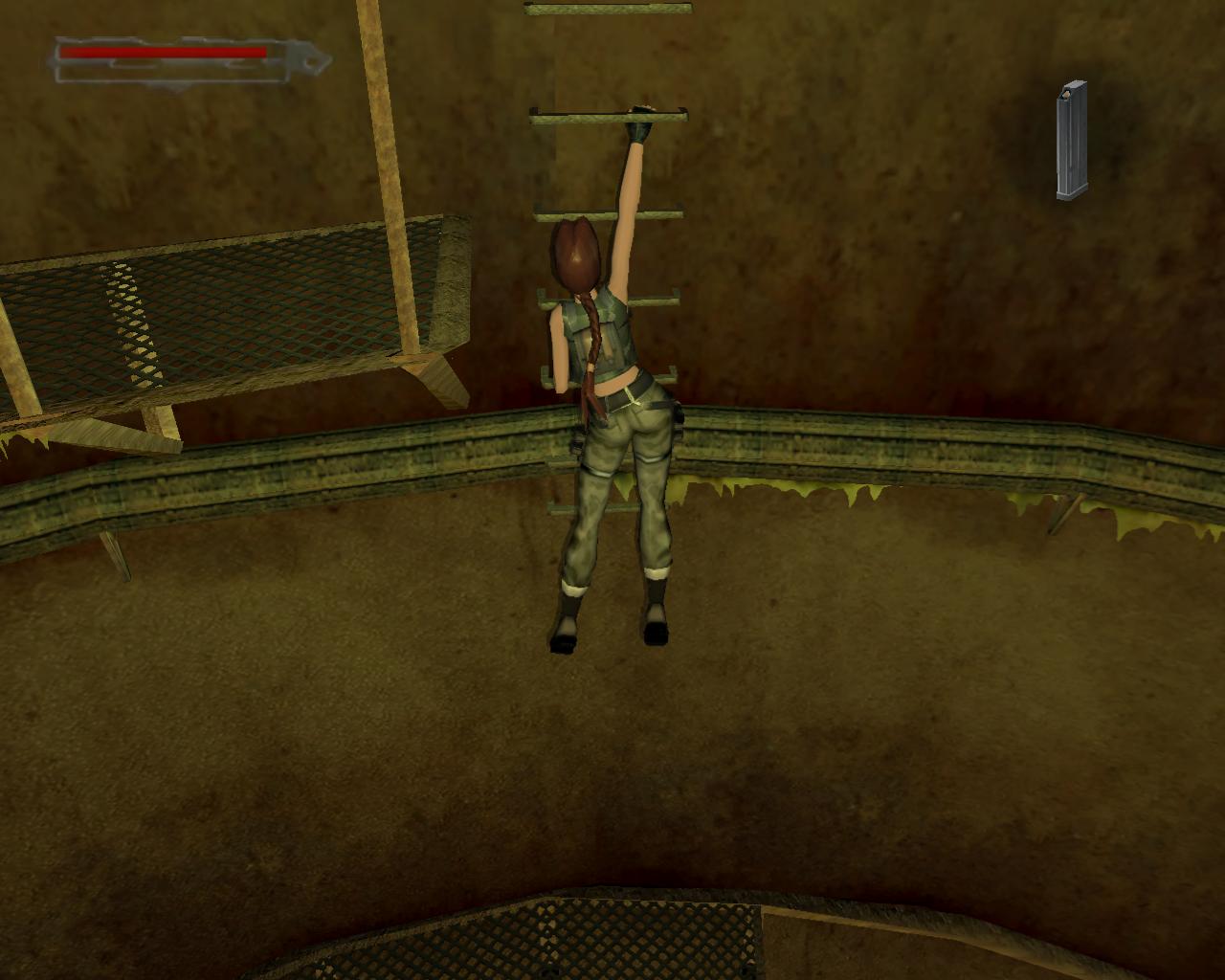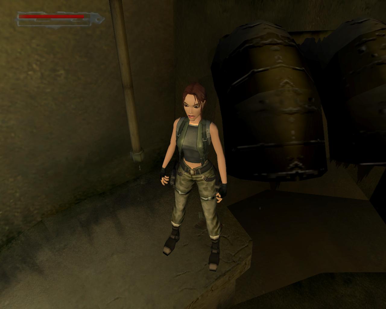 Mássz fel a létrán, és a tetején szállj le a baloldali platformra. Fordulj meg, hogy szemben állj a két olajtartállyal. Áll közvetlenül a platform szélére, és fordulj kissé jobbra, a tartályok elott lévo kis koplatform irányába. Ugorj egyet elore. A platformon landolsz, az olajtartályok elott, és Lara megszólal:
