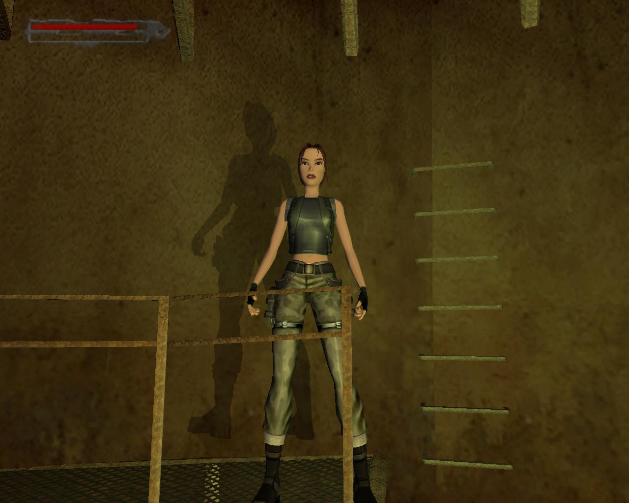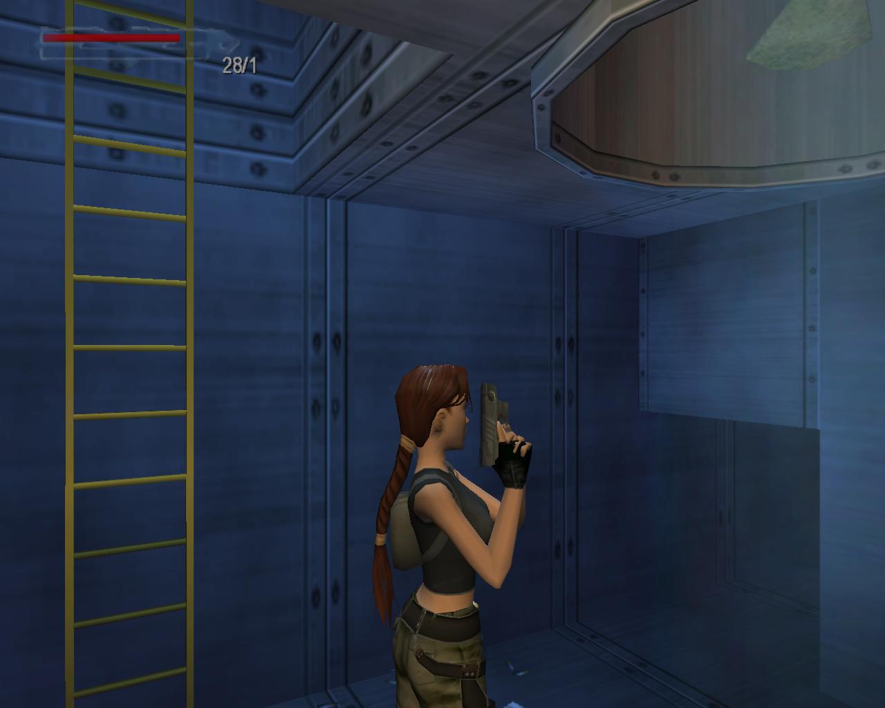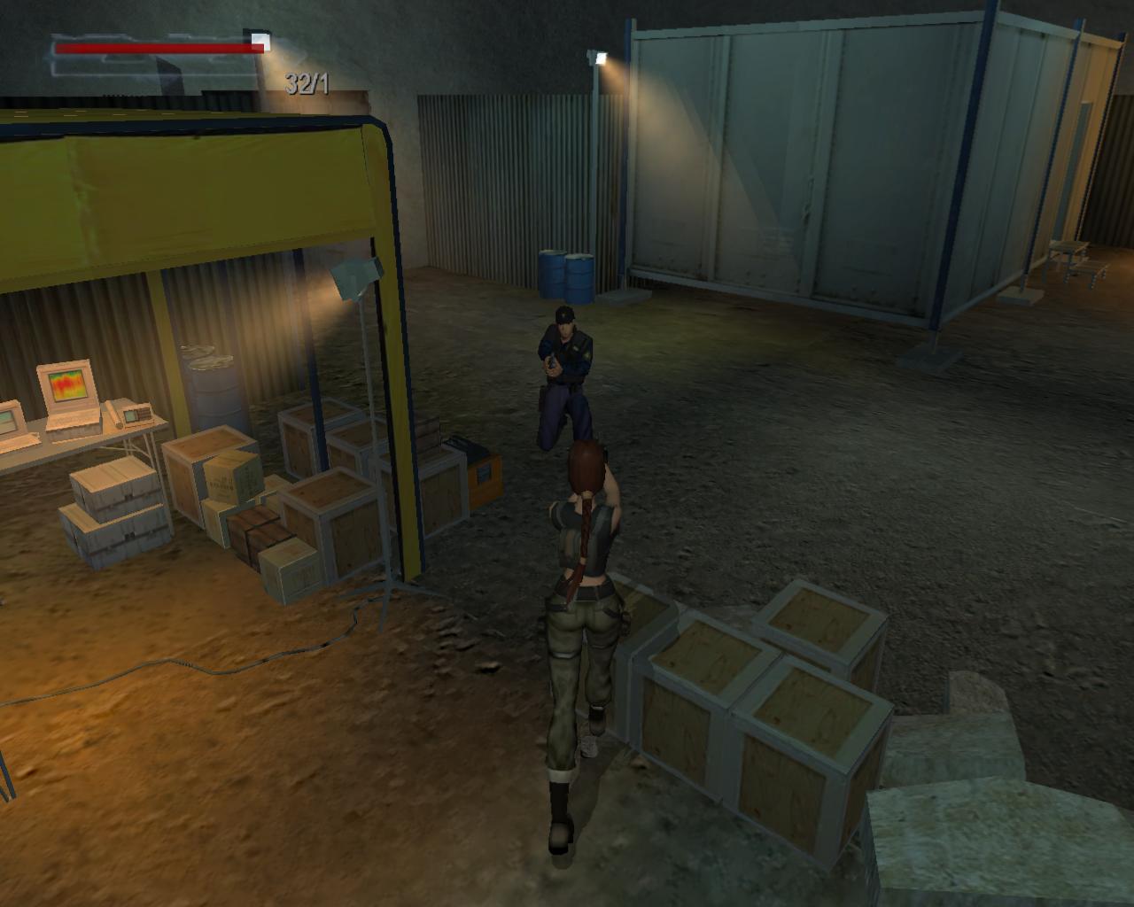 Mássz fel a létrán, és a tetején szállj le a baloldali platformra. Fordulj meg, hogy szemben állj a két olajtartállyal. Áll közvetlenül a platform szélére, és fordulj kissé jobbra, a tartályok elott lévo kis koplatform irányába. Ugorj egyet elore. A platformon landolsz, az olajtartályok elott, és Lara megszólal: