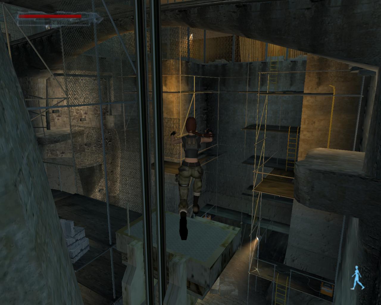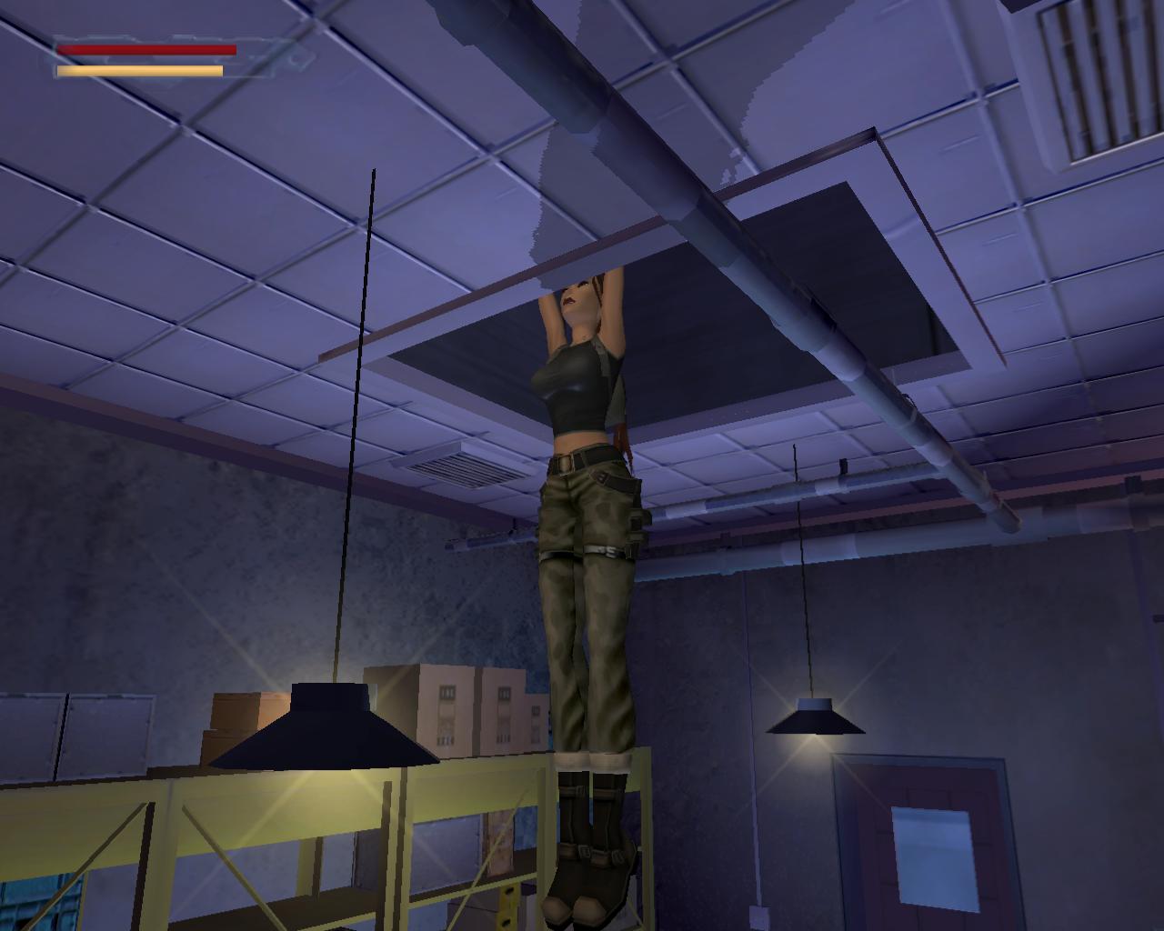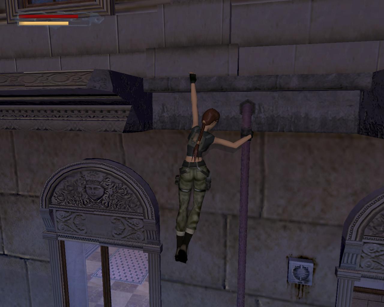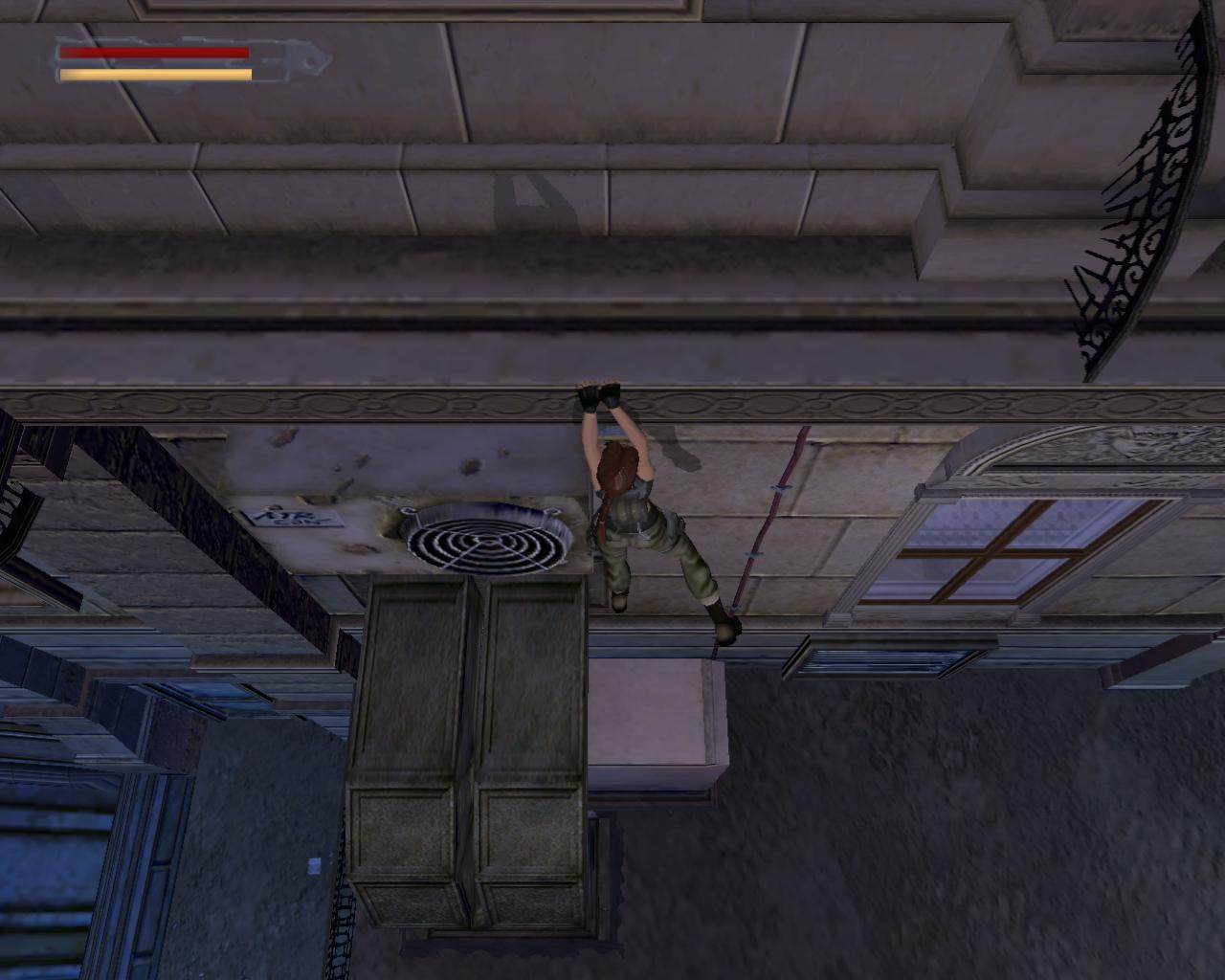 A középen lévo rácsos ajtó sem nyílik. Mássz vissza a szellozohöz. A túloldalon is lemászhatnál, de nem is érdemes próbálkoznod. A szellozovel szemben állva, kissé távolabb, balra van egy magas egység, ami felett szellozocso fut. Mássz fel rá, és fel a keskeny szellozocsövekre. Fordulj szembe a légkondícionálóval, ugorj fel, és kapd el a felette húzódó peremet. Húzódzkodj fel rá. A peremen jobbra indulj, fügeszkedéssel átjutva a peremet lezáró fémrácsok mellett. Egy vezetékhez érsz, ami a levegoben húzódik az épület másik pereméig. Az ablakon benézve egy újabb ort láthatsz, de nem számít arra, hogy innét közelítesz, tehát nem kell tartanod tole. Ugorj fel, kapd el a vezetéket, és függeszkedj át a következo peremere, amilyen gyorsan csak tudsz. Ha gond lenne az eronléteddel, akkor a peremen lógva átfüggeszkedhetsz a kis, kiálló peremre, és onnét is elkezdheted a vezetéken való kapaszkodást. A testmozgás Larának is hasznára vált: