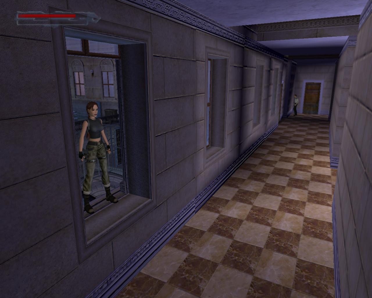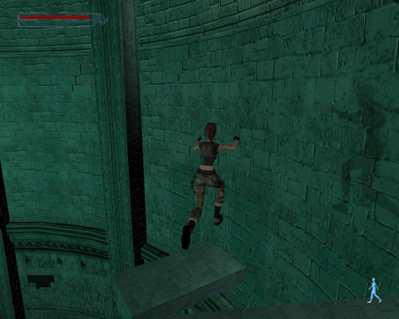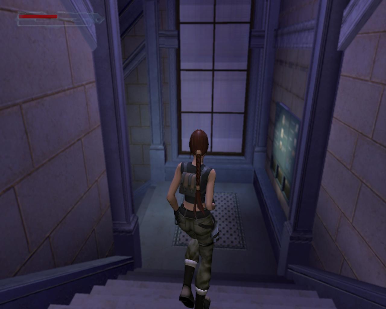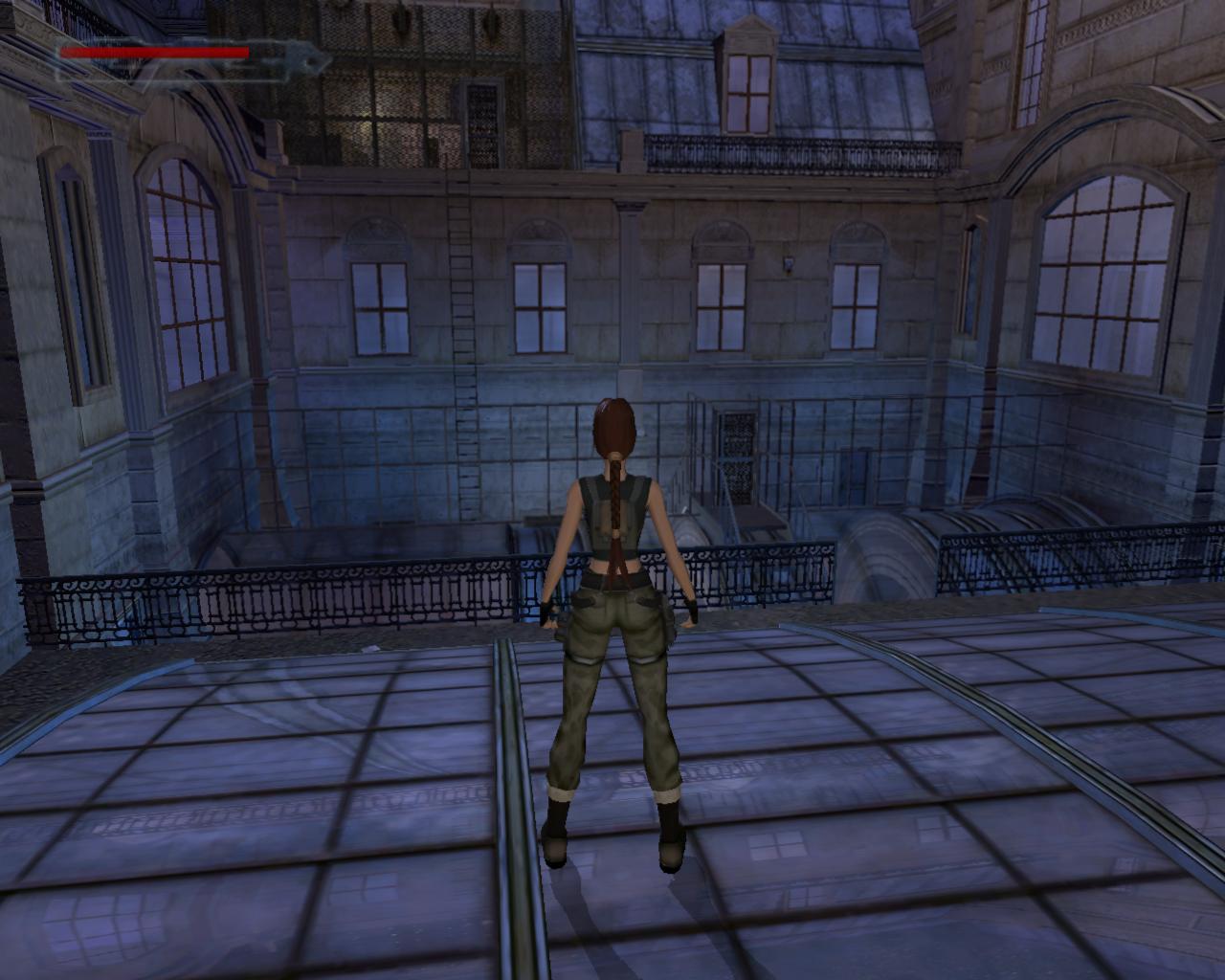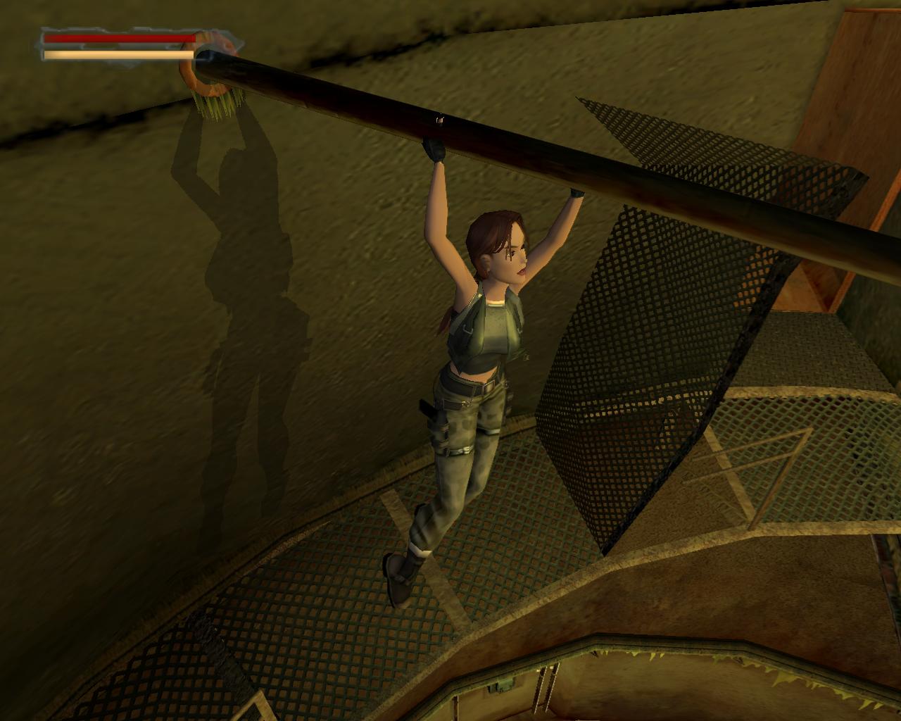 A középen lévo rácsos ajtó sem nyílik. Mássz vissza a szellozohöz. A túloldalon is lemászhatnál, de nem is érdemes próbálkoznod. A szellozovel szemben állva, kissé távolabb, balra van egy magas egység, ami felett szellozocso fut. Mássz fel rá, és fel a keskeny szellozocsövekre. Fordulj szembe a légkondícionálóval, ugorj fel, és kapd el a felette húzódó peremet. Húzódzkodj fel rá. A peremen jobbra indulj, fügeszkedéssel átjutva a peremet lezáró fémrácsok mellett. Egy vezetékhez érsz, ami a levegoben húzódik az épület másik pereméig. Az ablakon benézve egy újabb ort láthatsz, de nem számít arra, hogy innét közelítesz, tehát nem kell tartanod tole. Ugorj fel, kapd el a vezetéket, és függeszkedj át a következo peremere, amilyen gyorsan csak tudsz. Ha gond lenne az eronléteddel, akkor a peremen lógva átfüggeszkedhetsz a kis, kiálló peremre, és onnét is elkezdheted a vezetéken való kapaszkodást. A testmozgás Larának is hasznára vált:
