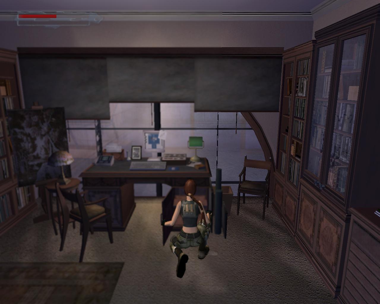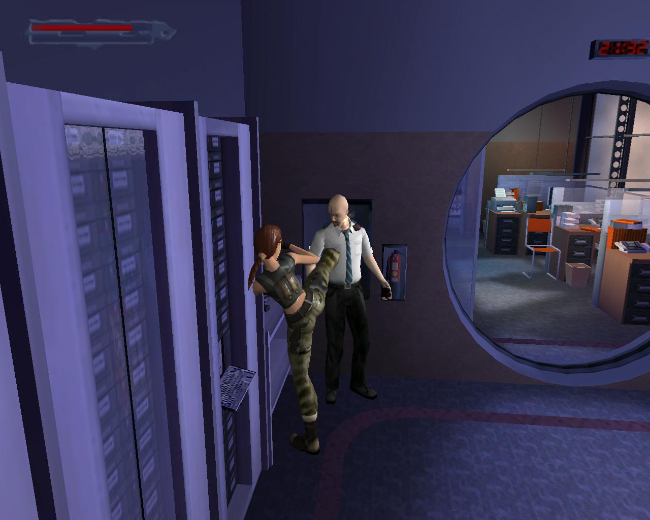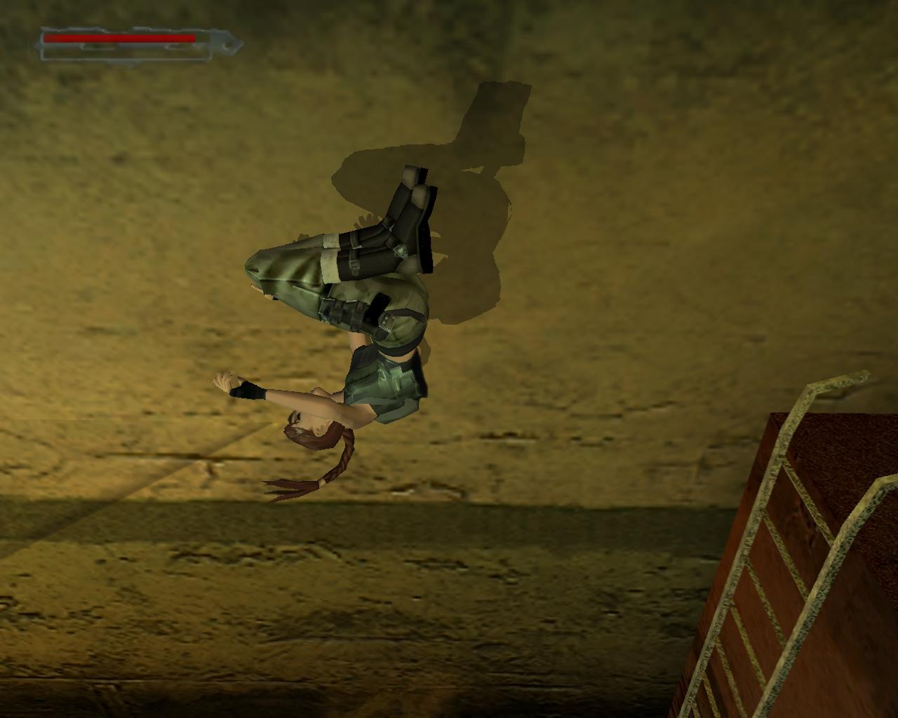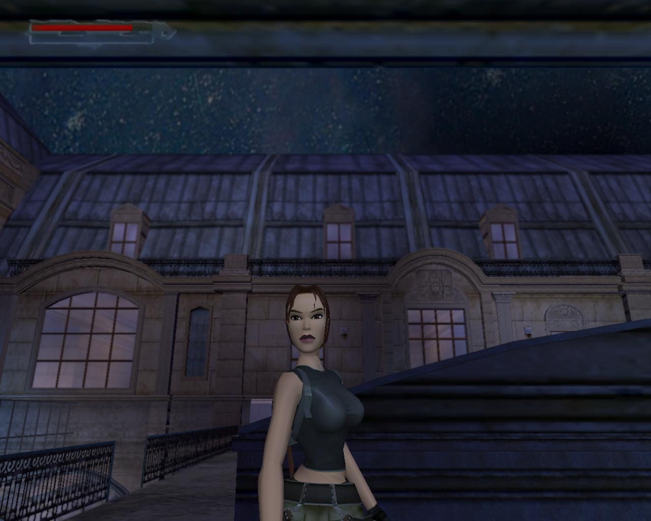 A középen lévo rácsos ajtó sem nyílik. Mássz vissza a szellozohöz. A túloldalon is lemászhatnál, de nem is érdemes próbálkoznod. A szellozovel szemben állva, kissé távolabb, balra van egy magas egység, ami felett szellozocso fut. Mássz fel rá, és fel a keskeny szellozocsövekre. Fordulj szembe a légkondícionálóval, ugorj fel, és kapd el a felette húzódó peremet. Húzódzkodj fel rá. A peremen jobbra indulj, fügeszkedéssel átjutva a peremet lezáró fémrácsok mellett. Egy vezetékhez érsz, ami a levegoben húzódik az épület másik pereméig. Az ablakon benézve egy újabb ort láthatsz, de nem számít arra, hogy innét közelítesz, tehát nem kell tartanod tole. Ugorj fel, kapd el a vezetéket, és függeszkedj át a következo peremere, amilyen gyorsan csak tudsz. Ha gond lenne az eronléteddel, akkor a peremen lógva átfüggeszkedhetsz a kis, kiálló peremre, és onnét is elkezdheted a vezetéken való kapaszkodást. A testmozgás Larának is hasznára vált: