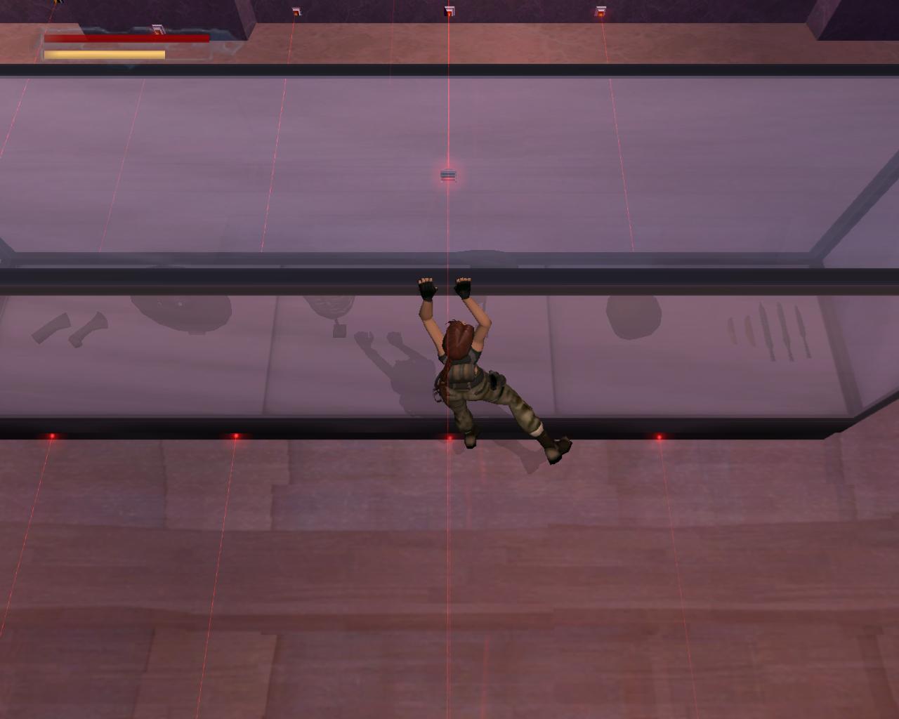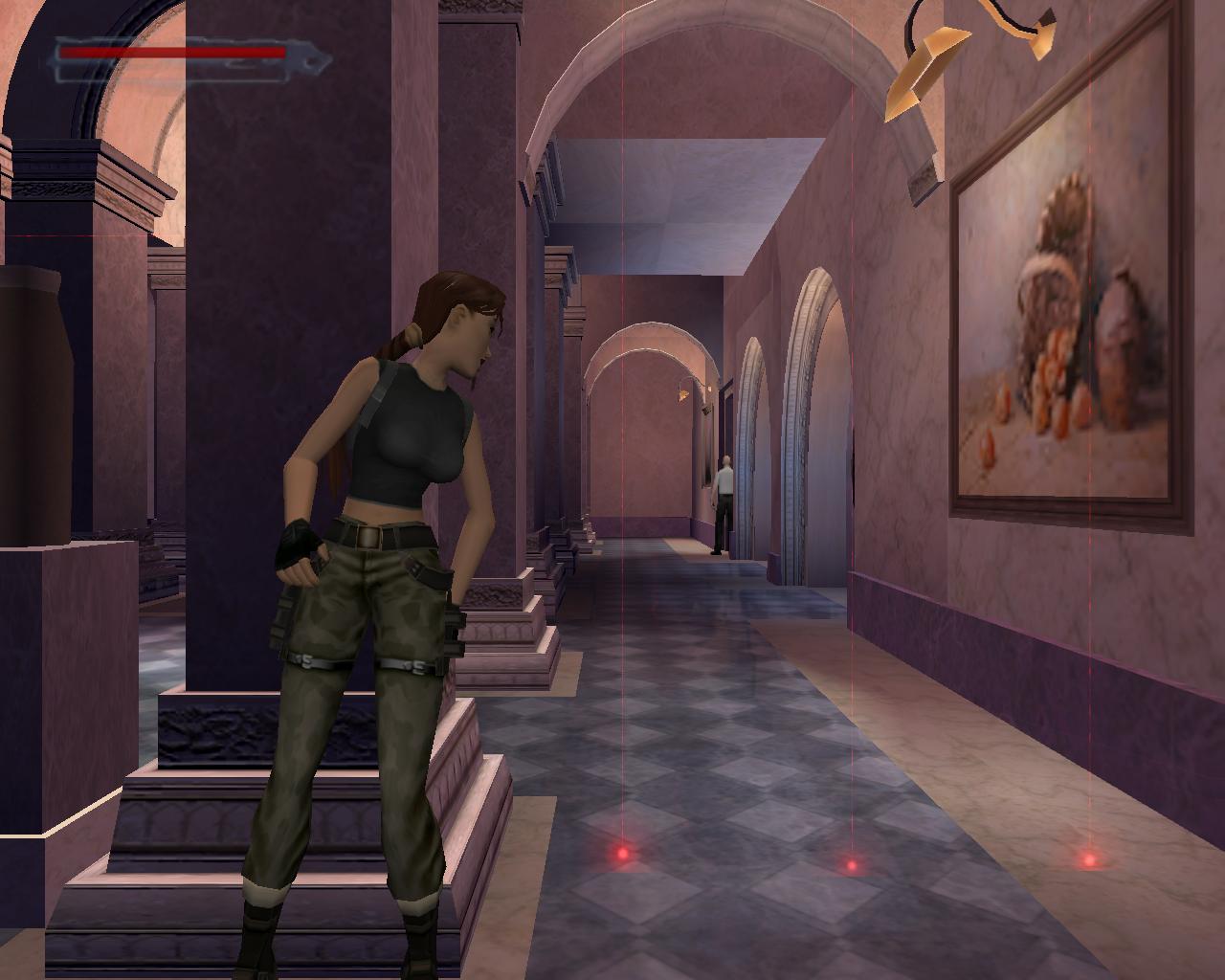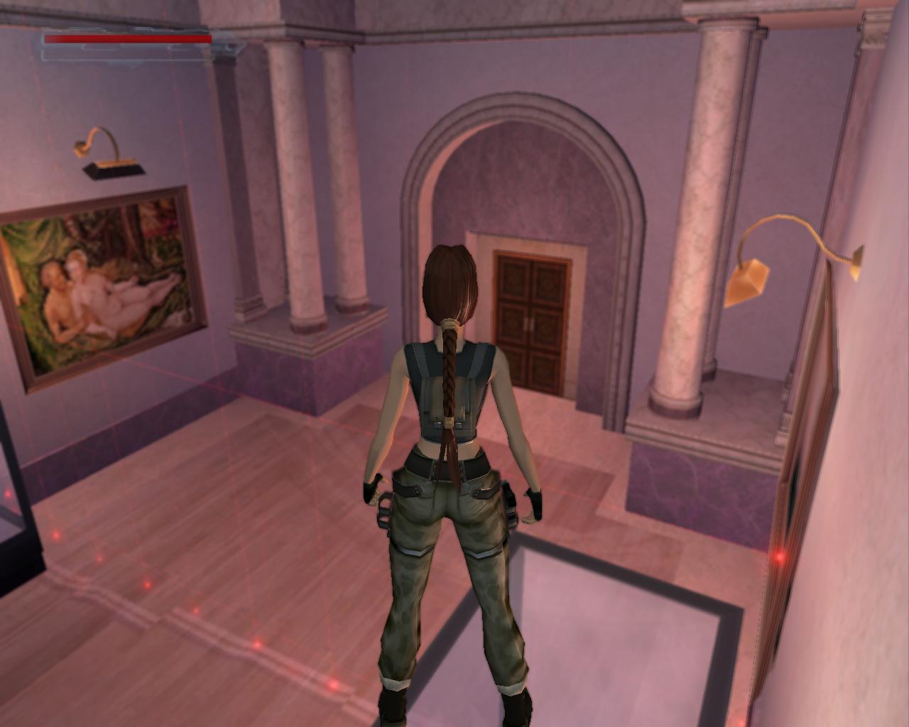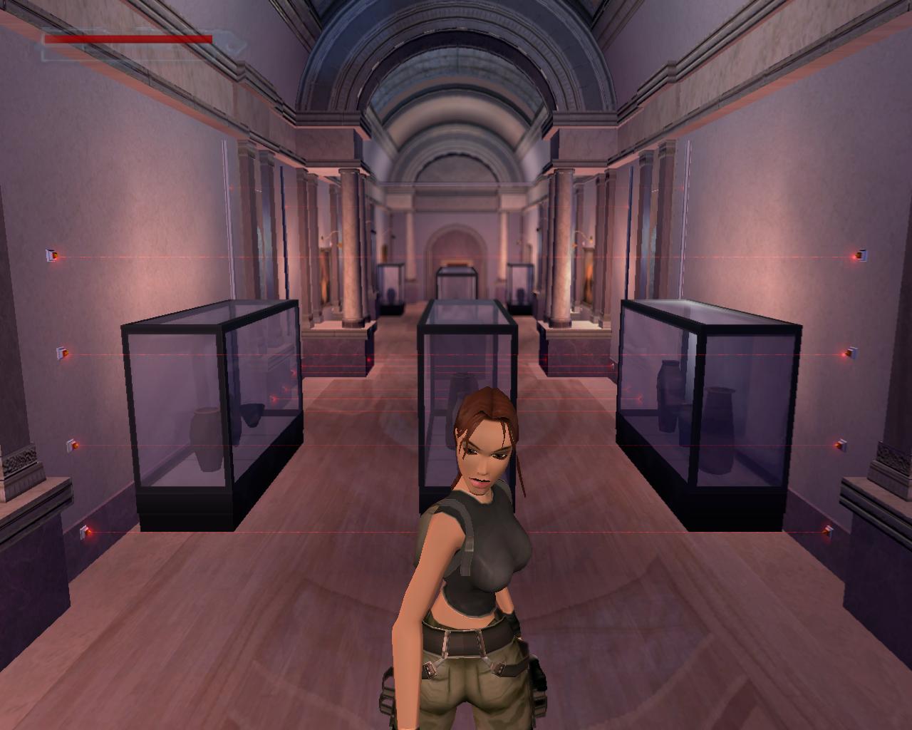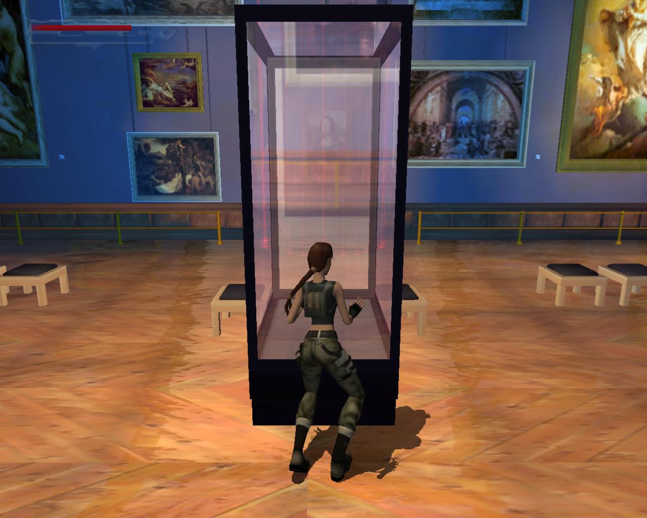 Elég komolyan védik a régiségeket a Louvre-ban; lézerek vannak mindenütt. Ha hozzájuk érsz, a terem másik oldalán lévo ajtót rács fogja lezárni, és egy or is a helyszínre siet. Akkor hogyan jussunk át? Középen van egy alacsony vitrin. Lépj fel rá. Jobbra fordulva megfigyelheted, hogy egy nagy egészségcsomag van a falon lévo díszített kotömbön. Sétálj a vitrin széléhez, és elore ugorva kapaszkodj meg a kotömbön. Mássz fel, vedd fel az egészségcsomagot. Fordulj jobbra, hátrálj egy kicsit, és nekifutásból ugorj át a lézerek felett a szemközti vitrin tetejére. Innét a középso vitrinre kell átjutnod. A padlón lézerek vannak, és elotted is egy mozgó lézer zárja el az utat. Lépj hátra, és amikor a lézer elindul lefelé, fuss neki és ugorj át az elotted lévo, következo vitrinre. Amint ennek a végéhez sétálsz, újabb lézerek jelennek meg elotted. Amikor a villódzó lézer eltunik egy pillanatra, ugorj át a következo vitrinre. Azonban itt is egy lézernyaláb zárja el az utat, a padló is ezekkel van tele, és a vitrin bal oldalán is van egy. Jobboldalt viszont nincs. Menj a vitrin feletti lézerhez, fordulj balra, és függeszkedj le (ha háttal a vitrin szélének egyszerre nyomod le a Séta és az Akció gombokat, akkor Lara mindezt egy hátraszaltó közben teszi), kapaszkodj el jobbra és mielott az erod elfogy, mássz vissza fel. Újabb lézerek jelennek meg, hálósan elzárva az utat. Azonban jobbra van egy nagy vitrin, aminek a tetejérol meg tudsz kapaszkodni a falból kiugró kis szegélyben. Függeszkedj el balra, el a lézerek mellett, és biztonságos távolban ess le. Szaladj az ajtóhoz, és nyisd ki.