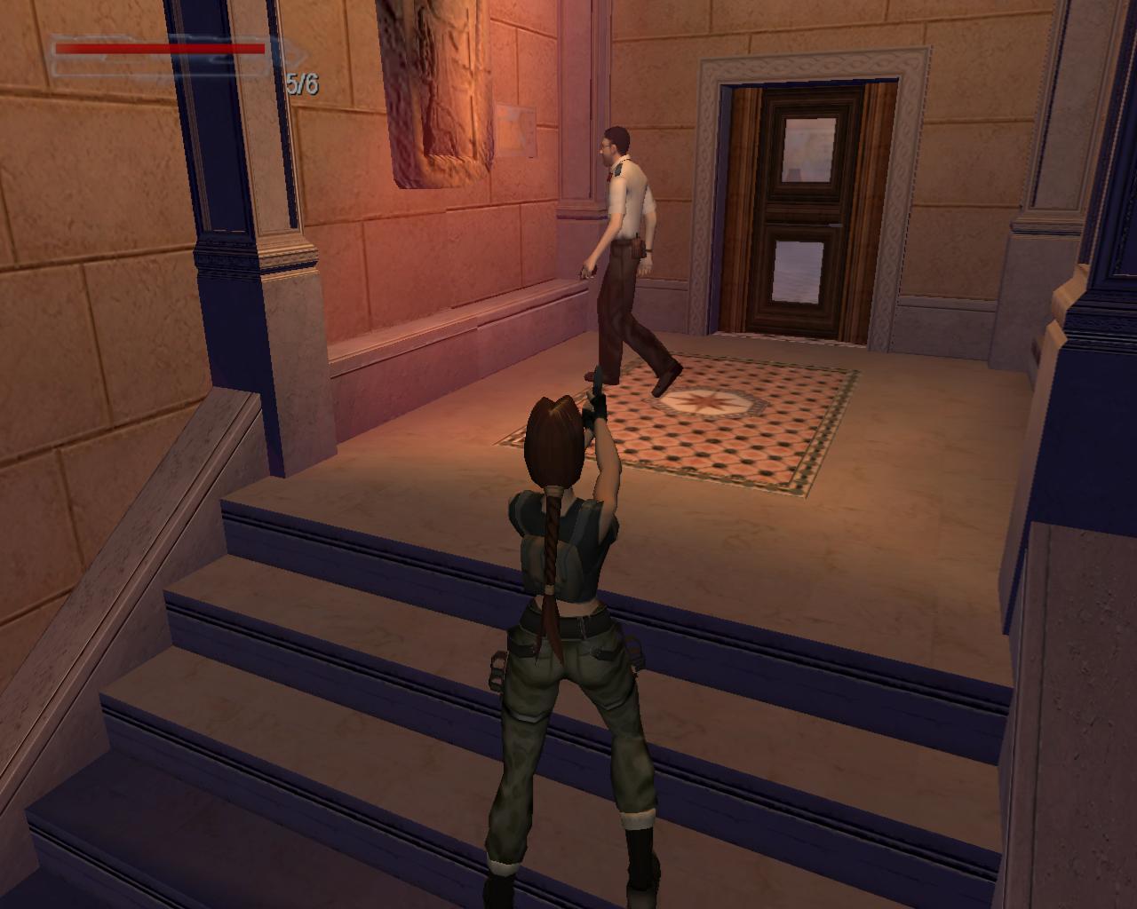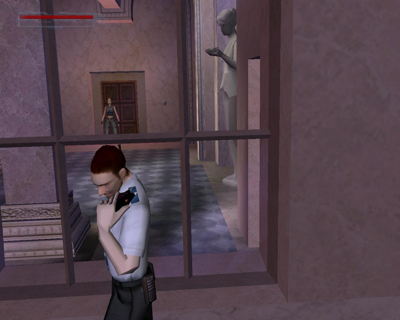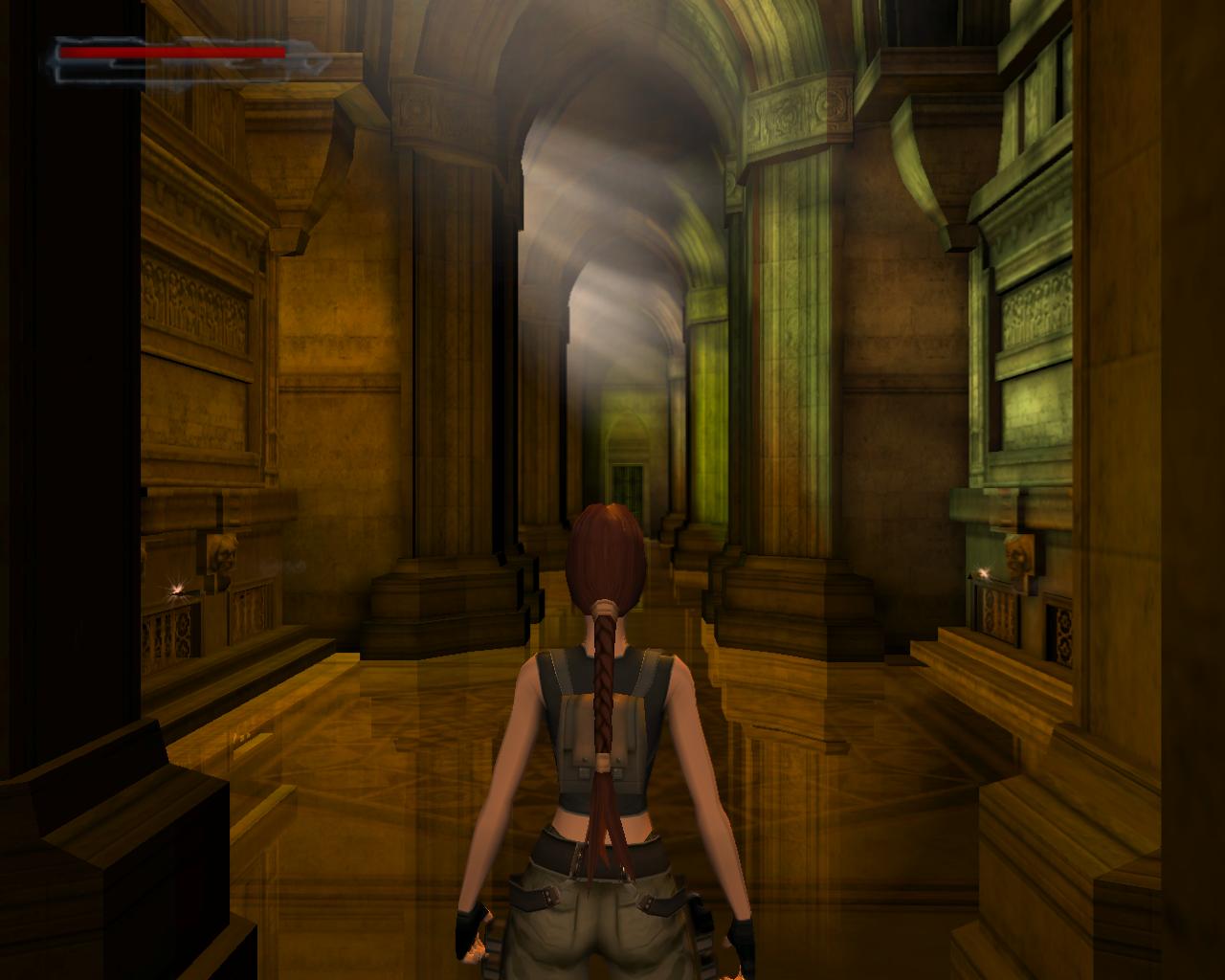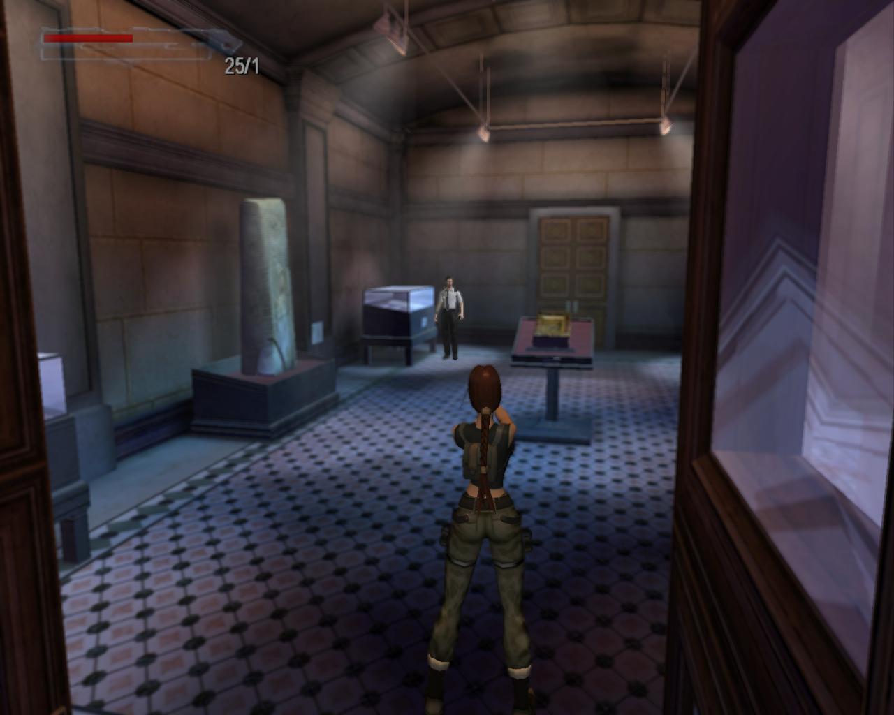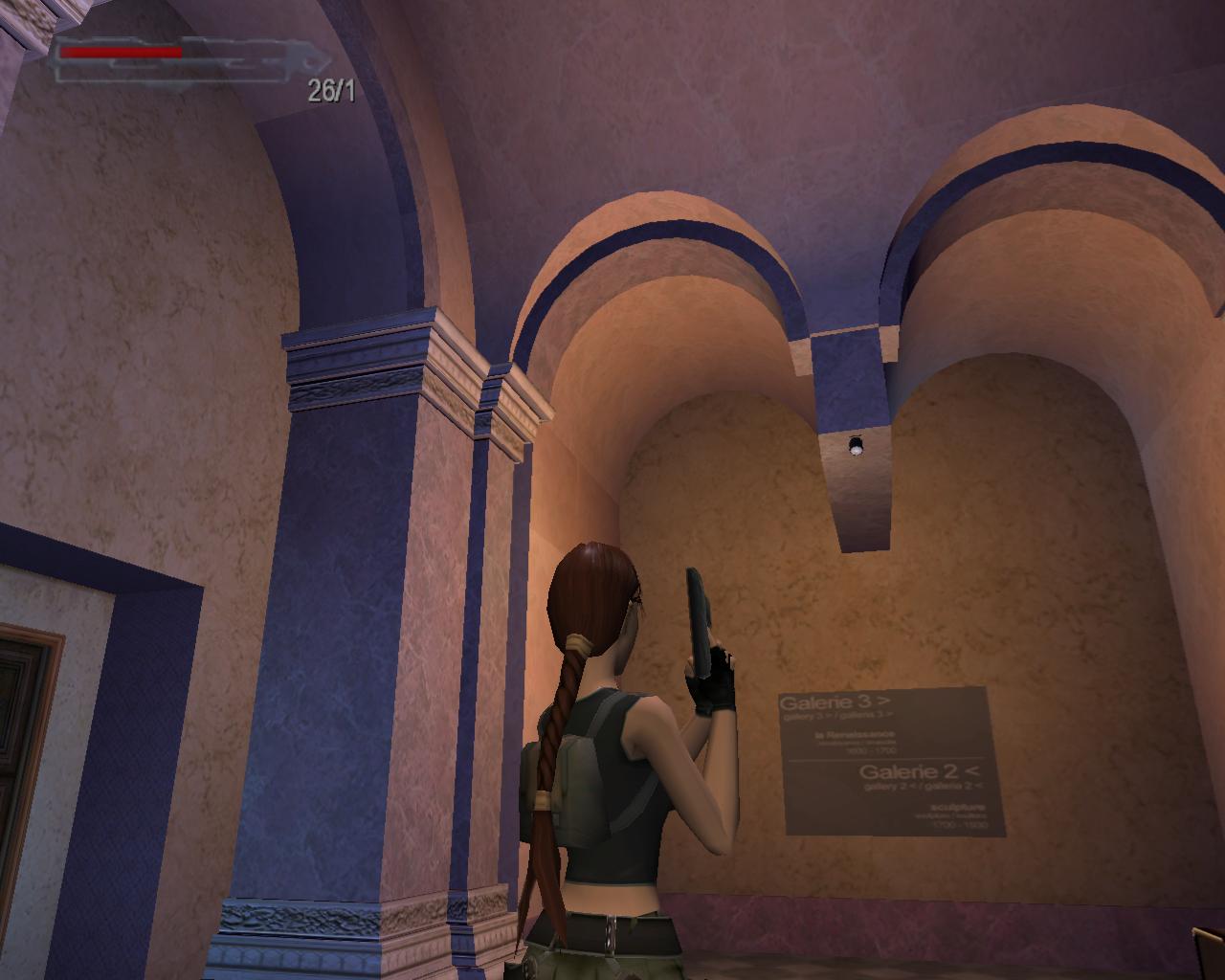 Elég komolyan védik a régiségeket a Louvre-ban; lézerek vannak mindenütt. Ha hozzájuk érsz, a terem másik oldalán lévo ajtót rács fogja lezárni, és egy or is a helyszínre siet. Akkor hogyan jussunk át? Középen van egy alacsony vitrin. Lépj fel rá. Jobbra fordulva megfigyelheted, hogy egy nagy egészségcsomag van a falon lévo díszített kotömbön. Sétálj a vitrin széléhez, és elore ugorva kapaszkodj meg a kotömbön. Mássz fel, vedd fel az egészségcsomagot. Fordulj jobbra, hátrálj egy kicsit, és nekifutásból ugorj át a lézerek felett a szemközti vitrin tetejére. Innét a középso vitrinre kell átjutnod. A padlón lézerek vannak, és elotted is egy mozgó lézer zárja el az utat. Lépj hátra, és amikor a lézer elindul lefelé, fuss neki és ugorj át az elotted lévo, következo vitrinre. Amint ennek a végéhez sétálsz, újabb lézerek jelennek meg elotted. Amikor a villódzó lézer eltunik egy pillanatra, ugorj át a következo vitrinre. Azonban itt is egy lézernyaláb zárja el az utat, a padló is ezekkel van tele, és a vitrin bal oldalán is van egy. Jobboldalt viszont nincs. Menj a vitrin feletti lézerhez, fordulj balra, és függeszkedj le (ha háttal a vitrin szélének egyszerre nyomod le a Séta és az Akció gombokat, akkor Lara mindezt egy hátraszaltó közben teszi), kapaszkodj el jobbra és mielott az erod elfogy, mássz vissza fel. Újabb lézerek jelennek meg, hálósan elzárva az utat. Azonban jobbra van egy nagy vitrin, aminek a tetejérol meg tudsz kapaszkodni a falból kiugró kis szegélyben. Függeszkedj el balra, el a lézerek mellett, és biztonságos távolban ess le. Szaladj az ajtóhoz, és nyisd ki.