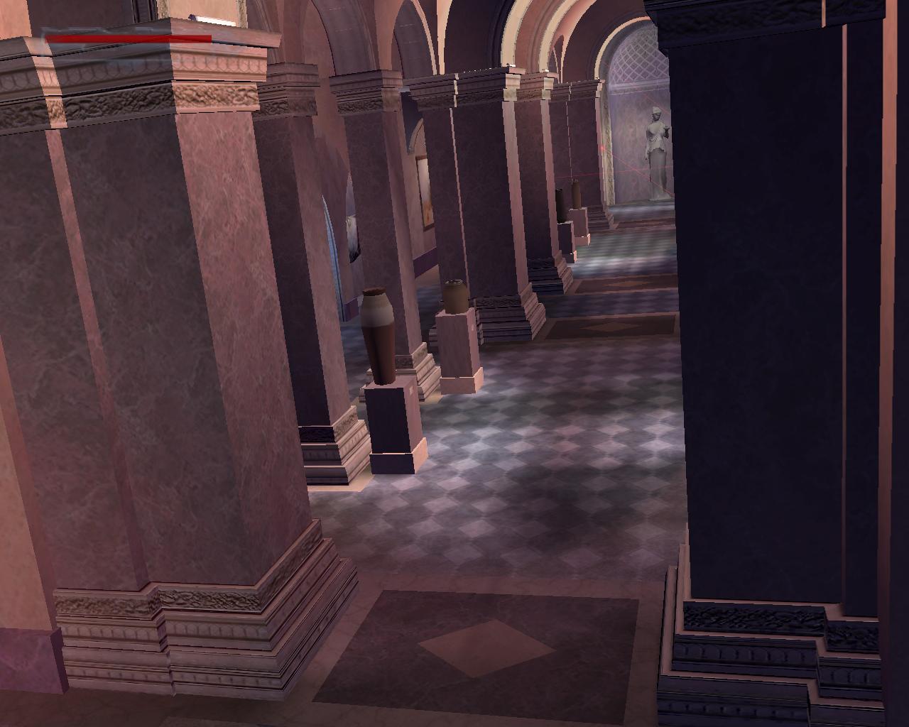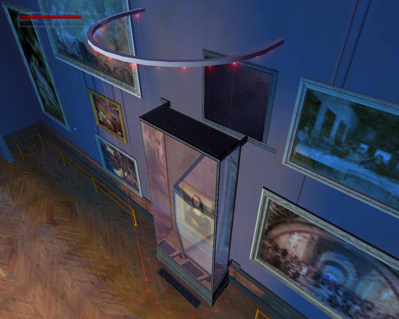 A kamera bemutatja a helyszínt, a Louvre egy gyönyöru folyosóját. Azonban a helyet elég jól orzik, mindenütt teremorök és fegyveres biztonsági orök állnak, és a lézerekkel is számolnunk kell. A balra elotted lévo ajtó zárva van, így át kell másznod a keresztezett lézerek alatt. Lehetoleg várd meg, amíg a teremor elfordul, mert könnyen észrevehet. Ha ez megtörténne, akkor olyan helyen intézd el, ahol nincsenek lézerek. Ezekkel is vigyázz, mert ha hozzájuk érsz, akkor egy fegyveres or siet a helyszínre. Ha átértél az elso lézerek alatt, akkor menj jobbra, lopakodj a falhoz, és simulj hozzá. Így el tudsz osonni a lézerek mellett, anélkül, hogy bekapcsolnád a riasztót. Lopakodj tovább, és intézd el végre a teremort. Egy kódkártyát fog eldobni. Vedd fel. Egyelore még ne menj be az ajtón, hanem menj tovább a folyosó végére. Balra egy ajtó vezet az ásatások színhelyére (a nálad lévo kártya nem nyitja, kár próbálkozni), jobbra pedig egy másik zárt ajtó elott nagy egészségcsomag hever. Az ajtót itt is lézeres mozgásérzékelo pásztázza; lehetoleg kerüld el, hacsak nem akarsz összetuzést egy újabb fegyveres orrel, aki a folyosó másik végén jelenik meg, ahonnan jöttél. Ezután menj vissza az ajtóhoz, amit a teremor felügyelt. Nyiss be. A Leonardo da Vinci tárlat helyszínére érkeztél, a falat mindenütt a mester leghíresebb képei és grafikái díszítik. Egyelore ne nagyon nézelodj, hanem a pásztázó lézert elkerülve (ami egy újabb ort riasztana) lépj be a terembe. Itt is egy teremor cirkál, úgyhogy csak óvatosan. Igyekezz becserkészni és csendesen elintézni. Végre szabadon gyönyörködhetsz a képekben. Egy vitrinbe zárva, amit lézerek és mérges gáz oriz, megtekintheted Leonardo fo muvét, a Mona Lisát. A muélvezet közben azonban figyeld meg azt is, hogy egy szellozo húzódik felette... A teremben van három nagy vitrin, ezek közül a középso mozgatható lenne, de...: