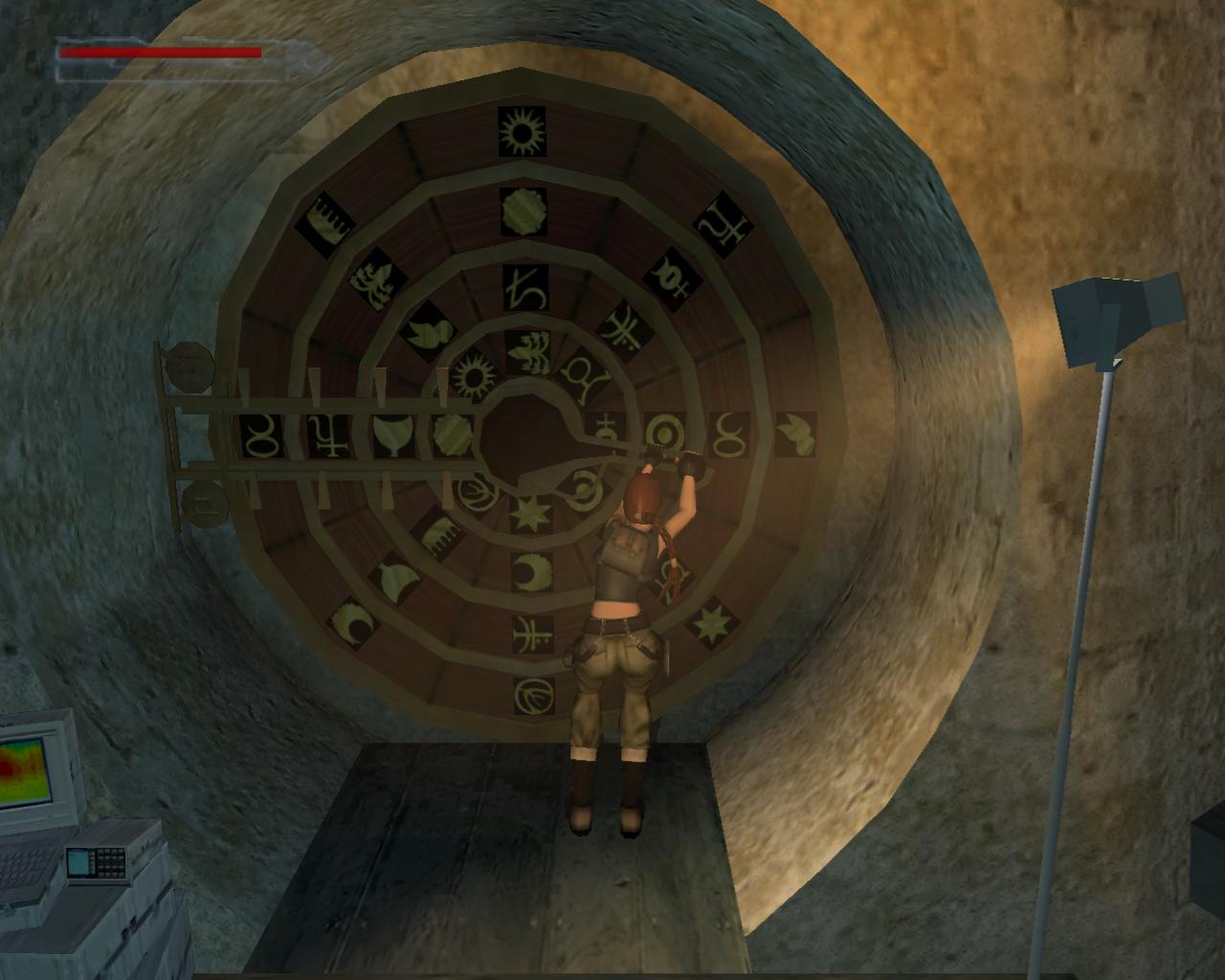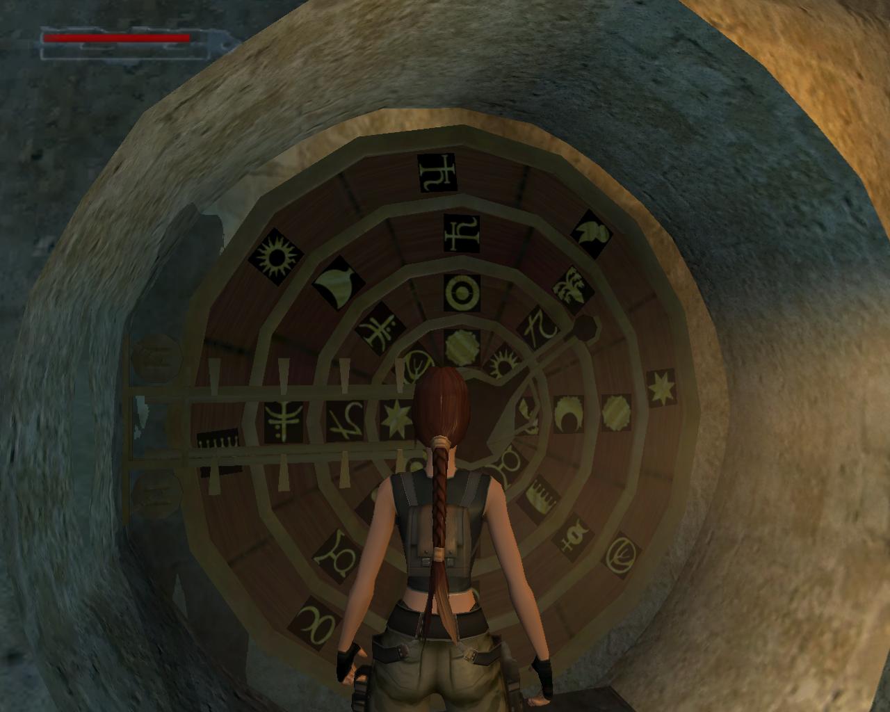 A nyomtató tálcáján kinyomtatva találsz egy újabb szimbólumot. (Ezt a falra ragasztva is megfigyelheted). Vedd el. Itt az ideje, hogy lemenjünk az ásatáshoz. Hagyd el az irodát, és menj balra. Újabb fegyveres ort kell eltenned láb alól. Menj vissza a bejárat felé, fordulj be jobbra, és a belso kerítés közepénél találsz egy létrát, ami levisz az ásatást szegélyezo fa állványzatra. Mássz le. Fordulj jobbra és sétál végig az állványzaton a következo létrához. Mássz le ezen is. Innét már megfigyelheted, hogy egy or köröz odalent. Menj tovább jobbra, el a létra mellett, majd balra, ahol az állvány véget ér. Szökkenj át szembe a következore. Kövesd az állványt jobbra és balra, végül mássz le a létrán. Itt az or már észrevesz, így kénytelen vagy felvenni vele a harcot. A létra mellett át tudsz szökkenni a korlát felett (ahonnét egy újabb létrán le tudsz mászni a talajra, ha szükséges; ugyanezt az állvány másik végébe futva is megteheted). Jobbra a fal mászható, meg tudsz kapaszkodni a repedésekben. Amint felfelé mászol, egy kiálló falrész zárja el az utat. Jobbra mászva ki tudod kerülni (használhatod együtt a Jobbra és Fel gombokat is). Ha fogytán az erod, akkor balra mászva ennek a peremnek a tetején meg tudsz pihenni; de erre nem lesz szükség. Mássz tovább felfelé, majd balra, a szélesebb perem fölé. Itt végre le tudsz szállni, és a szerkezetet is jobban szemügyre veheted. Menj a peremnek az ehhez közelebb eso részére. A fejed felett egy kohíd húzódik, aminek az alján meg tudsz kapaszkodni. Függeszkedj át a túloldalon lévo peremre. Ez már egész jól ki van számolva. Kissé feljebb balra van egy kis faállvány, amire fel tudsz mászni, és ahonnan elérheted a hidat. Húzódzkodj fel rá és menj a közepéhez, ahol egy fapalló vezet a felvonóhoz, és távolabb egy fémbol készült kör alakú laphoz a földben, a ponyva alatt. Lépj a felvonóhoz, és húzd meg a kapcsolóját, mire az leereszkedik a titokzatos szerkezet szintjére. Menj ki a hídra, vissza a kis faállványra, és le a koperemre. A felvonó nincs is messze. Sajnos szembol nem tudsz átugrani rá, mert Lara megkapaszkodik a felette húzódó híd alján, így vagy hátra- vagy oldalirányú ugrással kell próbálkoznod. Ha sikerült, végre odaléphetsz a forgó szerkezethez, ami a jöttödre megáll. Tulajdonképpen nem más ez, mint egy zárszerkezet, ami a jelek megfelelo kombinációja esetén kinyitja a fenti kör alakú fémlapot, ami egy lejárat nyílását fedi. Honnan tudjuk, hogy milyen jelekre van szükségünk? A jegyzetfüzet segít ebben, aminek az utolsó oldala egy rajzolt ábrát közöl a szerkezetrol. Láthatjuk, hogy az elso és negyedik szimbólum is fel van tuntetve; egy fektetett hold-szimbólum, és egy stilizált, hatágú növény. Sajnos a középso ketto hiányzik, de Von Croy még feljegyezte, hogy: