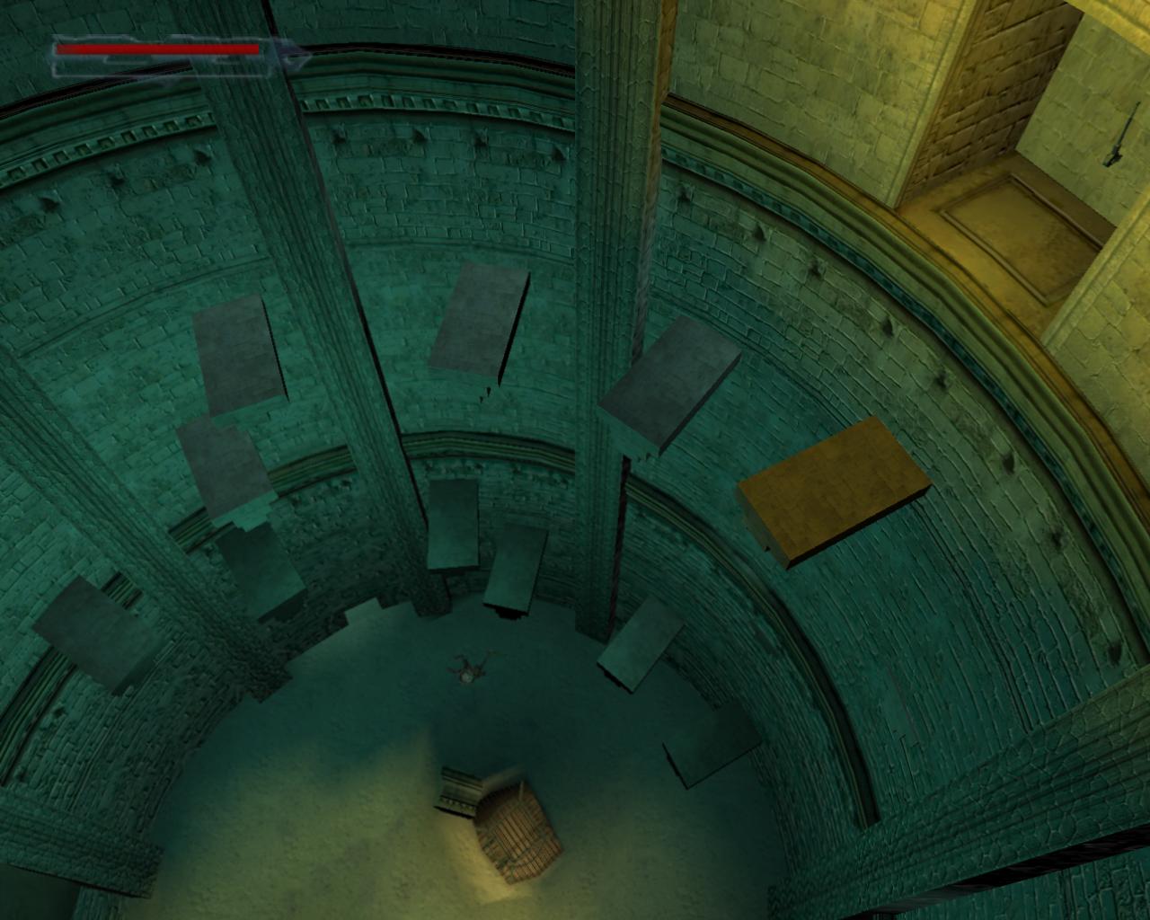 Fordulj balra és szökkenj át az elsore. A következot egy sima ugrással, a harmadikat egy kapaszkodásos ugrással tudod elérni. Újabb szökkenést követoen függeszkedj le és pottyanj le az alattad lévo párkányra. Fordulj meg, és ugorj elore a következore. A lovag már alattad ólálkodik. Mielott közelebbrol is megismerkednél vele, figyeld meg a csarnok másik oldalán lévo kis rést a falban. Ess le, küldd padlóra a lovagot, és még mielott magához tér, rohanj a réshez és mássz be. Egy kart találsz itt, ami peremeket húz vissza és enged ki a csarnok falából. Mássz vissza a csarnokba, fuss át szembe balra és mássz fel a legalacsonyabban lévore. Innen ugorj át a következore, majd az azutánira, ami esetleg kapaszkodást is igényelhet. Itt a bal sarokban ugorj fel, kapd el a peremet és húzódzkodj fel. Két kapaszkodásos ugrás következik a következo két peremre, majd meg kell fordulnod és egy kapaszkodásos ugrást végezned az azutánira. Ismét ugorj fel, és a fejed felett lévo perem elkapása után mássz fel. Három ugrás következik helybol, majd fordulj balra és mássz fel a fülkébe. Húzd meg az itt található kart, mire a lenti csapóajtó kinyílik. Újra lefelé vesszük az irányt. Függeszkedj és ess le az alattad lévo peremre, fordulj balra, és a szélérol szökkenj a következore. Ennek a közepérol ugorj, és a perem falhoz közeli részét célozd meg. Egy helybol ugrás következik, majd a perem szemközti szélén függeszkedj és ess le. Most hátrafelé kapaszkodj le, és ess még lejjebb. Ugorj tovább szembe, kapaszkodj le ismét és ess le. Fordulj meg és szökkenj. Ha akarsz, innét lefüggeszkedve már lejuthatsz a talajra, de akár az utolsó peremre is átszökkenhetsz. Ha akarod, most is ledöntheted a lábáról a lovagot, mert néha hajlamos utánad menni, de ez nem feltétlenül szükséges. Fuss a homoktölcsér közepéhez és ess le a csapóajtón át a tárnába.