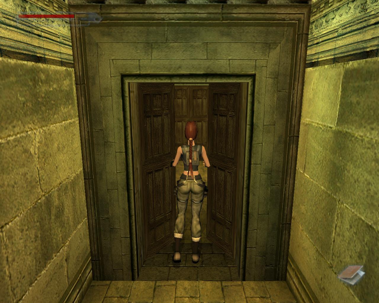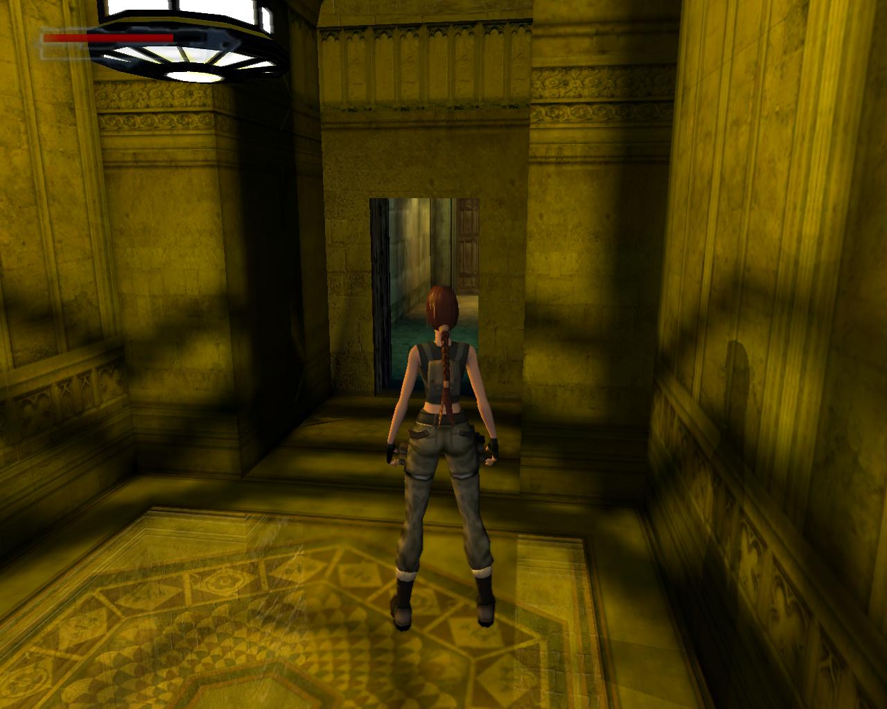 Mögötte megtalálod a sörétes puskát és hozzá két doboz sörétet. Menj ki innen, és kövesd a jobboldali járatot az ajtóig. Rúgd be ezt is, mire egy gyönyöruen fénylo padlatú, dombormuvekkel díszített folyosóra jutsz. Belépve azonban az ajtó lecsapódik a hátad mögött, és az addig jámbor vízköpok most gyilkos nyilakat kezdenek köpködni. A folyosó túlsó végén lévo ajtó zárva van, az a kar nyitja, ami az ajtón belépve a jobb oldalon van. Ha ezt meghúztad, akkor rövid idore kinyílik, de az utat halálos karók döfködése is nehezíti. Gyorsnak kell lenned, de a következo módszer talán segít. Húzd meg a kart, fordulj balra és várj ki egy ütemet. Ezután, mint a villám, rohanj át a nyilak között. Ha eltalálnak, annak nem lesz jó vége, inkább rugaszkodj neki még egyszer. A karók átugrását messzebbrol kezd meg, mert csak így juthatsz át. Ha hozzájuk érsz, azonnal véged. Megállás nélkül végezd el ugyanezt a második és harmadik sorozat nyíl és karó esetén, majd rohanj át az ajtón. Fordulj balra, és kövesd tovább a folyosót.