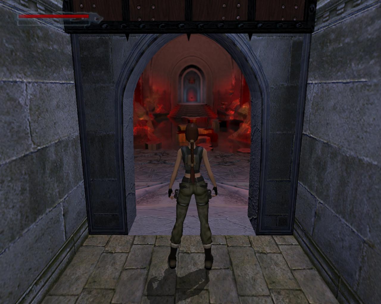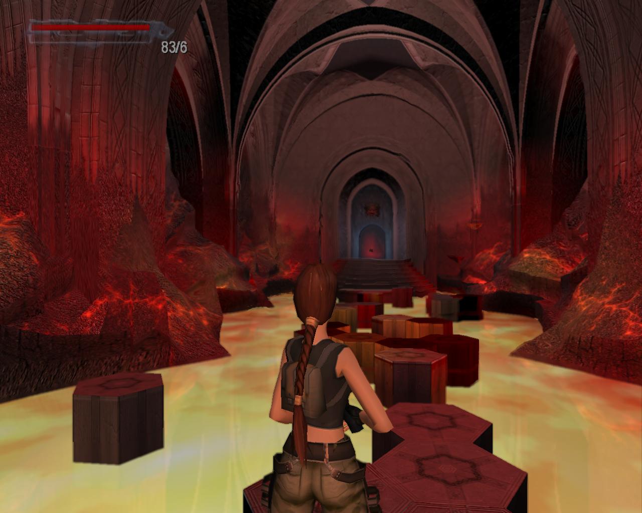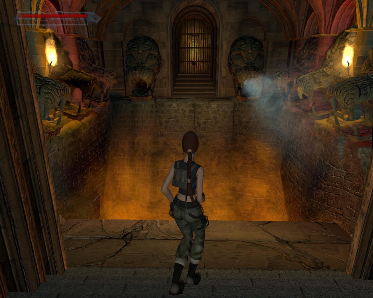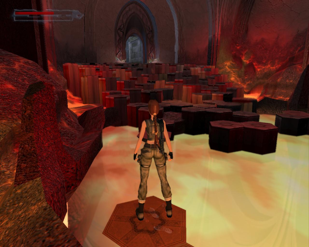 Ha valamelyik másik kart húztad meg, akkor mostanra már lepottyantál az alagsorba. Itt fent nem találsz semmit, de a lejton lecsúszva egy tár Viper SMG loszert vehetsz fel. Fuss ki a körfolyosóra és indulj el jobbra. Hamarosan a falból kilökodo, döfködo karók akadályozák a továbbjutást. Indulj el valamelyik oldalon, és a karókhoz lépve várd meg, amíg elkezdenek visszahúzódni. Ekkor szaladj el mellettük. Ismételd ezt mindaddig, amíg biztonságosan át nem jutottál. Ugorj át a lávás verem felett, és rohanj be a jobboldali járatba, mielott a mángorló átgurulna rajtad. Ha elhaladt, menj vissza a körfolyosóra és haladj tovább jobbra. Innét már ismeros lesz a dolog. Ugorj át a láva felett, és a kiugró, forgó pengét haonlóan kerüld el, amint azt korábban is tetted: fuss át alatta, amikor vízszintesen forog vagy függeszkedj át alatta a lávás gödör peremén megkapaszkodva. Menj be a jobboldali kis ajtón és a felvonót használva juss fel a nagy csarnokba. Fuss a jobb kapu mögött lévo karhoz, húzd meg és szaladj be a hatására kinyíló nagy kapun.