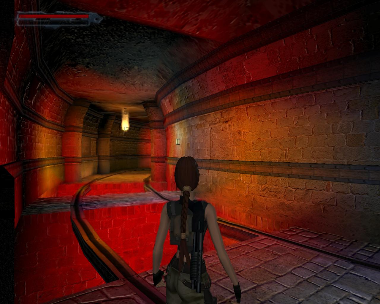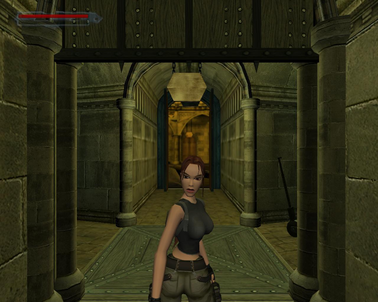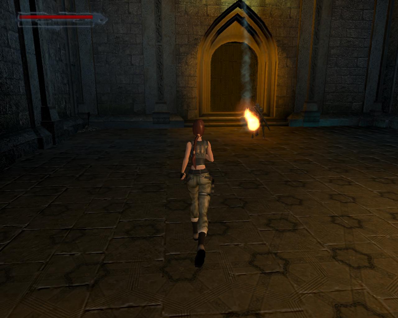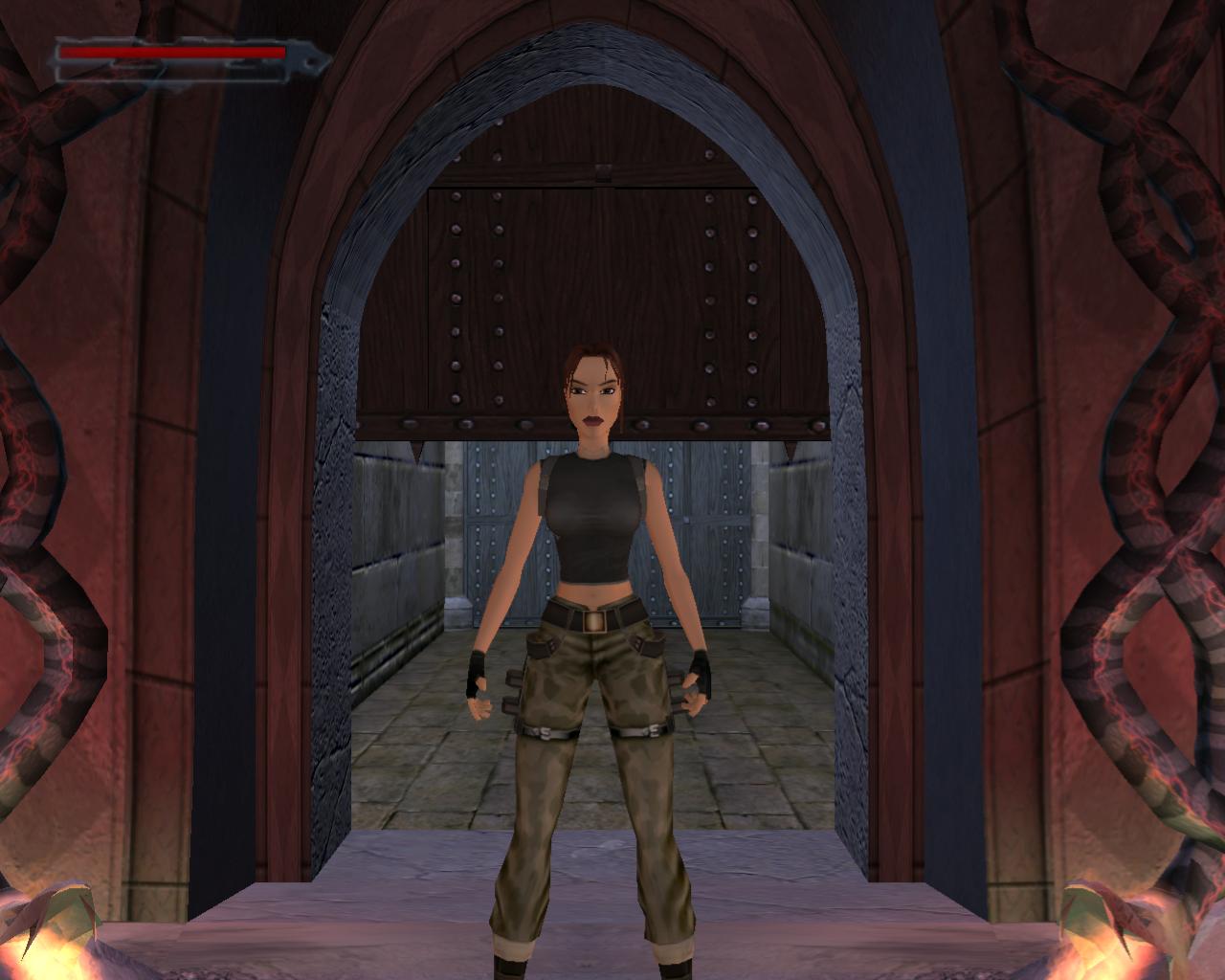 Ha valamelyik másik kart húztad meg, akkor mostanra már lepottyantál az alagsorba. Itt fent nem találsz semmit, de a lejton lecsúszva egy tár Viper SMG loszert vehetsz fel. Fuss ki a körfolyosóra és indulj el jobbra. Hamarosan a falból kilökodo, döfködo karók akadályozák a továbbjutást. Indulj el valamelyik oldalon, és a karókhoz lépve várd meg, amíg elkezdenek visszahúzódni. Ekkor szaladj el mellettük. Ismételd ezt mindaddig, amíg biztonságosan át nem jutottál. Ugorj át a lávás verem felett, és rohanj be a jobboldali járatba, mielott a mángorló átgurulna rajtad. Ha elhaladt, menj vissza a körfolyosóra és haladj tovább jobbra. Innét már ismeros lesz a dolog. Ugorj át a láva felett, és a kiugró, forgó pengét haonlóan kerüld el, amint azt korábban is tetted: fuss át alatta, amikor vízszintesen forog vagy függeszkedj át alatta a lávás gödör peremén megkapaszkodva. Menj be a jobboldali kis ajtón és a felvonót használva juss fel a nagy csarnokba. Fuss a jobb kapu mögött lévo karhoz, húzd meg és szaladj be a hatására kinyíló nagy kapun.