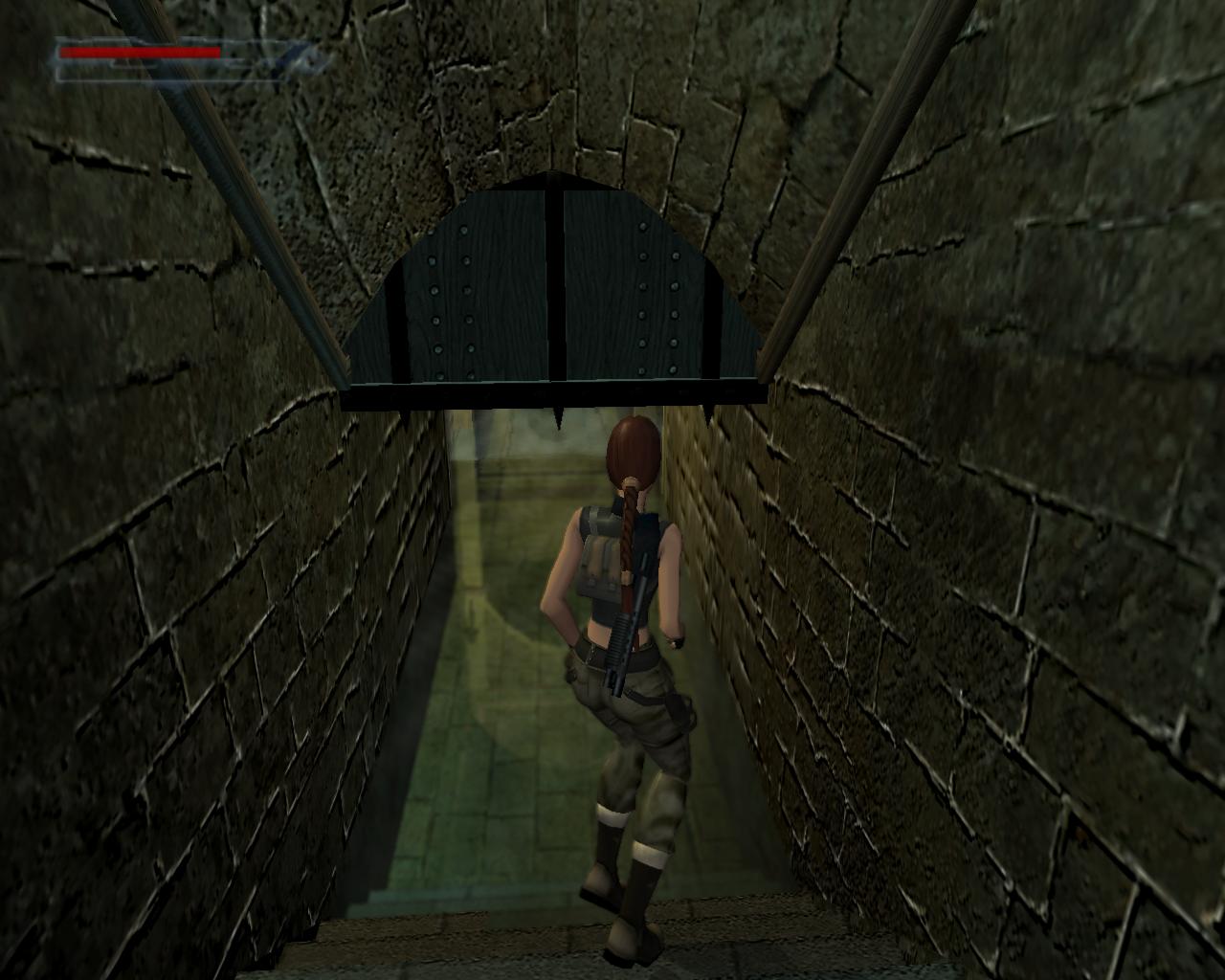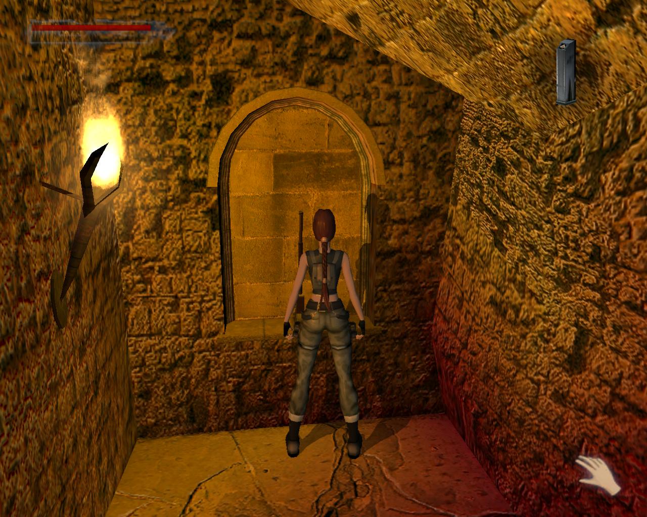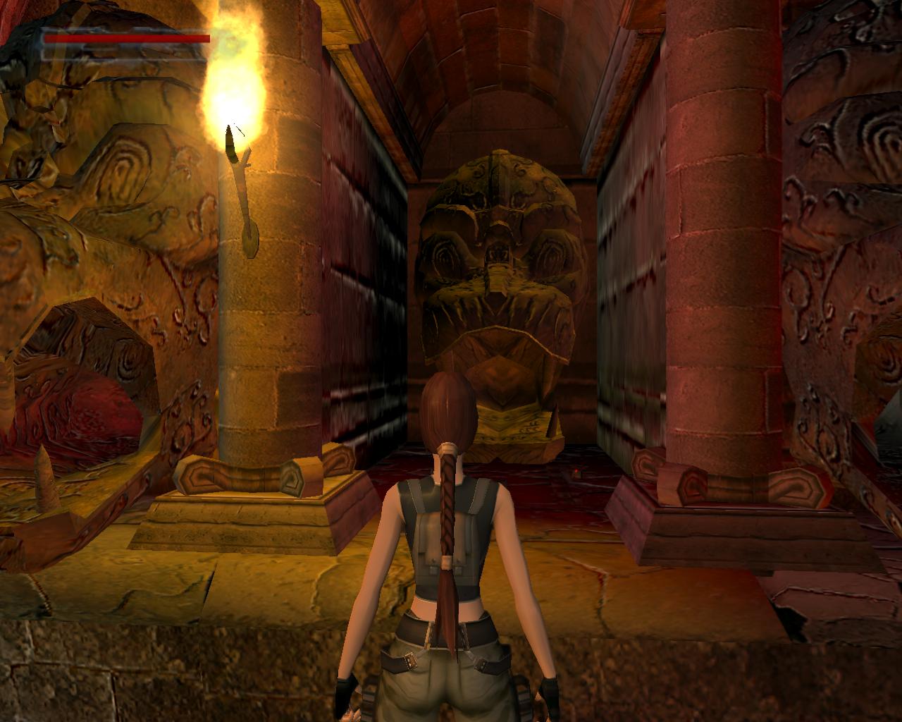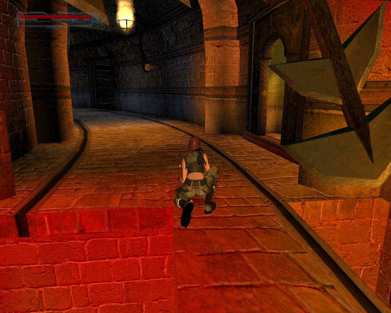Ha valamelyik másik kart húztad meg, akkor mostanra már lepottyantál az alagsorba. Itt fent nem találsz semmit, de a lejton lecsúszva egy tár Viper SMG loszert vehetsz fel. Fuss ki a körfolyosóra és indulj el jobbra. Hamarosan a falból kilökodo, döfködo karók akadályozák a továbbjutást. Indulj el valamelyik oldalon, és a karókhoz lépve várd meg, amíg elkezdenek visszahúzódni. Ekkor szaladj el mellettük. Ismételd ezt mindaddig, amíg biztonságosan át nem jutottál. Ugorj át a lávás verem felett, és rohanj be a jobboldali járatba, mielott a mángorló átgurulna rajtad. Ha elhaladt, menj vissza a körfolyosóra és haladj tovább jobbra. Innét már ismeros lesz a dolog. Ugorj át a láva felett, és a kiugró, forgó pengét haonlóan kerüld el, amint azt korábban is tetted: fuss át alatta, amikor vízszintesen forog vagy függeszkedj át alatta a lávás gödör peremén megkapaszkodva. Menj be a jobboldali kis ajtón és a felvonót használva juss fel a nagy csarnokba. Fuss a jobb kapu mögött lévo karhoz, húzd meg és szaladj be a hatására kinyíló nagy kapun.