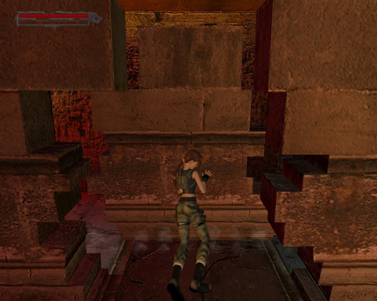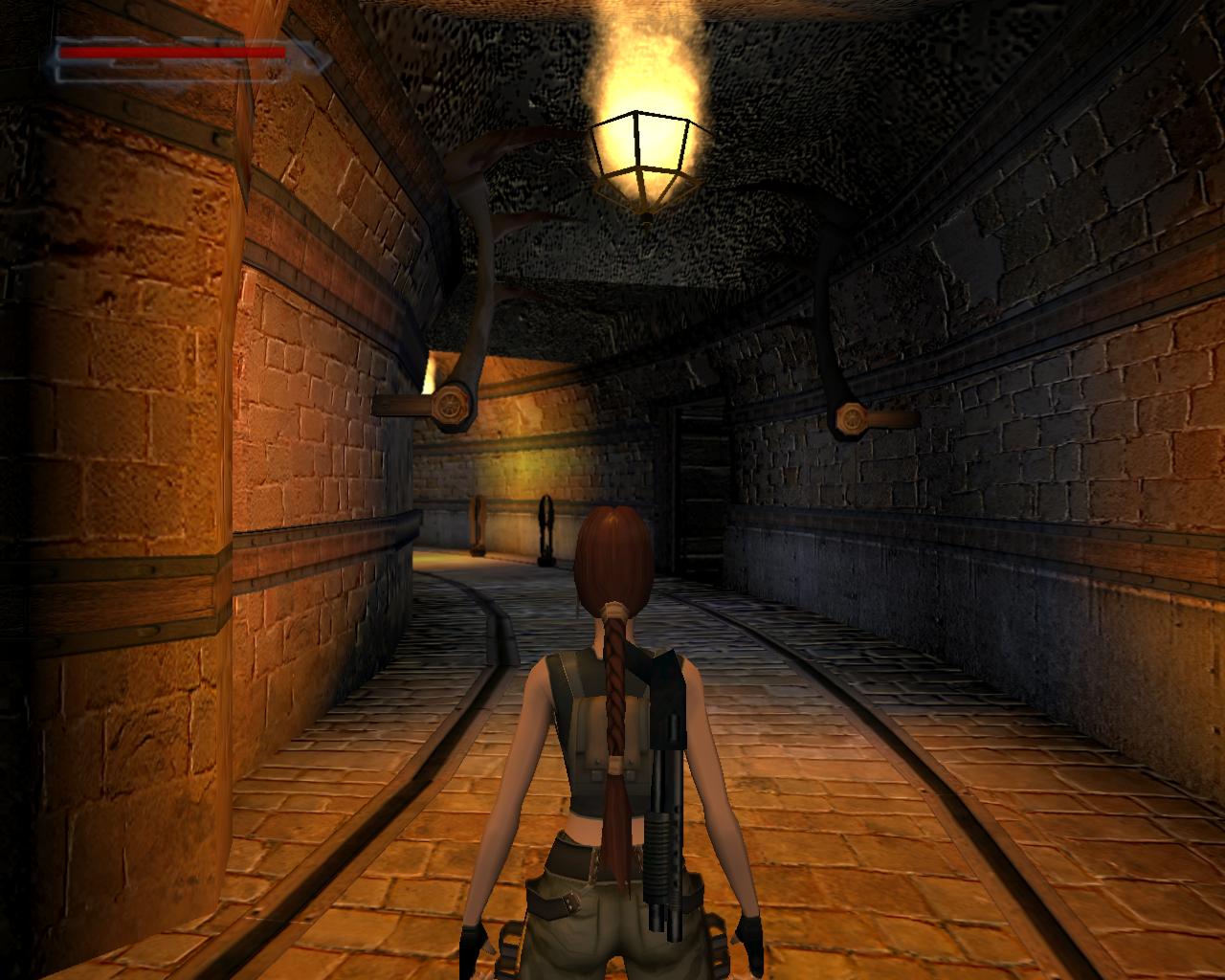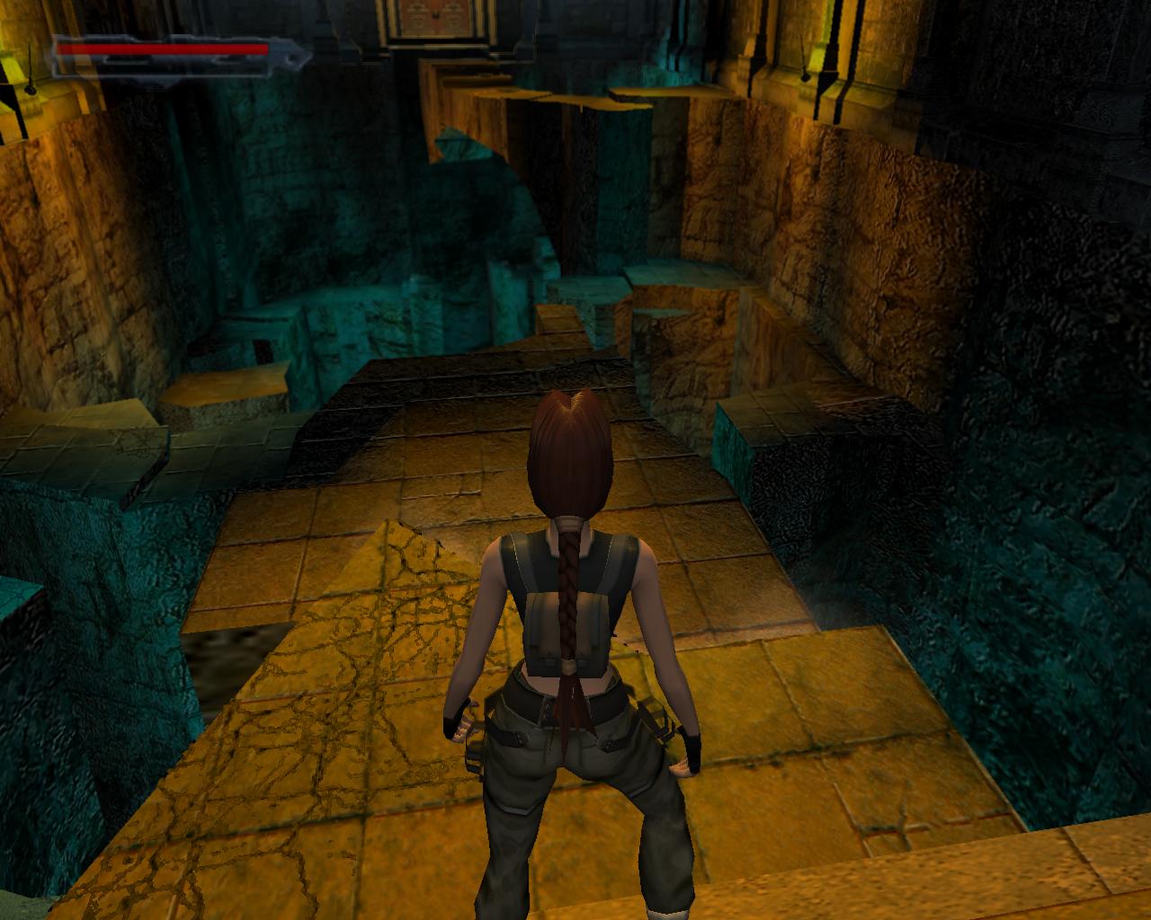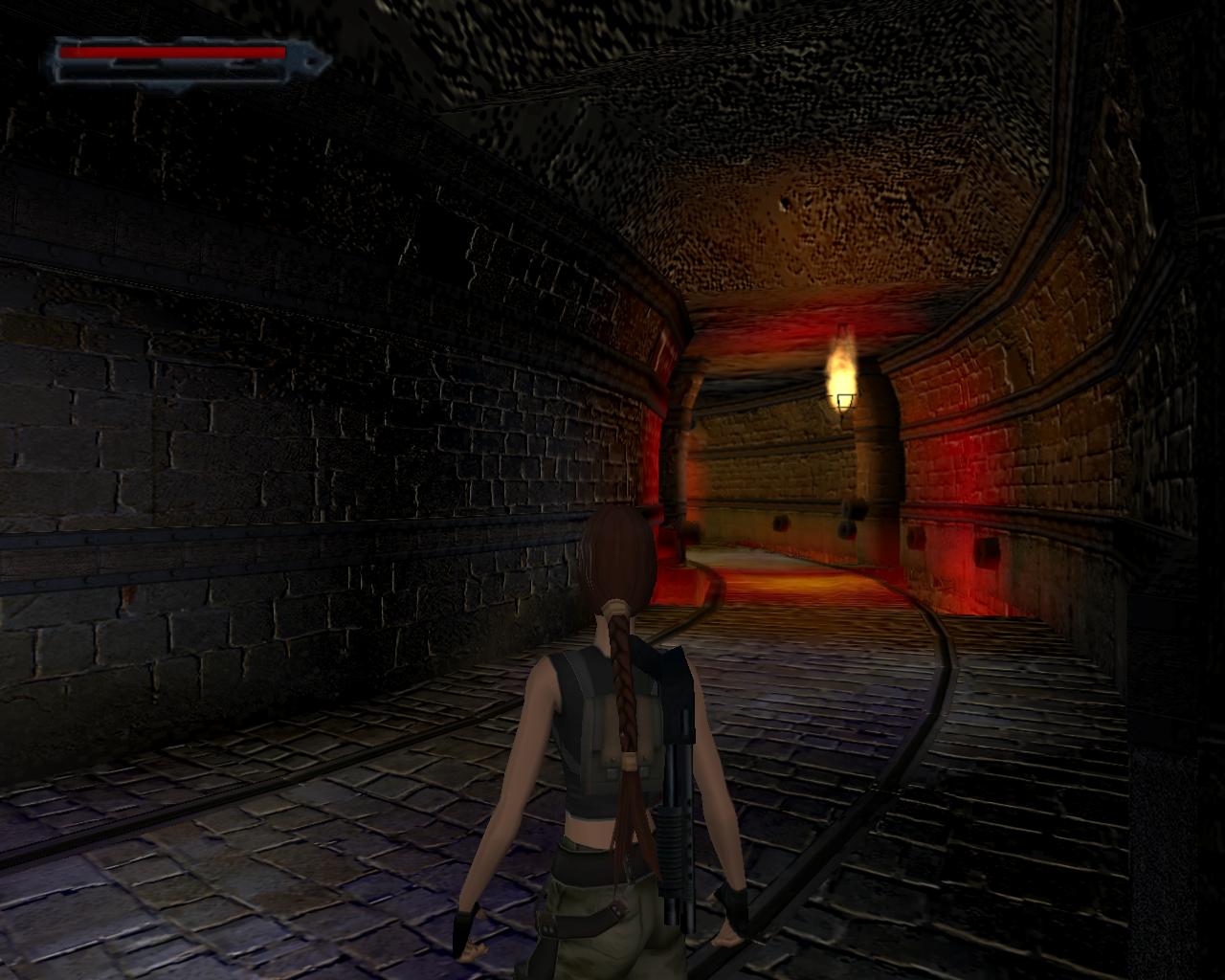 Ha valamelyik másik kart húztad meg, akkor mostanra már lepottyantál az alagsorba. Itt fent nem találsz semmit, de a lejton lecsúszva egy tár Viper SMG loszert vehetsz fel. Fuss ki a körfolyosóra és indulj el jobbra. Hamarosan a falból kilökodo, döfködo karók akadályozák a továbbjutást. Indulj el valamelyik oldalon, és a karókhoz lépve várd meg, amíg elkezdenek visszahúzódni. Ekkor szaladj el mellettük. Ismételd ezt mindaddig, amíg biztonságosan át nem jutottál. Ugorj át a lávás verem felett, és rohanj be a jobboldali járatba, mielott a mángorló átgurulna rajtad. Ha elhaladt, menj vissza a körfolyosóra és haladj tovább jobbra. Innét már ismeros lesz a dolog. Ugorj át a láva felett, és a kiugró, forgó pengét haonlóan kerüld el, amint azt korábban is tetted: fuss át alatta, amikor vízszintesen forog vagy függeszkedj át alatta a lávás gödör peremén megkapaszkodva. Menj be a jobboldali kis ajtón és a felvonót használva juss fel a nagy csarnokba. Fuss a jobb kapu mögött lévo karhoz, húzd meg és szaladj be a hatására kinyíló nagy kapun.