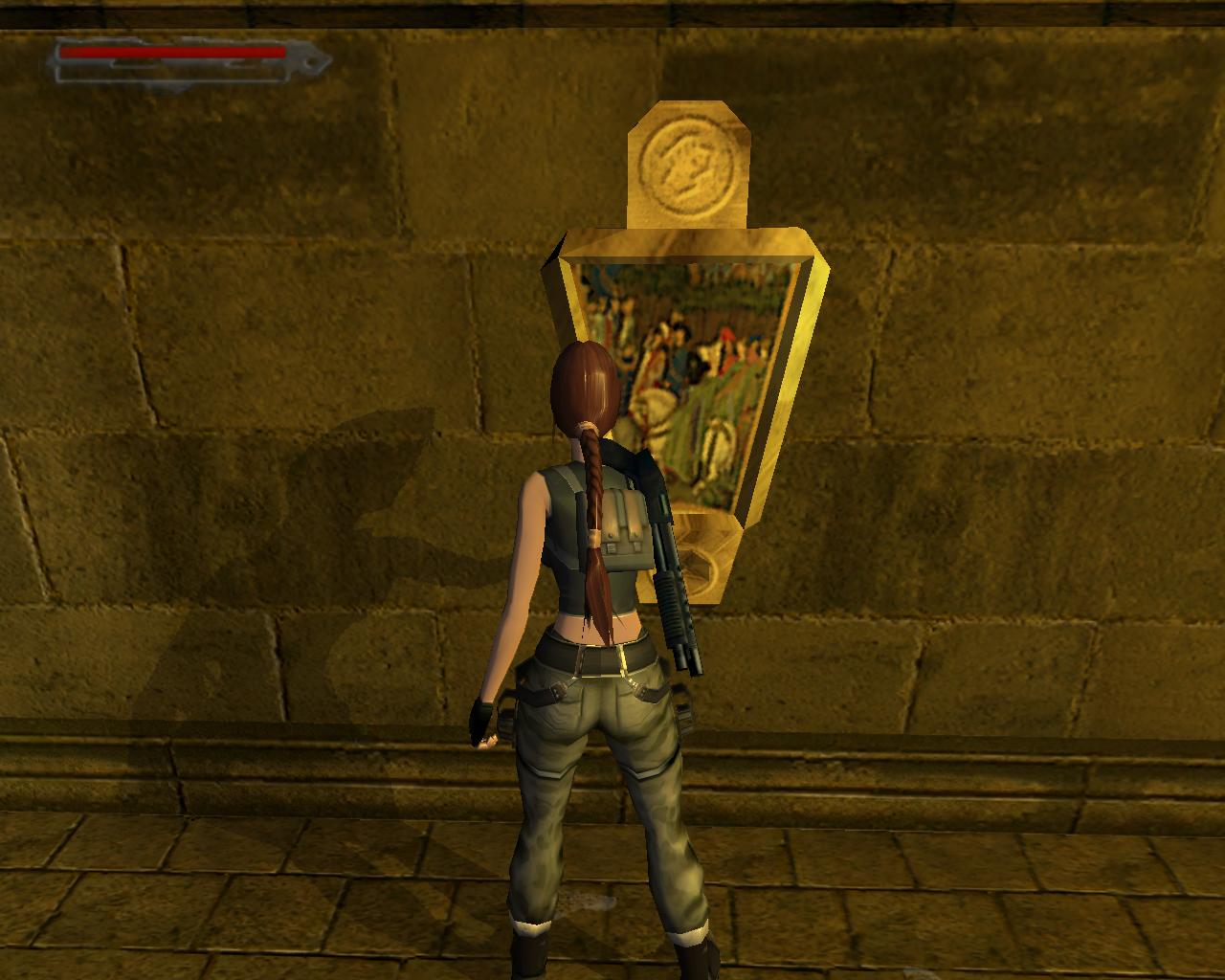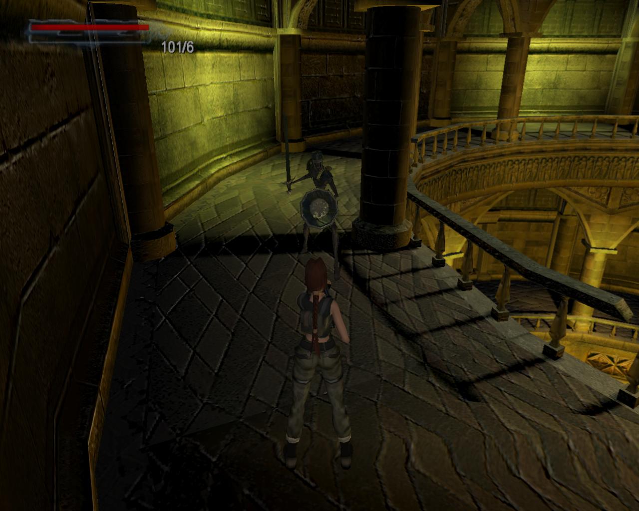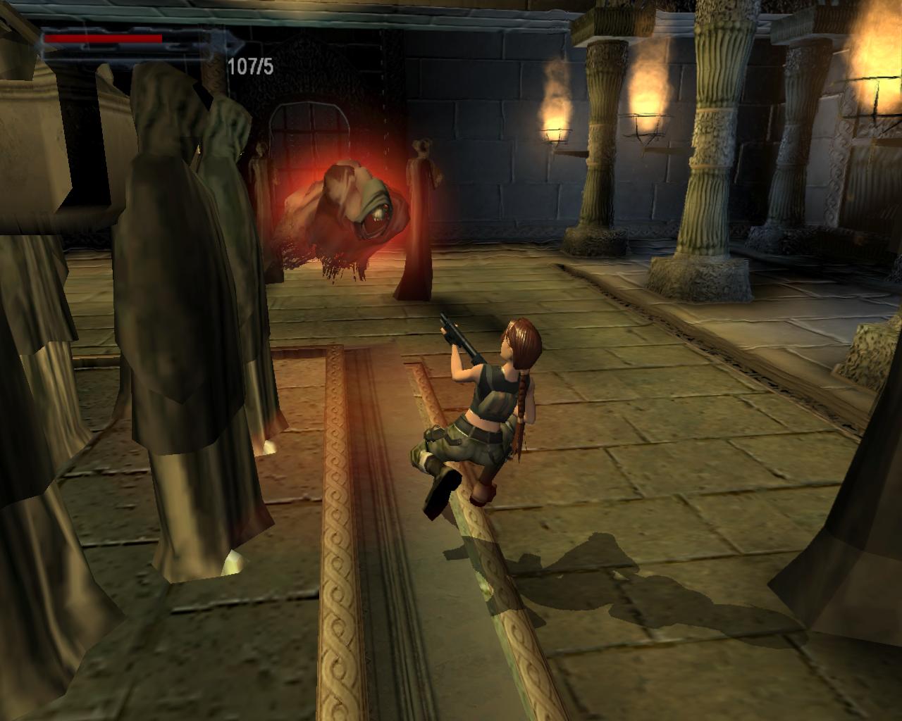 Lehet, hogy Lara nem pontosan így gondolta, de ebben a pillanatban Obscura barát tüzesen égo, de eléggé csapzott szelleme jelenik meg a háta mögött, nagyon fenyegetoen. Ellene egyetlen módon lehet védekezni: ha leguggolsz. Ekkor hiába próbál meg neked rontani, mindig elszáll a fejed felett. Mielott nekilátnál a feladatodnak, talán lenne kedved összegyujteni néhány hasznos holmit. Fordulj balra és szaladj a terem sarkába, ahol egy nagy egészségcsomagot és egy doboz sörétet vehetsz fel. Tovább haladva az óramutató járásával ellentétesen, a következo sarok felé félúton találsz mégegy doboz sörétet, majd a sarokban egy sörétes puska hever. Az ugyanezen rend szerint következo sarok üres, de utána félúton egy doboz sörét vár rád, csakúgy mint a negyedik sarokban (sörét). Ideje, hogy nekilássunk a feladatunknak...