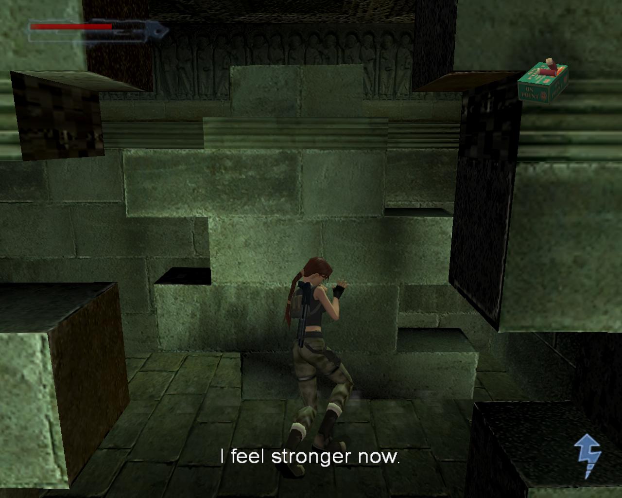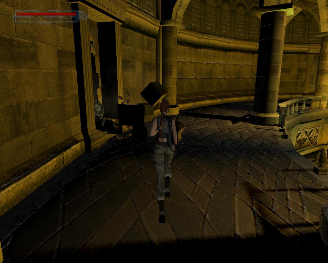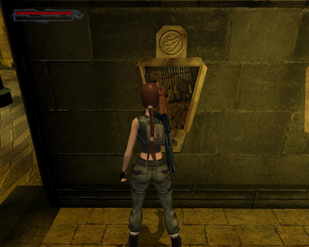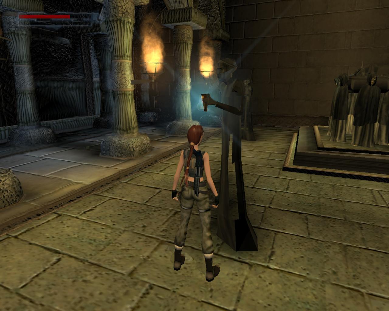 Lehet, hogy Lara nem pontosan így gondolta, de ebben a pillanatban Obscura barát tüzesen égo, de eléggé csapzott szelleme jelenik meg a háta mögött, nagyon fenyegetoen. Ellene egyetlen módon lehet védekezni: ha leguggolsz. Ekkor hiába próbál meg neked rontani, mindig elszáll a fejed felett. Mielott nekilátnál a feladatodnak, talán lenne kedved összegyujteni néhány hasznos holmit. Fordulj balra és szaladj a terem sarkába, ahol egy nagy egészségcsomagot és egy doboz sörétet vehetsz fel. Tovább haladva az óramutató járásával ellentétesen, a következo sarok felé félúton találsz mégegy doboz sörétet, majd a sarokban egy sörétes puska hever. Az ugyanezen rend szerint következo sarok üres, de utána félúton egy doboz sörét vár rád, csakúgy mint a negyedik sarokban (sörét). Ideje, hogy nekilássunk a feladatunknak...