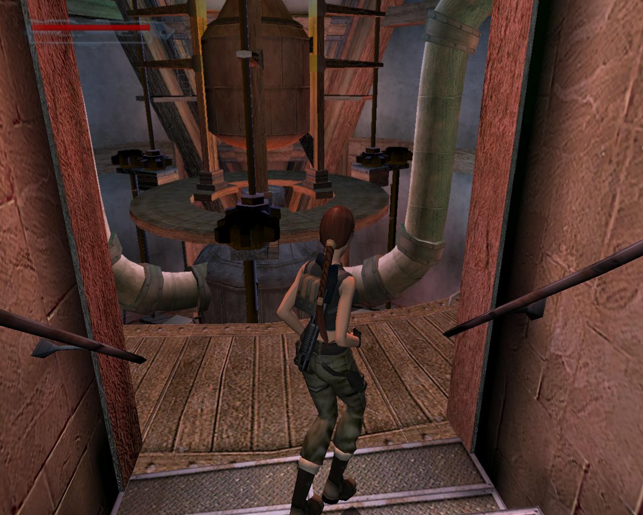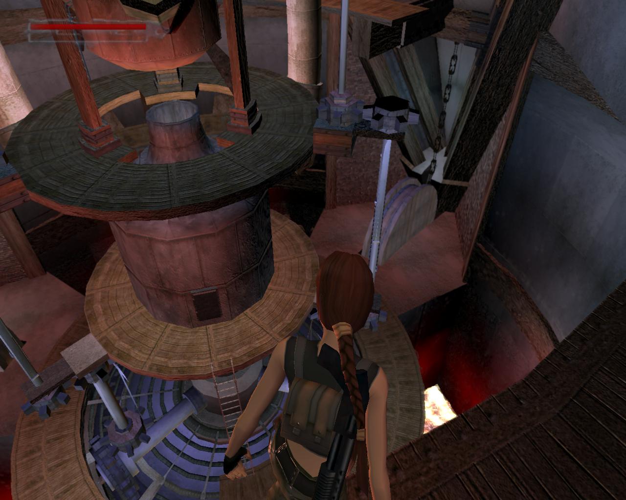 A terem közepén egy óriási alkimista kohót láthatsz. Ez a Négy Oselem teremto erejét felhasználva energiát termel egy hatalmas gépezet muködtetéséhez. A hozzávalókat azonban nekünk kell biztosítanunk. Egy peremen állsz. Fuss a baloldali végéhez, ahol a Levegot jelképezo tábla alatt egy szelepet találsz, ahonnan egy vastag cso vezet a kohóba. Nyisd ki a szelepet, és hallod is, ahogyan a csövön végigsüvít a szél. Menj vissza a perem másik végébe és mássz le a létrán. Már innét is megfigyelheted, hogy egy lovag ólálkodik odalent. Fordíts hátat a létrának, és figyeld meg a terem közepe felé mutató vastag gerendát nem is olyan messzire. Egy nekifutásos ugrást követoen kapaszkodj meg a szélében, majd húzd fel magad. Menj jobbra a gerenda fal feloli végéhez és mássz fel az itteni létra tetejére, ahonnan egy hátraszaltóval ugorj a mögötted lévo peremre. Fordulj meg és sétálj ki jobbra egy újabb létrához. Mássz fel, és jobbra leszállva már szemközt is találod magad a következo szeleppel, ami felett a Föld szimbólumával ellátott tábla függ. Nyisd meg, mire göröngyök gurulnak végig a csövön, egyenesen a kohóba. Mássz le a létrán, és fordulj a kohó felé. Rövid nekifutást követoen át tudsz ugrani a felette húzódó kör alakú peremre. Menj jobbra egy negyed kört, és az itt húzódó vastag cso alatt egy vasláncot figyelhetsz meg. Felugorva kapaszkodj meg bent és függeszkedj át rajta a terem fala mentén húzódó peremre. Ennek a másik végén egy létra van, amin felmászva jobbra egy újabb szelepet találsz, ami a Víz adagolásáért felelos. Megnyitva csak úgy zúdul végig a csövön. Menj le a létrán, és a láncban megkapaszkodva függeszkedj vissza a kohó feletti peremre. Menj balra, és ugorj vissza a létrás peremre, ami a Föld-szelephez vezet. A kis beugróban, ahol a létra van, kapaszkodj le és ess le az alsó gerendára. A gerenda felett szintén egy lánc húzódik, ami a kohó aljánál lévo kör alakú peremhez vezet. Juss át oda. Balra találod az utolsó szelepet, a Tuzét, ami végre begyújtaná a kohót. Azonban mielott még ezt tennéd, mássz le a peremen lévo létrán, és megfordulva ugorj le a koperemre a nagy kerékhez. Mellette egy tár Viper SMG loszer hever. Vedd fel. A magányos lovag valószínüleg eddigre már elég közel merészkedett - legjobb lesz, ha belelököd a lávával teli gödörbe. Mássz vissza a létrán és forgasd el végre a Tuz-szelepet is.