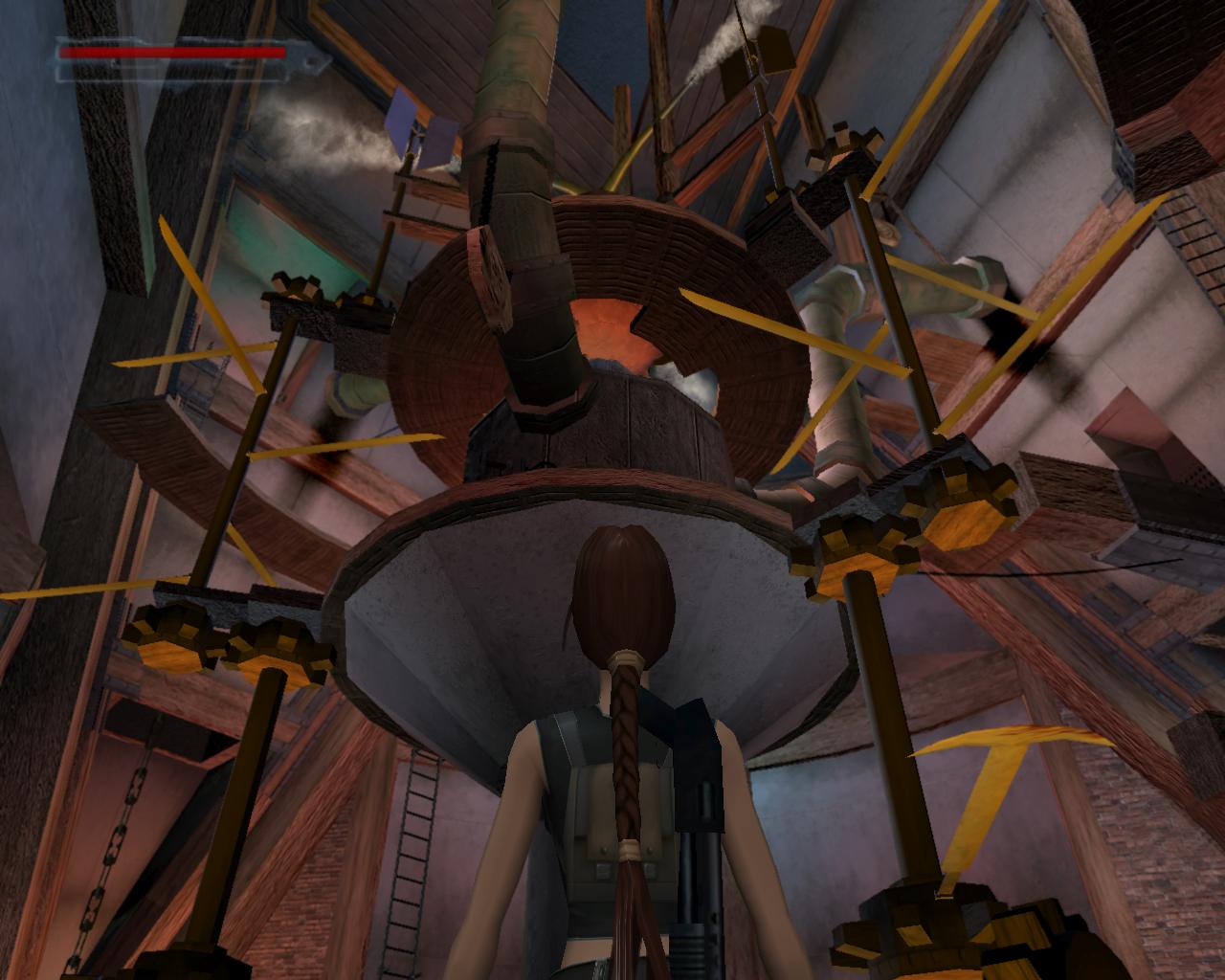 A Föld és Levego táplálja a Tuz lángját, ami a Vízbol keletkezo goz hajtóerejével lassan elindítja a nagy gépezetet. Neked sincs sok idod, hogy az éltedet mentsd, ezért a szelep kinyitása után azonnal szaladj jobbra a lánchoz. Idoközben a forgásba lendülo póznákról pengék nyílnak le és kezdenek forogni. Odalent is vastag, horgas végu pengék kezdenek csapkolódni, és furészes lapok forognak közvetlenül a fa perem felett. Azzal, hogy idejében ide szaladtál, gyakorlatilag elkerülted a csapdákat, de ha ki akarod próbálni milyen is kikeveredni errol a helyrol rajtuk keresztül, hát csak maradj egyhelyben a szelep elforgatása után, és próbáld a létrán lemászva elérni a kijáratot. A láncon függeszkedj át a vastag gerendára, majd fordulj jobbra. A leheto legrövidebb távot véve fuss neki a gerendán és ugorj át a létrás peremre a bejárat alatt. Elképzelheto, hogy kapaszkodnod is kell... Mássz fel a létrán, és mielott elhagynád a termet, még vess egy utolsó pillantást rá: a kohóban vadul lobog a tuz, goz lövell ki a kohó kéményein és a kitartóan forognak a pengék. Szaladj fel a lépcson, a kart a helyére tolva nyisd ki a kaput és szaladj fel a csigalépcson.