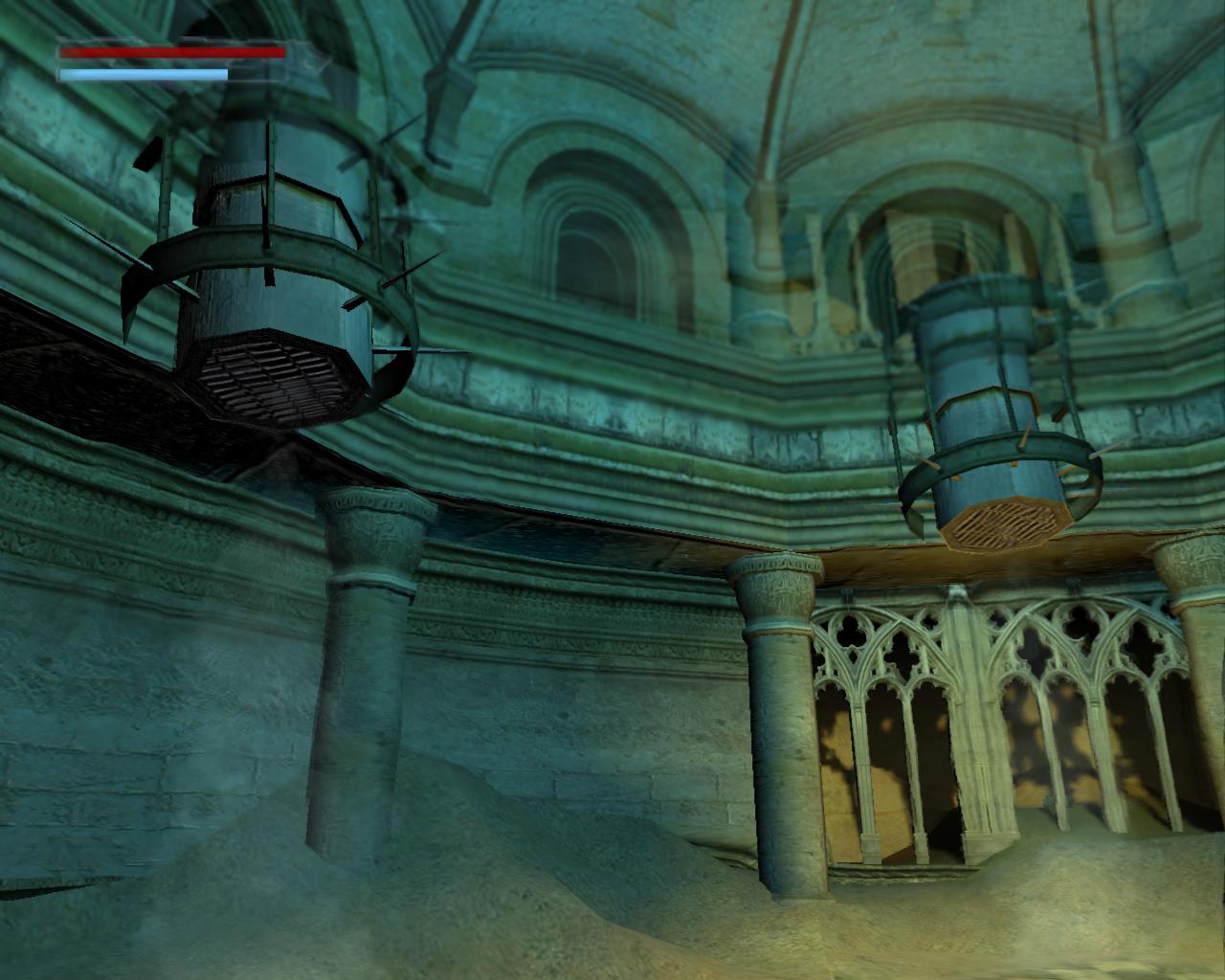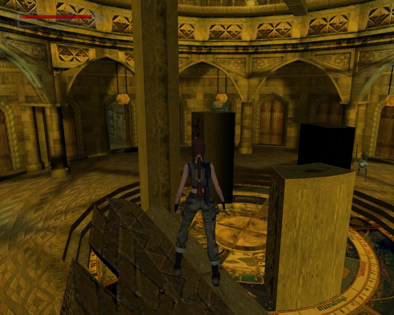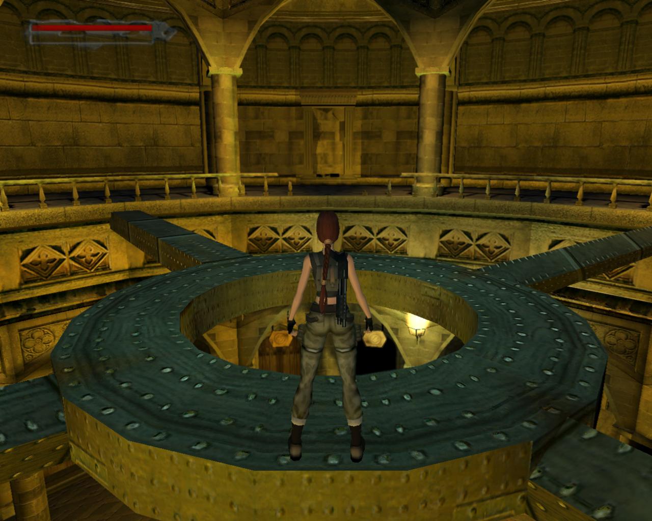 A terem közepén négy különbözo magasságú oszlop jelent meg, amik hol felemelkednek, hol lesüllyednek. Tulajdonképpen négy csillagjegy padlólapja emelkedett ki a beindított gépezet muködése következtében. Menj oda a legalacsonyabbhoz, ami pont szemben található, amellett a padlólap mellett, amin a víz szimbóluma szerepel. Amikor leereszkedik, ugorj fel és kapaszkodj meg a szélében. Felmászva láthatod, hogy a tetején a Skorpió jegy található. Most körbe kell haladnod felfelé az óramutató járásával ellentétes irányban, oszlopról oszlopra ugorva. Várd meg, amíg az oszlop amin állsz eléri a legmagasabb pontját, és a következo oszlop eléri a fel-le mozgásának mélypontját. Ekkor ugorj át a Nyilast ábrázoló oszlopra. Haladj tovább ugyanígy a Bika, végül pedig az Ikrek képét ábrázoló legmagasabb oszlopra ugorva. Fordulj balra, a terem közepe felé, és amikor az oszlop eléri a legmagasabb pontját, ugorj fel és kapd el a fagerendát. Mássz fel rá. Szemben, kissé balra, egy lapos gerenda vezet a nagy körfolyosóhoz. Sétálj végig rajta és lépj fel a kokorlátra. Balra láthatsz egy felfelé vezeto lépcsot, de az arra vezeto utat egy vasrács zárja el. Körbe kell hát menned... Balra és jobbra is kis fülkéket láthatsz a falon. Ezekhez közel lépve lovagok törik át a falat és támadnak rád. Ha nagyon zavarnak, próbáld meg lelökdösni oket a peremrol, ahol hiányzik a korlát. Menj körbe a lépcsohöz és szaladj fel rajta. Egy kis folyosóra érkeztél, jobbra egy zárt kapuval. Fuss ki a körfolyosóra. Egy lovag már egészen a közeledbe is ért. Lökd le a mélybe vagy csak fuss el mellette balra. Hamarosan egy újabb lovagba ütközöl. Vele is hasonlóan járj el. Ha körbeértél, a leszakadt padlórésznél meg tudsz kapaszkodni a falon és fel tudsz mászni egy keskeny peremre. Tovább is tudnál mászni felfelé, de nem lenne erod a végéig, így húzd meg inkább az itt található kart. Hatására kinyílik a kapu a kis folyosón. Mássz le a körfolyosóra és fuss vissza oda (ügyesebbek a szakadék felett is megpróbálhatnak átugorni). Odabent egy doboz sörétet vehetsz fel. Mielott távoznál, figyeld meg, hogy a jobboldali fal egy kis részlete beljebb van, mint a többi. Ezt be tudod tolni.