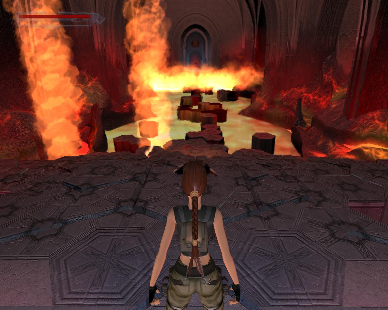 Egy vörösen izzó terembe érkeztél, ahol kis szigetek állnak ki a forró olajból. Belépve lecsapódik mögötted a kapu, majd a körülötte tekergo kígyók szájából láva folyik ki és végigkúszik a padló vájataiban. Lángok csapnak fel mindenütt, és lángcsóvák repkednek a levegoben. Az olajat elérve a láng az egész termen végigfut, csak hogy még forróbb legyen a hangulat. Amikor kissé lecsillapodtak a lángok, indulj el lefelé, ügyelve, hogy bele ne ess a padlón lévo résekbe. Kerülj kissé balra és menj le a terem közepe felé benyúló részhez középtájon. Útközben a padló néhány tömbje a levegobe repül az alóla kilövello láng hatására, vagy éppen az izzó, híg lávába süpped a lépted nyomán. Fuss ki a középen kiugró perem széléhez. Helybol ugorj elore a szemközti padlólapra és sétálj a másik végéhez. Az egyik padlólap eltunik a lábad alatt, és láng csap fel alóla. Fordulj jobbra és szökkenj át átellenben szembe. Lángok kezdenek repkedni a fejed felett. Fordulj balra és újabb szökkenés következik a következo padlórészletre. Ezután jobbra fordulva ugorj tovább. Sétálj elore és ugorj elore a lépcso aljához. Szaladj fel rajt. Mielott beszaladnál a beugróba, amit a lángok övezte fej oriz, vess egy pillantást a jobb oldalra. Két kis perem lebeg a láva felett. A lépcso tetejérol ugorj át az elsore, majd felugorva kapd el a következot és húzódzkodj fel. Egy kapaszkodásos ugrással kapaszkodj meg a kis fülke szélén és mássz fel. Kötszereket és egy doboz sörétet vehetsz fel. Fordulj meg, célozd meg meg a kis peremet, lépj egy lépést hátra és ugorj vissza rá. Innét az alacsonyabb peremet ki is tudod hagyni, mert egy sima ugrást követoen a lépcsokön fogsz landolni. Fuss be a beugróba és vedd el a Tuz Kristályt a tartójáról.