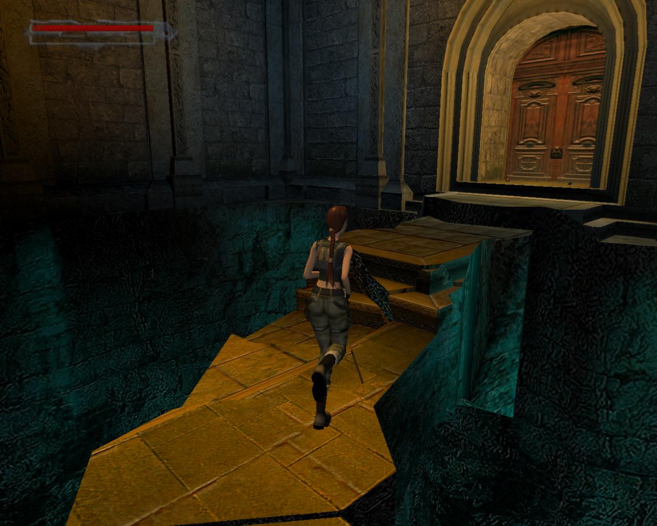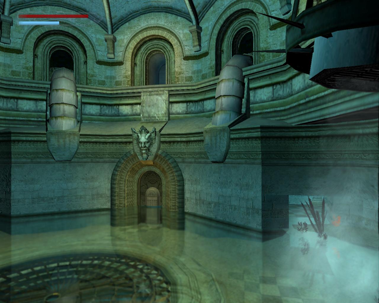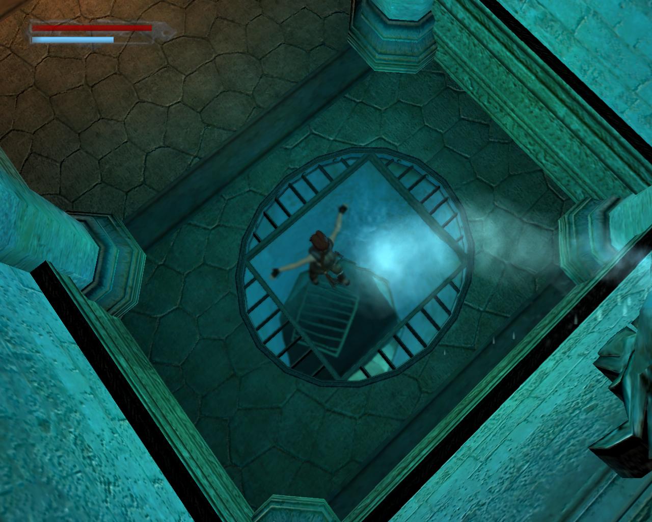 Egy kis terembe vezeto rövid folyosón vagy, aminek a közepén egy még üres medence található. Nincs ido nézelodni, mert egy lángoló kardot forgató lovag már feléd is vetett egy jókora lángcsóvát. A legjobb módszer ellene, ha megpróbálod belelökni az üres medencébe, anélkül, hogy magad is beleesnél. A sörétes puska jó szolgálatot tesz, de kézzel-lábbal is el lehet terelgetni a lovagot. Ha sikerült, két doboz sörétet vehetsz fel a kis terem két sarkából. Ezen az oldalon egy újabb rövid folyosó nyílik, a végén egy vízköpo Neptún-fejjel, aminek a szájából a víz egy kis medencébe hullik. Ugorj bele, és ússz lefelé, át a padlón lévo résen, majd tovább egyenesen. Egy beugróban egy kart figyelhetsz meg, de óvatosan közelíts, mert a bejáratát csapkodó pengék orzik. Ússz át közöttük és húzd meg a kart, ami részben vízzel tölti meg a nagy medencét. Ússz ki innen, vissza a plafonon lévo résen, és fel a felszínre. Mássz ki a medencébol, és menj vissza a kis terembe. Most már biztonságosan beleugorhatsz a nagy medencébe. Fordulj meg. Kimászni nem tudsz, de szemben, a Neptún-fejes ajtótól jobbra be tudsz úszni egy kis résbe balra, ahol újabb kart tudsz meghúzni. A nagy medence vízszintje tovább emelkedik. Ússz ki innét, és fel a felszínre. A rés feletti peremre kimászva ki tudsz menni az ajtón egy vizes csatornába. Balra szaladva loszert találsz a Vector-hoz. Menj vissza a medencéhez. Az óra járásával ellentétesen következo ajtó mögött balra szaladva egy nagy egészségcsomagot vehetsz fel. Az utolsó ajtó egy vizes aknához vezet. Ugorj bele és ússz egyenesen. A rácsos koablakoknál újabb nagy egészségcsomagot találsz. Vedd fel, ússz tovább, amíg még lejjebb nem tudsz tempózni, egy másik aknába. Itt megint egy nagy egészségcsomag lehet a tiéd. Fordulj meg és ússz át a kitört rácson. Itt fel tudsz úszni levegoért. Készülj fel, mert veszélyes úszás fog következni. Végy egy nagy levegot, merülj alá és ússz át a rácson. Maradj a fenék közelében, és ne állj meg egy pillanatra sem. Hamarosan minden oldalról karók kezdenek el döfködni. Ha folyamatosan úszol és lent maradsz, akkor mind a négy karós csapdát el tudod kerülni; legfeljebb az alsó karókat kell kerülgetni, kissé oldalt úszva. Ha sikerült, akkor ússz át a rácson, és tovább úszva az elozo módszerrel kerüld el az utolsó karókat. A következo rácson kiúszva egy elágazáshoz érsz. Jobbra egy tár MV-9 loszert tudsz felvenni, és beúszva a szuk csatornába levegot is tudsz venni. Fordulj meg, bukj alá és egyenesen úszva juss ki a nagy medencébe. Lent egy hatalmas oszlop tetejérol felveheted a Víz Kristályt. A fejed felett lévo rács, ami eddig zárva volt, most kinyílik. Az oszlop szemközti oldalán középtájon van egy kar, ami kinyítja a Neptún-fejes ajtót. Gyorsan ússz fel a nagy medence közepén levegoért. Merülj alá újra és ússz ki a Neptún-fejes ajtón, majd fel a plafonon lévo résen át. Mássz ki a vízbol, és szaladj a szemközti folyosón lévo kijárathoz.