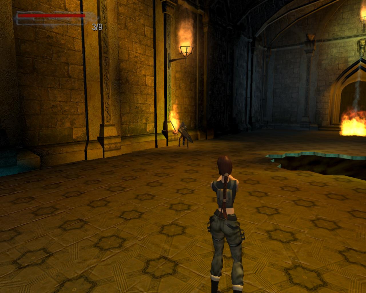 Ebben a pillanatban a kavargó mélységbol kis padlólapok szállnak fel, és egymás mellé rendezodve szilárd talajt képeznek, ahol mejd megvetheted a lábad. A terem közepén egy nagyobb rész azonban hiányzik; beleesve elnyelhet a végtelen mélység. A két oldalán két kar van a falon, amik a bejárati kaput nyitják. Indulj el feléjük. Az új padlóra lépve három nagy láng jelenik meg, amibol három lángoló kardú lovag lép ki. Közelebb érve hozzájuk meg is indulnak feléd, vagy lángcsóvákat szórva csapkodnak a kardjukkal. Ha eltalálnak, akkor Lara ruhája meggyullad. Ez esetben rohanj a két kapu feletti részen fakadt vízek valamelyikéhez és állj alá. A karokat elég nehéz úgy meghúzni, hogy közven a lovagok üldöznek; még akkor is, ha elég messzire csalod oket. Talán az a legjobb megoldás, ha egyenként beletaszítod oket a feneketlen mélységbe, és csak azután foglalkozol a karokkal. A sörétes puska nagy segítség ebben, de ha a perem közelében éred oket, akkor jókora rúgásokkal is elvégezheted a feladatot. Ezután húzd meg a karokat és a kapun átszaladva menj vissza az évszakok csarnokába.