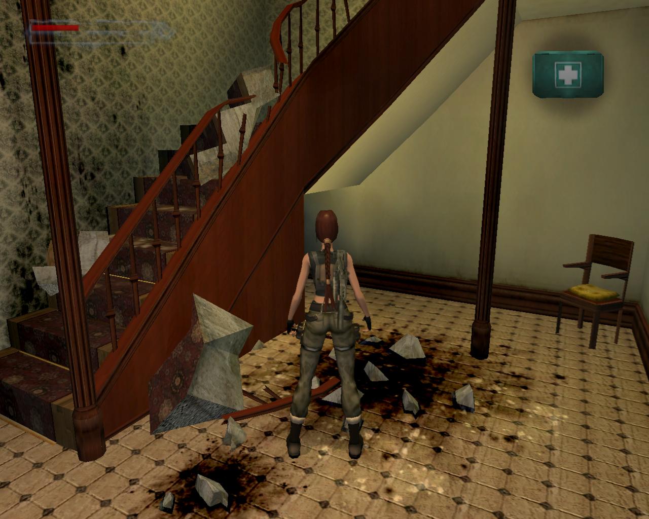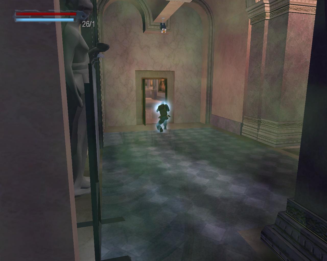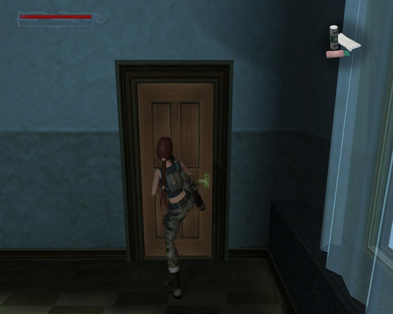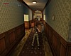 Menj le a lépcson a kitört ablakhoz, és vedd fel a sétapálcát. Kék fénnyel ragyog, Terminátor 2 módra. Egy férfi fog feltunni a könyvespolcok közötti bejáratnál. Elégszer meg kell lonöd, hogy eltunjön. Távozz, és menj végig a folyosón jobbra, a folyosó végéhez. Rúgd be az ajtót, és vedd fel a loszert és az egészségcsomagot. Menj vissza a nyitott ajtóhoz. Vedd fel a loszert. Ezután látni fogod amint valaki gépfegyverrel nyílást vág a falba. Fuss felé és lodd, míg el nem tunik, vagy meg nem hal. Egy gépfegyvert és loszert hagy hátra.