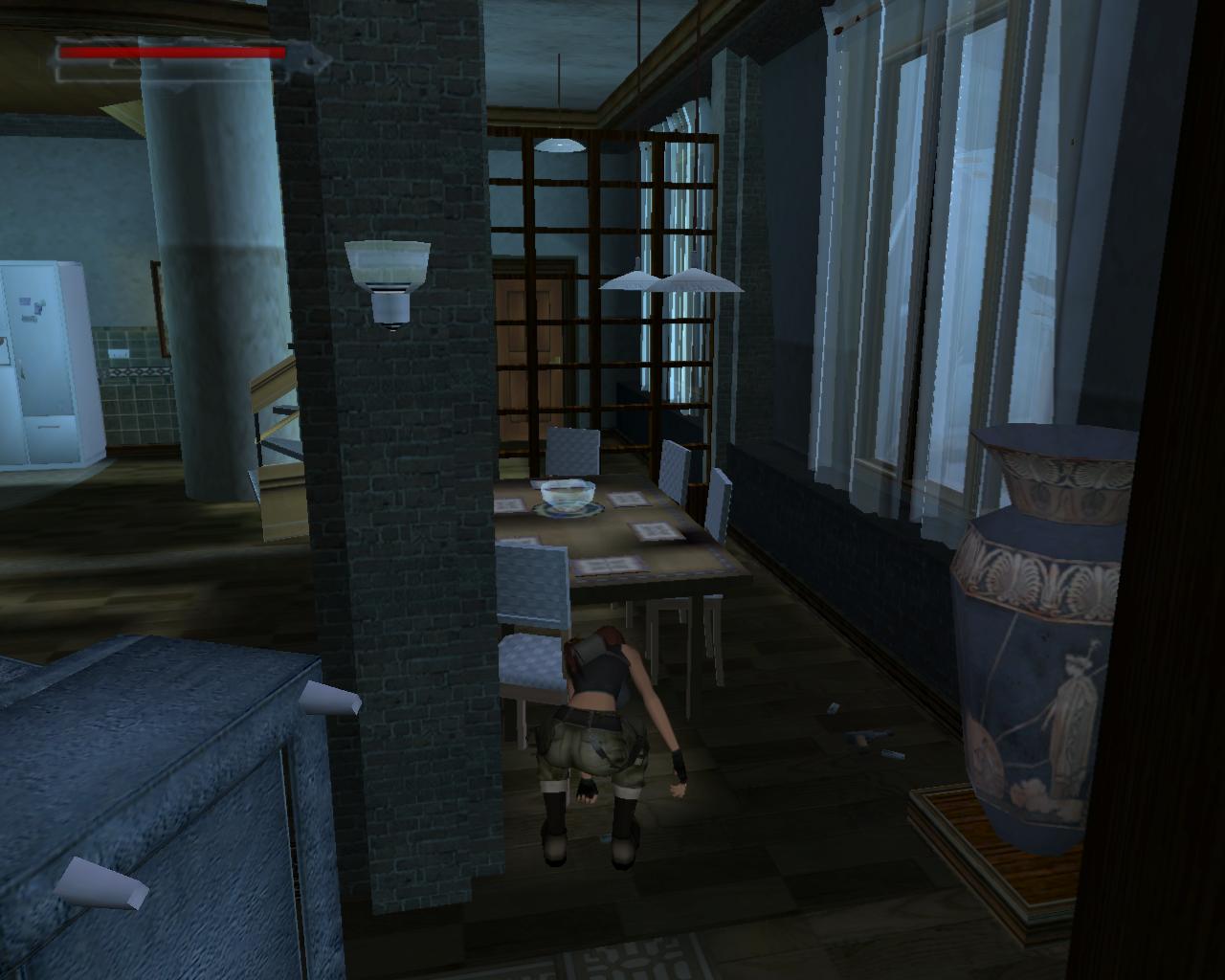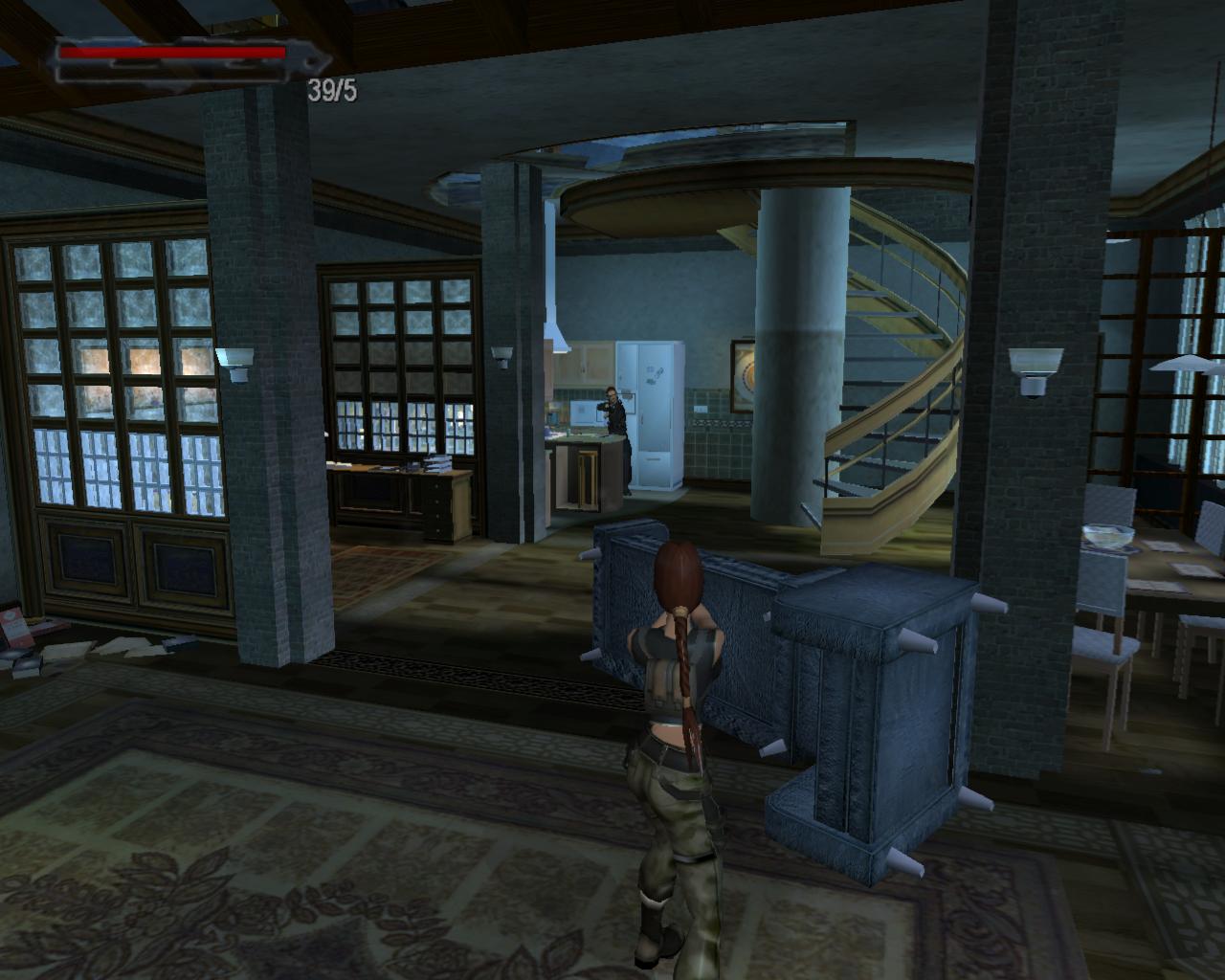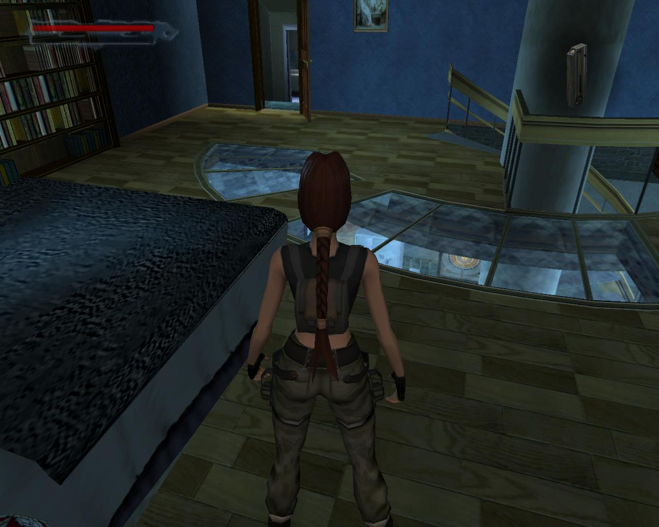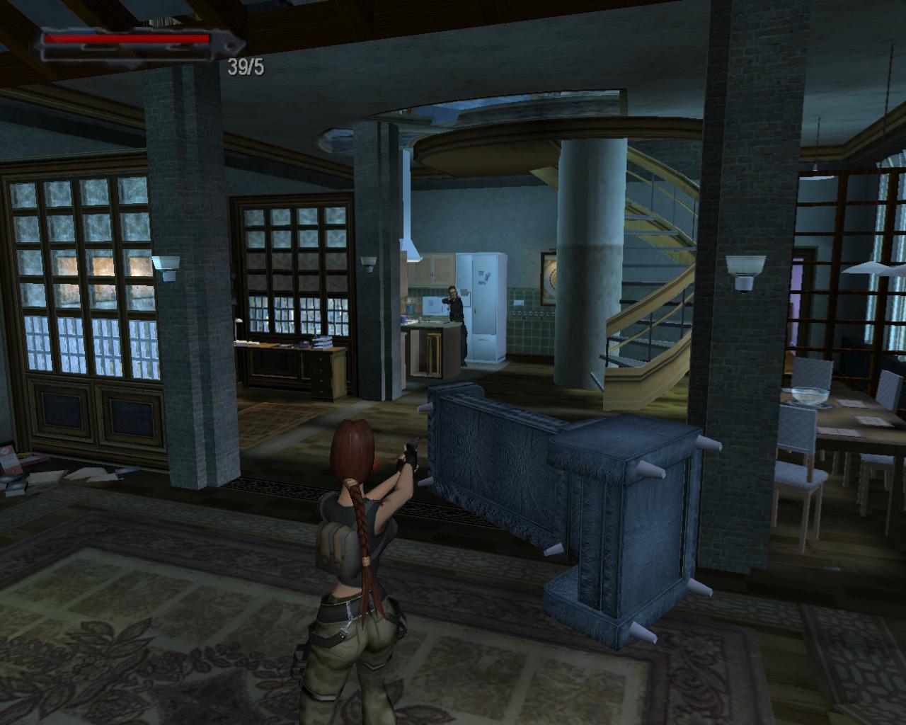 Menj le a lépcson a kitört ablakhoz, és vedd fel a sétapálcát. Kék fénnyel ragyog, Terminátor 2 módra. Egy férfi fog feltunni a könyvespolcok közötti bejáratnál. Elégszer meg kell lonöd, hogy eltunjön. Távozz, és menj végig a folyosón jobbra, a folyosó végéhez. Rúgd be az ajtót, és vedd fel a loszert és az egészségcsomagot. Menj vissza a nyitott ajtóhoz. Vedd fel a loszert. Ezután látni fogod amint valaki gépfegyverrel nyílást vág a falba. Fuss felé és lodd, míg el nem tunik, vagy meg nem hal. Egy gépfegyvert és loszert hagy hátra.