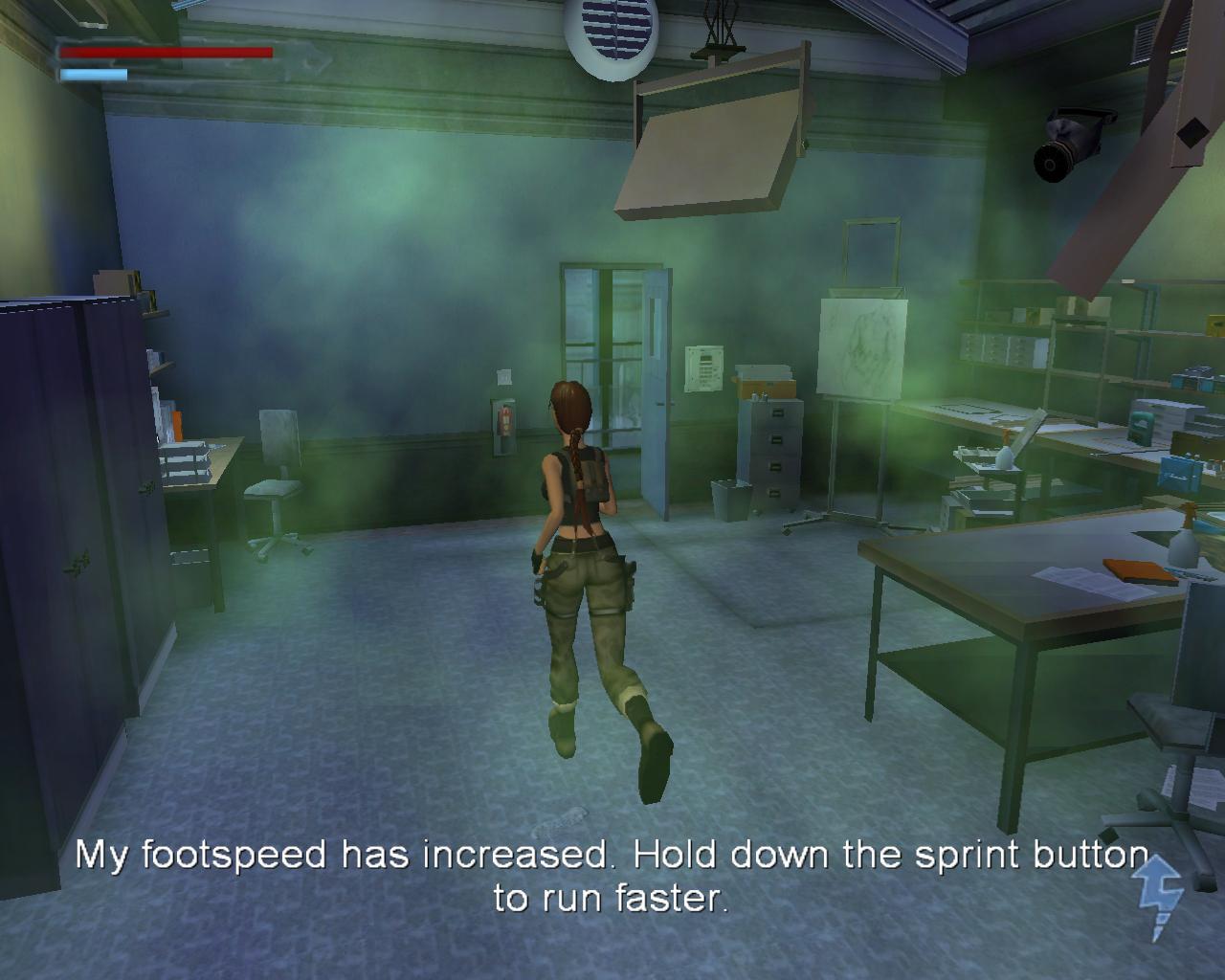Menj tovább felfelé a lépcson, és lodd le a tetején lévo ort. Amikor belépsz az ajtón, egy vágóképet fogsz látni, ahol Lara azt mondja, nem kap levegot, és ami egy képet mutat a gázálarcokról. Még ha nálad is vannak a gázálarcok, vissza kell menned és újra megszerezni oket, mert az erod noni fog, és így már sprintelni is tudsz. Öld meg az ort, és vedd el a gépfegyverét. Ha már megszerezted a gázálarcokat, egyenesen is mehetsz. Ha nem, fordulj balra, menj át az ajtókon, és végig a termen. A terem végén van egy or. Öld meg, és vedd fel a tölténytárat. Menj ki az ajtón, és balra, be a nyitott ajtón, a lépcsoházhoz. Menj fel a lépcson. Lépj be a folyosóra, és öld meg a különleges egység egyik tagját. Nála nincs semmi, úgyhogy mellozd az átkutatását, és menj az elso ajtóhoz jobbra. Menj át az üvegajtókon, és keresd meg a szekrényt jobboldalt. Nyisd ki az ajtaját, erosödj meg, hogy sprintelni is tudj, és tégy el annyi gázálarcot, amennyit Lara el tud venni. (Azt hiszem, egyszerre csak három lehet nála). Menj vissza le a lépcson. A lépcsoházon kívül két or van. Mi a sokkolót használtuk ellenük, és ez nagyszeruen muködött. Menj a baloldali ajtóhoz, ami fölött a lámpa van.