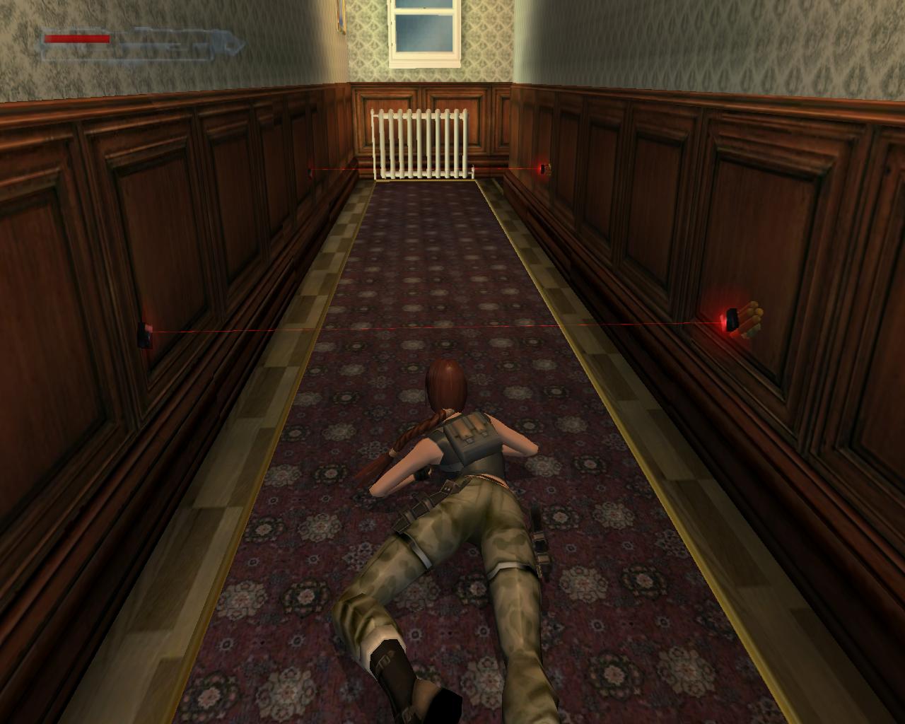 Menj ki a folyosóra. Hogy átjuss a lézereken jobbra, végezz katonai kúszást. Nyomd meg a Guggolás-gombot, majd a Lopakodást, és használd a nyílbillentyut az eloremozgáshoz. A folyosó végénél egy vágókép mutatja meg a bombákat.